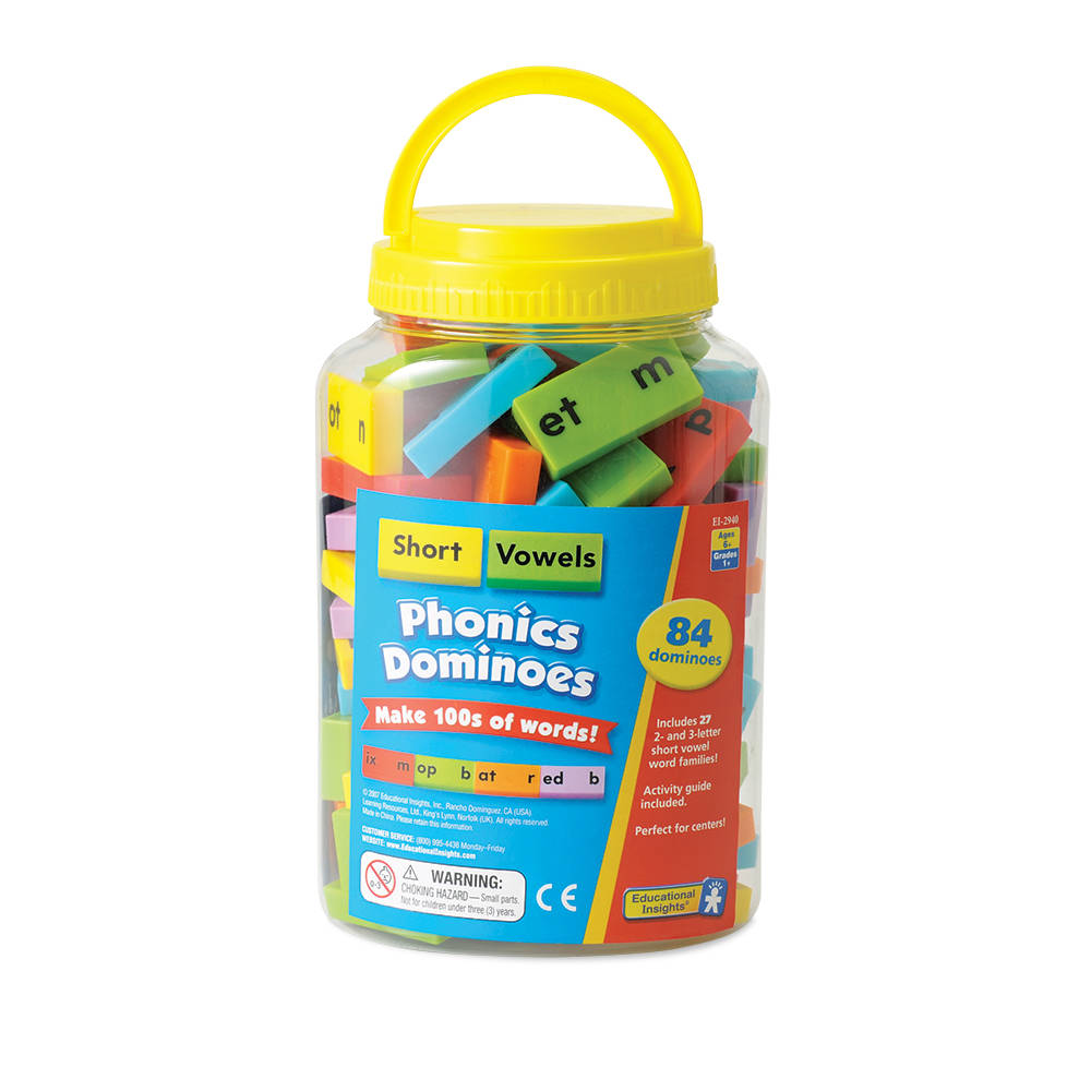 SKU H2M-90372 Product Title DOMINOES, SHORT VOWEL PHONICS S/84 Brand Name Educational Insights Piece Count 0 Min Target Age 6 Max Target Age 9.9 TargetGradeMax Fourth Grade TargetGradeMin First Grade ProductCategoryProductLine Other/Miscellaneous ProductCategoryProductType Game ProductCategorySubject ELA/Literacy Country of Origin IND Unit Height 6.9 Unit Length 4.8 Unit Weight 0.7 Unit Width 3.8 CA prop 65 No Case Height 8.2 Case Length 11.5 Case Quantity 6 Case Weight 6.75 CPQ 0.54 Includes Remote No Marble Warning No MSRP 27.99 Small Ball Warning No Small Parts Warning Yes