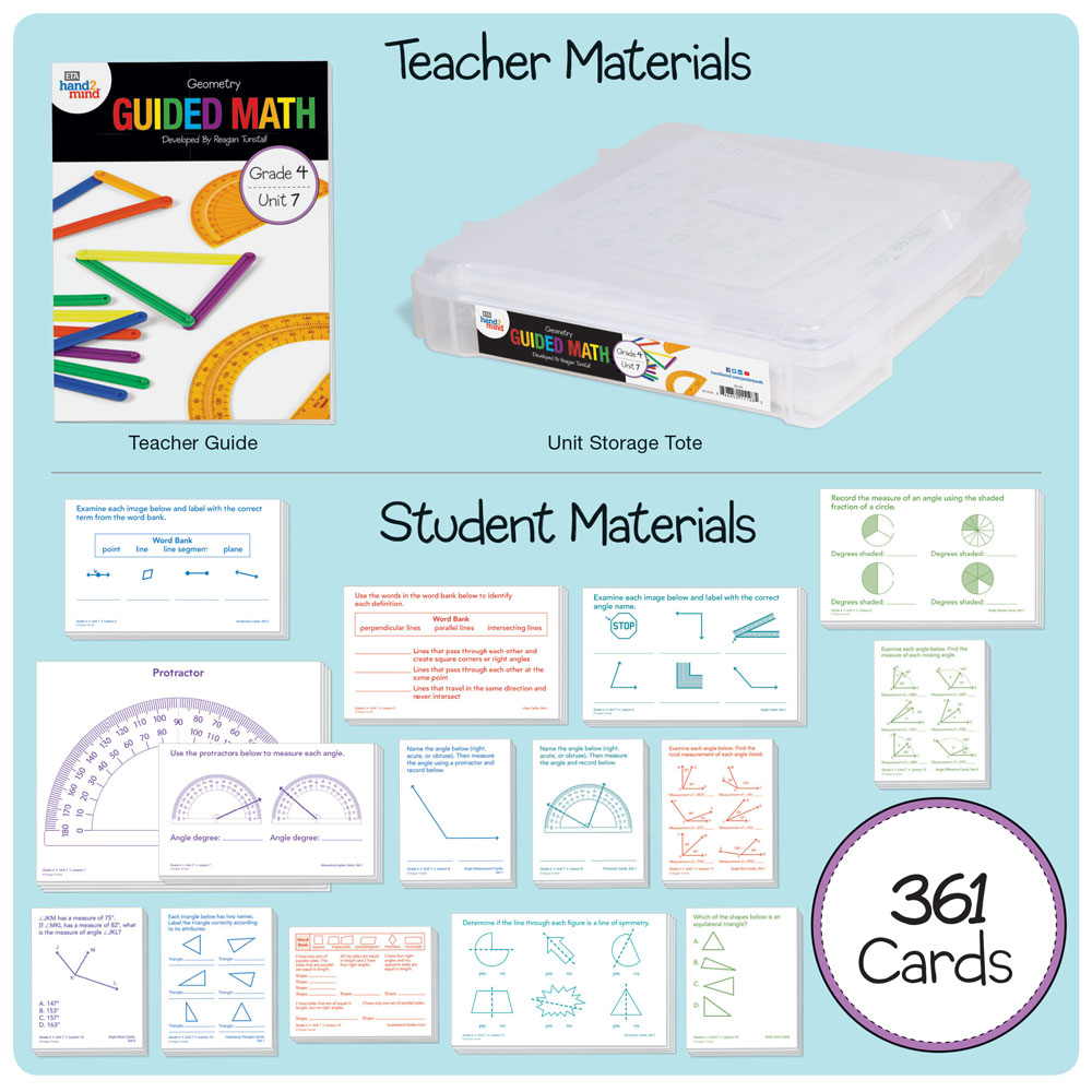 SKU H2M-91147 Product Title GUIDED MATH KIT, GEOMETRY G4U7 Brand Name hand2mind UPC 848850111985 Piece Count 0 Min Target Age 9 Max Target Age 9.9 TargetGradeMax Fourth Grade TargetGradeMin Fourth Grade ProductCategoryProductLine Guided Math ProductCategoryProductType Instruction - Small Group ProductCategorySubject Math Country of Origin USA Unit Height 3.75 Unit Length 16.375 Unit Weight 6.78 Unit Width 14.437 CA prop 65 No Case Height 3.75 Case Length 16.375 Case Quantity 1 Case Weight 6.78 CPQ 0.51 Includes Remote No Marble Warning No MSRP 124.99 Small Ball Warning No Small Parts Warning No