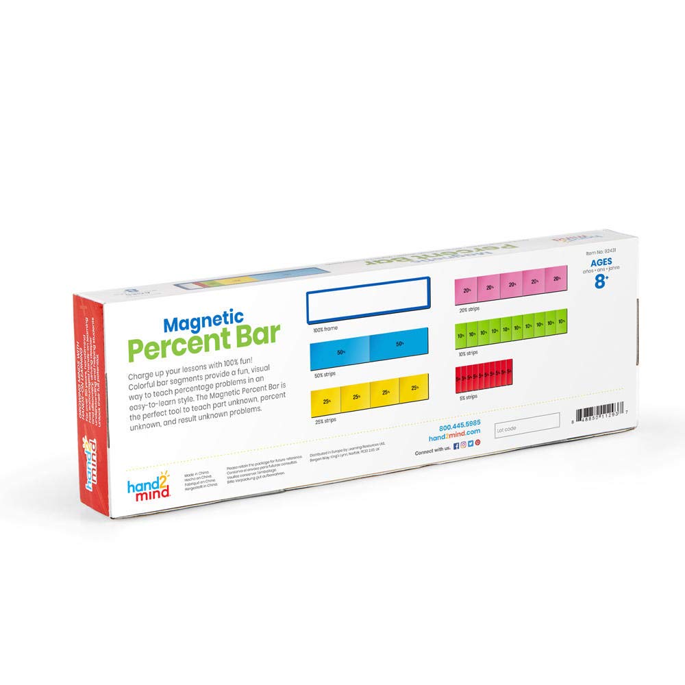 SKU H2M-92431 Product Title PERCENT BAR, MAGNETIC DEMO Brand Name hand2mind UPC 848850112937 Piece Count 0 Min Target Age 8 Max Target Age 15.9 TargetGradeMax Tenth Grade TargetGradeMin Third Grade ProductCategoryProductLine Other/Miscellaneous ProductCategoryProductType Manipulative - Demonstration ProductCategorySubject Math Port of Exit CNYTN Country of Origin CHN Unit Height 1.6 Unit Length 13.1 Unit Weight 1.25 Unit Width 4.5 CA prop 65 No Case Height 7.4 Case Length 14.3 Case Quantity 12 Case Weight 16.25 CPQ 0.85 Includes Remote No Marble Warning No MSRP 26.99 Small Ball Warning No Small Parts Warning No