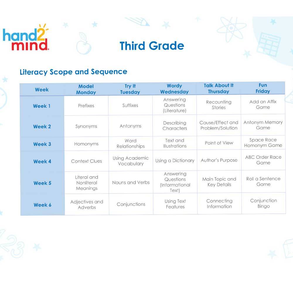 SKU H2M-93773 Product Title LEARNING AT HOME LITERACY KIT GR 3 Brand Name hand2mind UPC 848850115709 Piece Count 50 Min Target Age 8 Max Target Age 8.9 TargetGradeMax Third Grade TargetGradeMin Third Grade ProductCategoryProductLine Learning at Home ProductCategoryProductType Instruction - Individual/Student ProductCategorySubject ELA/Literacy Country of Origin USA Unit Height 1.5 Unit Length 12.6 Unit Weight 1.2 Unit Width 11.5 CA prop 65 No Case Height 12 Case Length 24 Case Quantity 20 Case Weight 25 CPQ 3 Includes Remote No Marble Warning No MSRP 36.99 Small Ball Warning No Small Parts Warning No