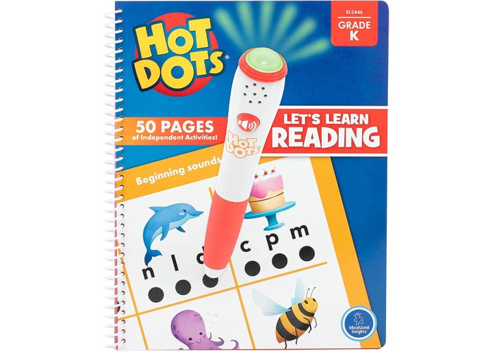 SKU H2M-95303 Product Title HOT DOTS LET'S LEARN READING, KINDER Brand Name Educational Insights Piece Count 2 Min Target Age 0 Max Target Age 0 TargetGradeMax No Grade TargetGradeMin No Grade ProductCategoryProductLine Other/Miscellaneous ProductCategoryProductType Educational Toy ProductCategorySubject ELA/Literacy Country of Origin CHN Unit Height 1.5 Unit Length 11.5 Unit Weight 1.25 Unit Width 10.5 CA prop 65 No Case Height 11.2 Case Length 12.1 Case Quantity 1 Case Weight 8.4 CPQ 0.78 Includes Remote No Marble Warning No MSRP 27.99 Small Ball Warning No Small Parts Warning No