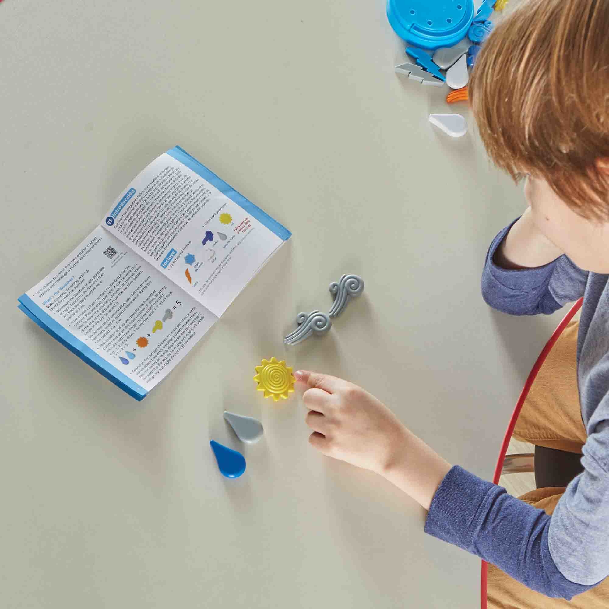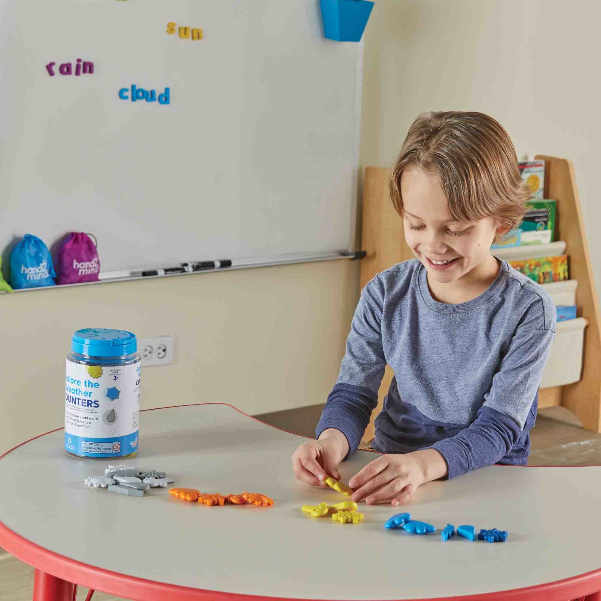 SKU H2M-96147 Product Title Explore the Weather Counters Brand Name hand2mind UPC 848850120314 Piece Count 72 Min Target Age 3 Max Target Age 8 TargetGradeMax Third Grade TargetGradeMin Pre-K ProductCategoryProductLine Other Counters ProductCategoryProductType Manipulative - Small Group or Center ProductCategorySubject Math Port of Exit CNYTN Country of Origin CHN Unit Height 6.4 Unit Length 3.9 Unit Weight 1.4 Unit Width 3.9 Short Description - DC The sky’s the limit with these colorful counters! This engaging counter set is complete with fun and familiar shapes like clouds, raindrops, and lightning bolts. These durable manipulatives feature six fun weather pattern shapes in six different colors, with varied textures to keep young learners engaged. Children will count, sort, pattern, and more—identifying familiar weather patterns and discovering those they may not have experienced. Activity Guide includes weather facts and early math activities. Perfect for math and science time and sensory bins or trays, these versatile counters offer endless ways to learn through hands-on play! Long Description - DC The sky’s the limit with these colorful counters! This engaging counter set is complete with fun and familiar shapes like clouds, raindrops, and lightning bolts. These durable manipulatives feature six fun weather pattern shapes in six different colors, with varied textures to keep young learners engaged. Children will count, sort, pattern, and more—identifying familiar weather patterns and discovering those they may not have experienced. Activity Guide includes weather facts and early math activities. Perfect for math and science time and sensory bins or trays, these versatile counters offer endless ways to learn through hands-on play! For over 55 years, hand2mind has encouraged hands-on learning and discovery, driving deeper understanding and helping children unlock their full potential. hand2mind specializes in math manipulatives designed to help students learn by doing. We supply Math Counters, Rekenreks, Abacus, Counting Cubes and more to help little ones go from counting to 10, 20 and beyond! From early math to middle school math, hand2mind has you covered with products designed to enhance learning in the classroom and the world around us. Through hands-on exploration and discovery we strive to find new ways to encourage students in math practice, literacy activities, STEM education and more! CA prop 65 No Case Height 8.2 Case Length 16.7 Case Quantity 8 Case Weight 12.8 CPQ 0.7 Includes Remote No Marble Warning No MSRP 21.99 Small Ball Warning No Small Parts Warning Yes