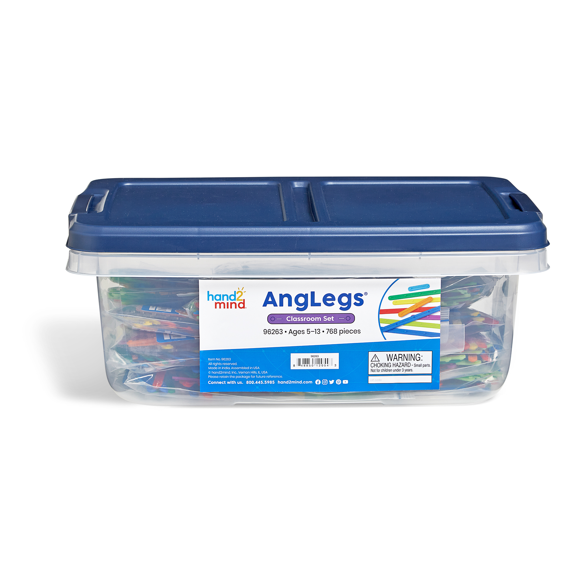 SKU H2M-96263 Product Title AngLegs® Classroom Set Brand Name hand2mind UPC 848850120543 Piece Count 768 Min Target Age 5 Max Target Age 13 TargetGradeMax Eighth Grade TargetGradeMin Kindergarten ProductCategoryProductLine Anglegs ProductCategoryProductType Manipulative - Bulk or Classroom ProductCategorySubject Math Country of Origin USA Unit Height 6.69 Unit Length 16.94 Unit Weight 6.7 Unit Width 12.13 Short Description - DC Unlock the power of AngLegs for the classroom! AngLegs are easy-to-manipulate, adjustable strips of varying lengths that help students explore shapes, angles, plane geometry, area, and more! Simple snap the AngLegs together to create polygons of all shapes and sizes. 8 lengths and 8 colors allow students to explore a variety of geometric concepts. This guided set includes 15 double-sided, grade-banded, standards-aligned activity cards. Practice geometry and measurement with your whole classroom! This engaging set includes enough materials for 15 students! Includes 720 AngLeg Pieces, 15 Snap-on 180-degree Protractors, 15 Snap-on 360-degree Protractors, 15 Double-sided Activity Cards, and a Reusable Storage Tote. Long Description - DC Unlock the power of AngLegs for the classroom! AngLegs are easy-to-manipulate, adjustable strips of varying lengths that help students explore shapes, angles, plane geometry, area, and more! Simple snap the AngLegs together to create polygons of all shapes and sizes. 8 lengths and 8 colors allow students to explore a variety of geometric concepts. This guided set includes 15 double-sided, grade-banded, standards-aligned activity cards. Practice geometry and measurement with your whole classroom! This engaging set includes enough materials for 15 students! Includes 720 AngLeg Pieces, 15 Snap-on 180-degree Protractors, 15 Snap-on 360-degree Protractors, 15 Double-sided Activity Cards, and a Reusable Storage Tote. For over 50 years, hand2mind has encouraged hands-on learning and discovery, driving deeper understanding and helping children unlock their full potential. hand2mind specializes in math manipulatives designed to help students learn by doing. Particularly with learning shapes, hand2mind has you set with geometry sets, compasses for geometry, protractors, rulers and all necessary school supplies. From early math to middle school math, hand2mind has you covered with products designed to enhance learning in the classroom and the world around us. Through hands-on exploration and discovery, we strive to find new ways to encourage students in math practice, literacy activities, STEM education and more! CA prop 65 No Case Height 6.69 Case Length 16.94 Case Quantity 1 Case Weight 6.7 CPQ 0.8 Includes Remote No Marble Warning No MSRP 129.99 Small Ball Warning No Small Parts Warning No
