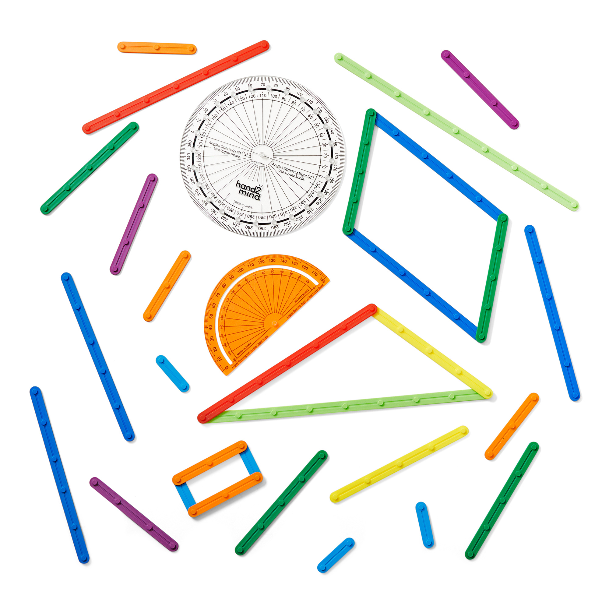 SKU H2M-96862 Product Title AngLegs® Starter Set Brand Name hand2mind UPC 848850120772 Piece Count 50 Min Target Age 5 Max Target Age 13 TargetGradeMax Eighth Grade TargetGradeMin Kindergarten ProductCategoryProductLine Anglegs ProductCategoryProductType Manipulative - Individual/Student ProductCategorySubject Math Port of Exit INNXV Country of Origin IND Unit Height 0.45 Unit Length 10 Unit Weight 0.25 Unit Width 7.4 Short Description - DC Introducing our all-new AngLegs set! AngLegs are easy-to-manipulate, adjustable strips of varying lengths that help students explore shapes, angles, plane geometry, area, and more! Simply snap the AngLegs together to create polygons of all shapes and sizes. AngLegs come in 8 lengths and 8 colors to explore a variety of geometric concepts. This engaging set includes enough materials for one student. Includes 48 AngLeg Pieces (6 each in 8 different lengths), 1 Snap-on 360-degree Protractor, 1 Snap-on 180-degree Protractor, and 1 Reusable Storage Bag. Long Description - DC Introducing our all-new AngLegs set! AngLegs are easy-to-manipulate, adjustable strips of varying lengths that help students explore shapes, angles, plane geometry, area, and more! Simply snap the AngLegs together to create polygons of all shapes and sizes. AngLegs come in 8 lengths and 8 colors to explore a variety of geometric concepts. This engaging set includes enough materials for one student. Includes 48 AngLeg Pieces (6 each in 8 different lengths), 1 Snap-on 360-degree Protractor, 1 Snap-on 180-degree Protractor, and 1 Reusable Storage Bag. For over 50 years, hand2mind has encouraged hands-on learning and discovery, driving deeper understanding and helping children unlock their full potential. hand2mind specializes in math manipulatives designed to help students learn by doing. Particularly with learning shapes, hand2mind has you set with geometry sets, compasses for geometry, protractors, rulers and all necessary school supplies. From early math to middle school math, hand2mind has you covered with products designed to enhance learning in the classroom and the world around us. Through hands-on exploration and discovery, we strive to find new ways to encourage students in math practice, literacy activities, STEM education and more! CA prop 65 No Case Height 10 Case Length 21.2 Case Quantity 120 Case Weight 34.13 CPQ 2.32 Includes Remote No Marble Warning No MSRP 9.99 Small Ball Warning No Small Parts Warning Yes