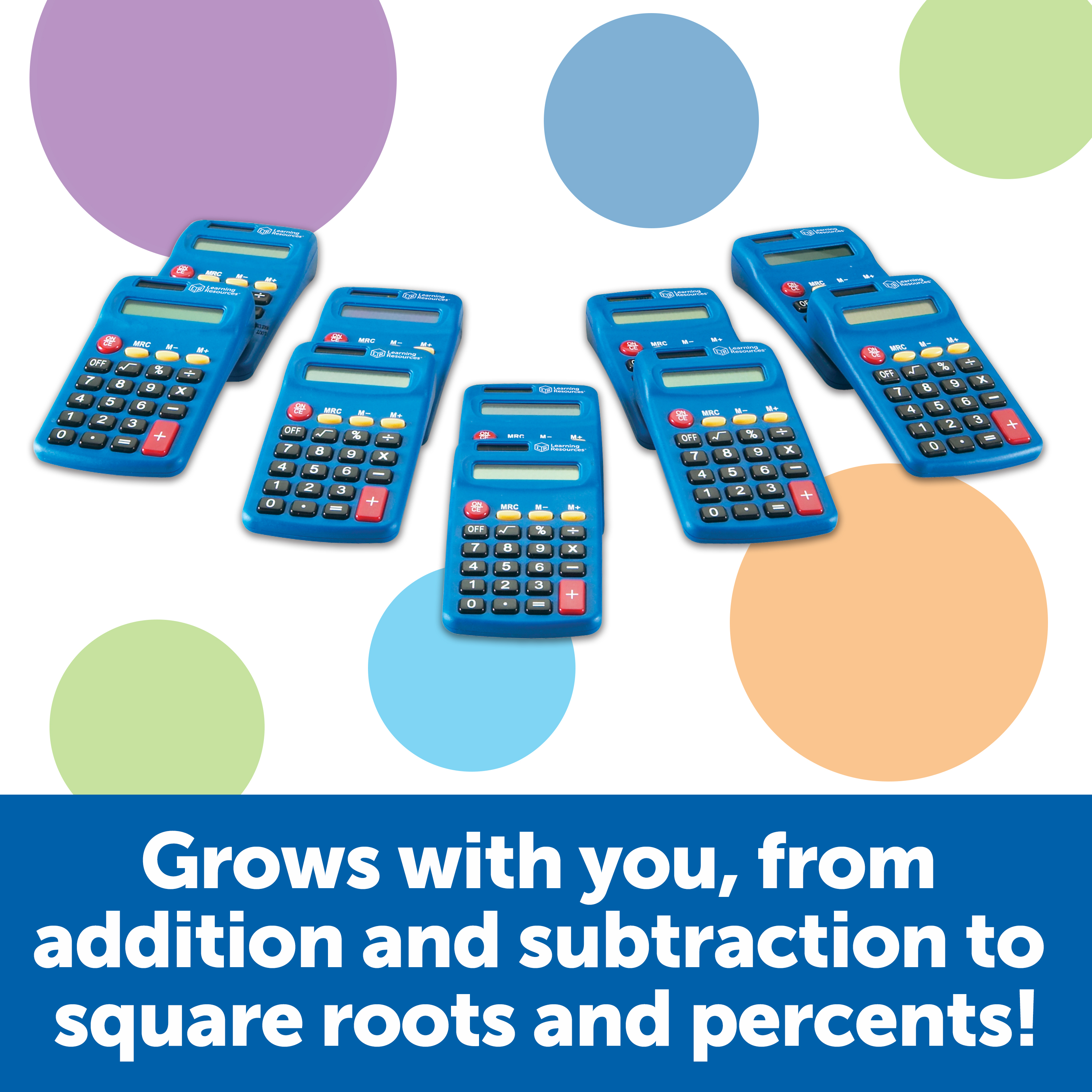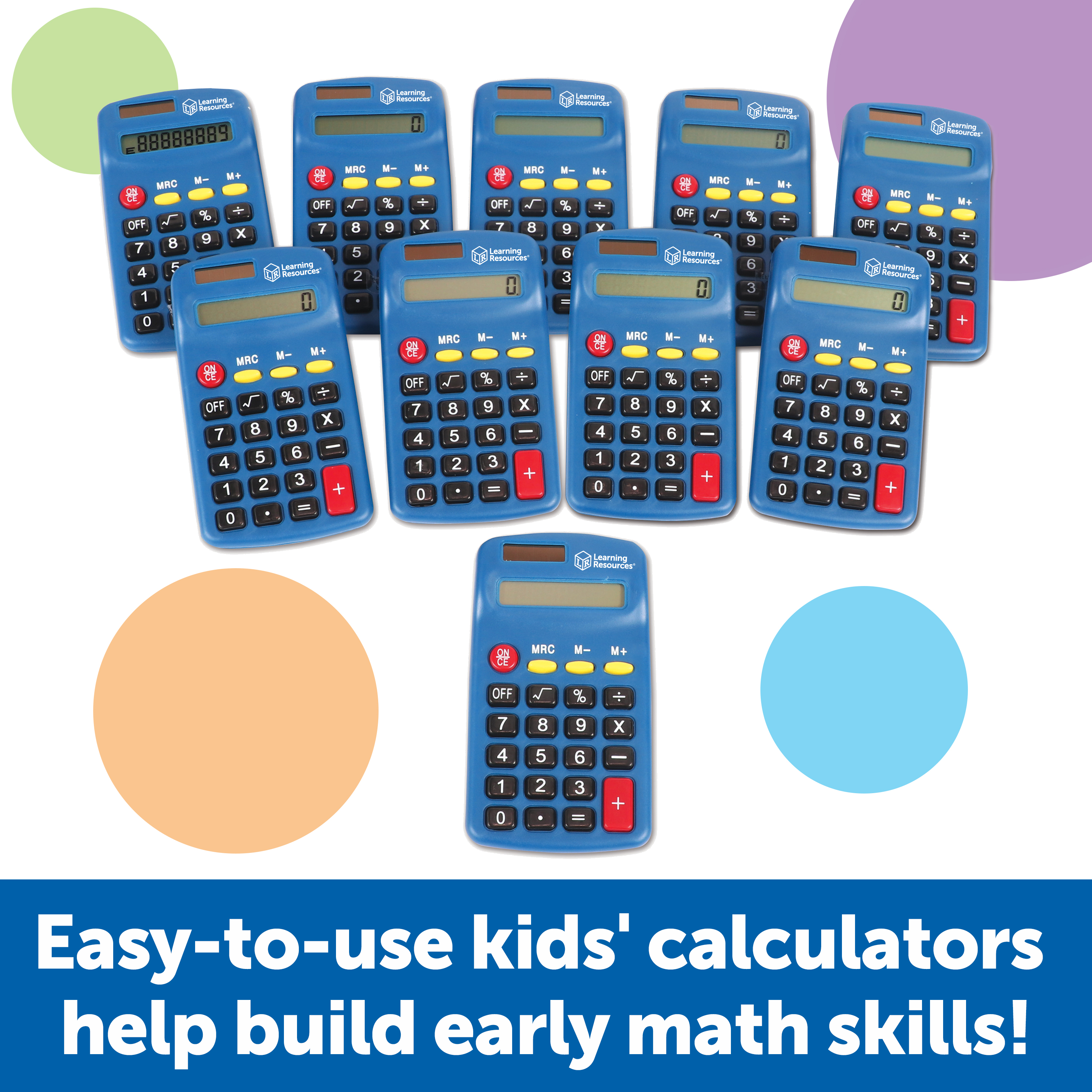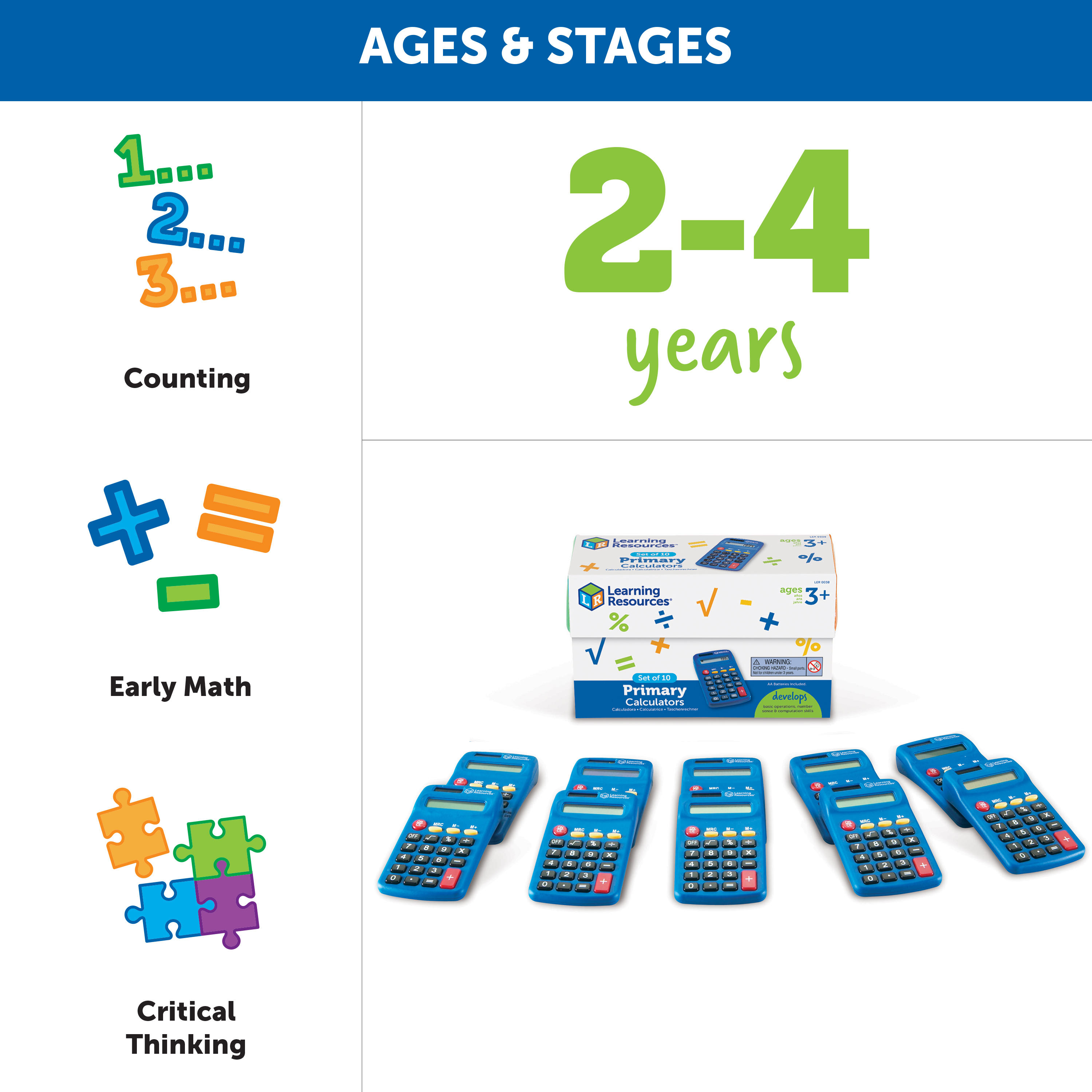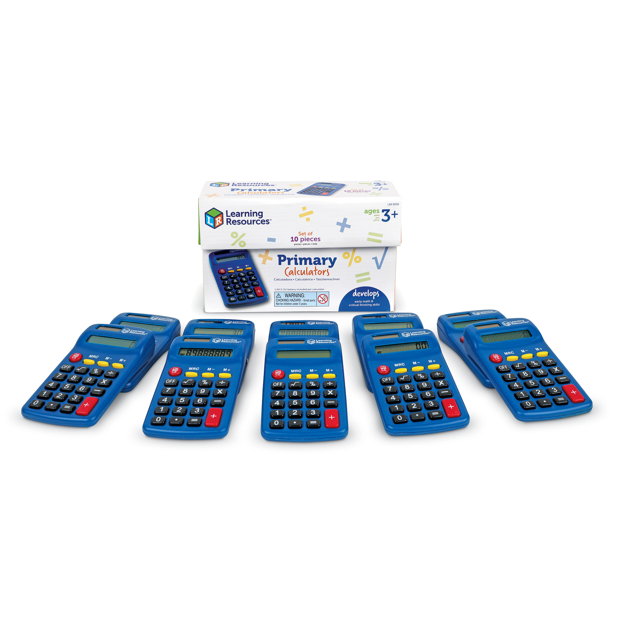 SKU LER0038 Product Title L.R. PRIMARY CALCULATOR (SET/10) Brand Name Learning Resources UPC 765023800388 Piece Count 0 Min Target Age 3 Max Target Age 7 TargetGradeMax Second Grade TargetGradeMin Toddler ProductCategorySubject Math Port of Exit CNYTN Country of Origin CHN Unit Height 2.7 Unit Length 4.8 Unit Weight 1.5 Unit Width 7.7 Long Description - DC Teach basic calculator and math skills with this simple to use Primary Calculator. Students can start with basic math operations and work their way up to more advanced concepts such as percent and square roots. Perfect for independent math practice. The Learning Resources Primary Calculator - Set of 10 Features: A bright blue calculator that is both solar and battery powered Batteries Needed Yes Battery Count 1 Battery Material Alkaline Battery Type AA CA prop 65 No Case Height 10.5 Case Length 19.1 Case Quantity 24 Case Weight 39.15 CPQ 1.9 Includes Remote No Marble Warning No MSRP 62.99 Power Source Batteries Small Ball Warning No Small Parts Warning Yes
