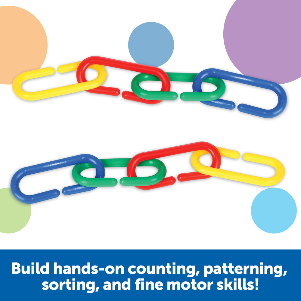 SKU LER0257 Product Title LINK 'N' LEARN LINKS (BKT/500) Brand Name Learning Resources UPC 765023001846 Min Target Age 3 Max Target Age 7 TargetGradeMax Second Grade TargetGradeMin Toddler ProductCategorySubject Math Port of Exit CNYTN Country of Origin CHN Unit Height 6.5 Unit Length 6.25 Unit Weight 1.3 Unit Width 6.25 Long Description - DC Kids will learn counting, patterning, and sorting while making necklaces or engaging in other creative play. Pliable links are easy for young children and students with special needs to connect and separate. Learning Resources Link 'N' Learn Rainbow Links, 500 Pieces 500 pliable plastic links in 6 colors Links that measure 1 5/8"L x 3/4"H each Storage bucket Activity Guide CA prop 65 No Case Height 16 Case Length 18.2 Case Quantity 12 Case Weight 16.8 CPQ 2.12 Includes Remote No Marble Warning No MSRP 24.99 Small Ball Warning No Small Parts Warning Yes