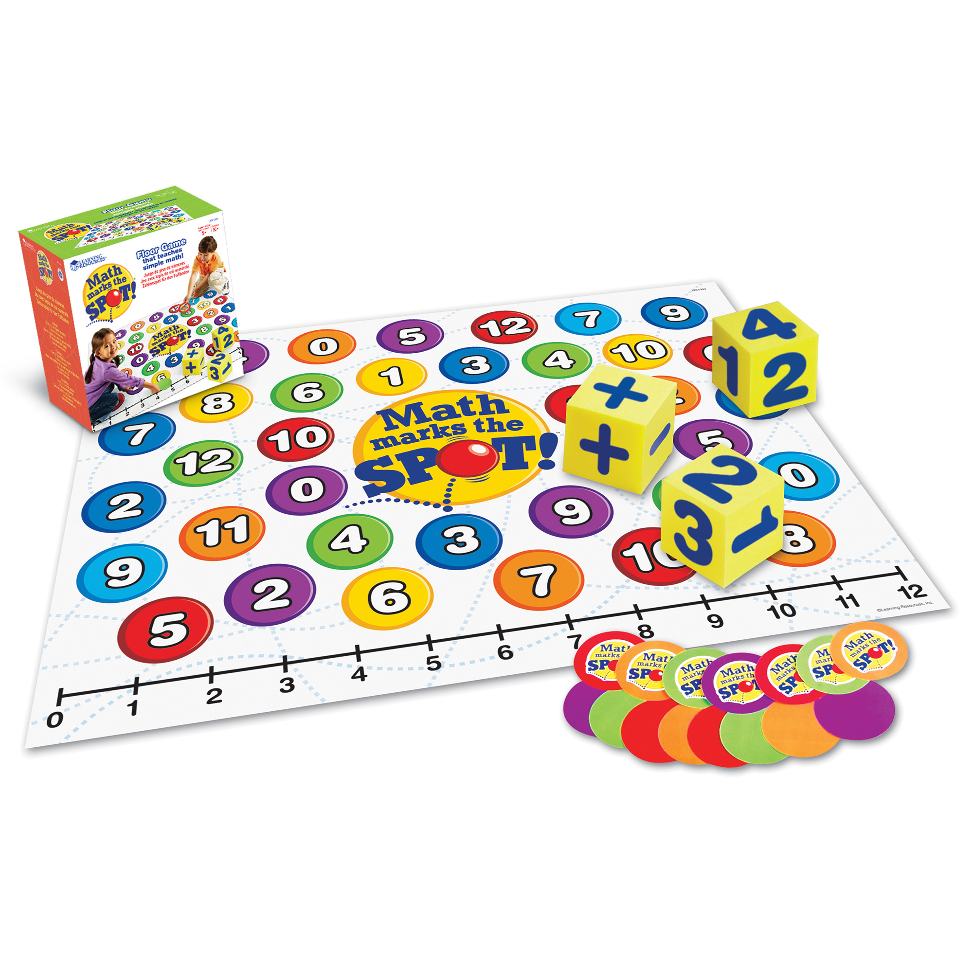 SKU LER0383 Product Title MATH MARKS THE SPOT Brand Name Learning Resources UPC 765023803839 Piece Count 32 Min Target Age 5 Max Target Age 9 TargetGradeMax Fourth Grade TargetGradeMin Kindergarten ProductCategorySubject Math Port of Exit CNYTN Country of Origin CHN Unit Height 6 Unit Length 10.5 Unit Weight 1.95 Unit Width 10.4 Long Description - DC Roll soft foam number and operations cubes for fun in this educational children's Math Marks the Spot Floor Game. Your students can race to find the answer on the oversize number mat. Designed for younger students, this is the ideal choice for drawing in and catching the attention of children who dislike or have trouble with math. Your pupils can place their game markers on the answer or touch the answer for greater tactile-kinesthetic learning. This provides a well-rounded experience that touches on several different learning styles for best integration of skills. The durable vinyl mat included with this math kids game features all the answers to addition and subtraction problems that use numbers 1 through 6. It comes with two 5" number cubes, a single operation cube, and 28 different cardboard markers. As a teacher or parent, you are sure to appreciate that this kids educational game comes with an activity guide. Ages 5+ CA prop 65 No Case Height 11.5 Case Length 12.7 Case Quantity 4 Case Weight 10.1 CPQ 1.82 Includes Remote No Marble Warning No MSRP 45.99 Small Ball Warning No Small Parts Warning No