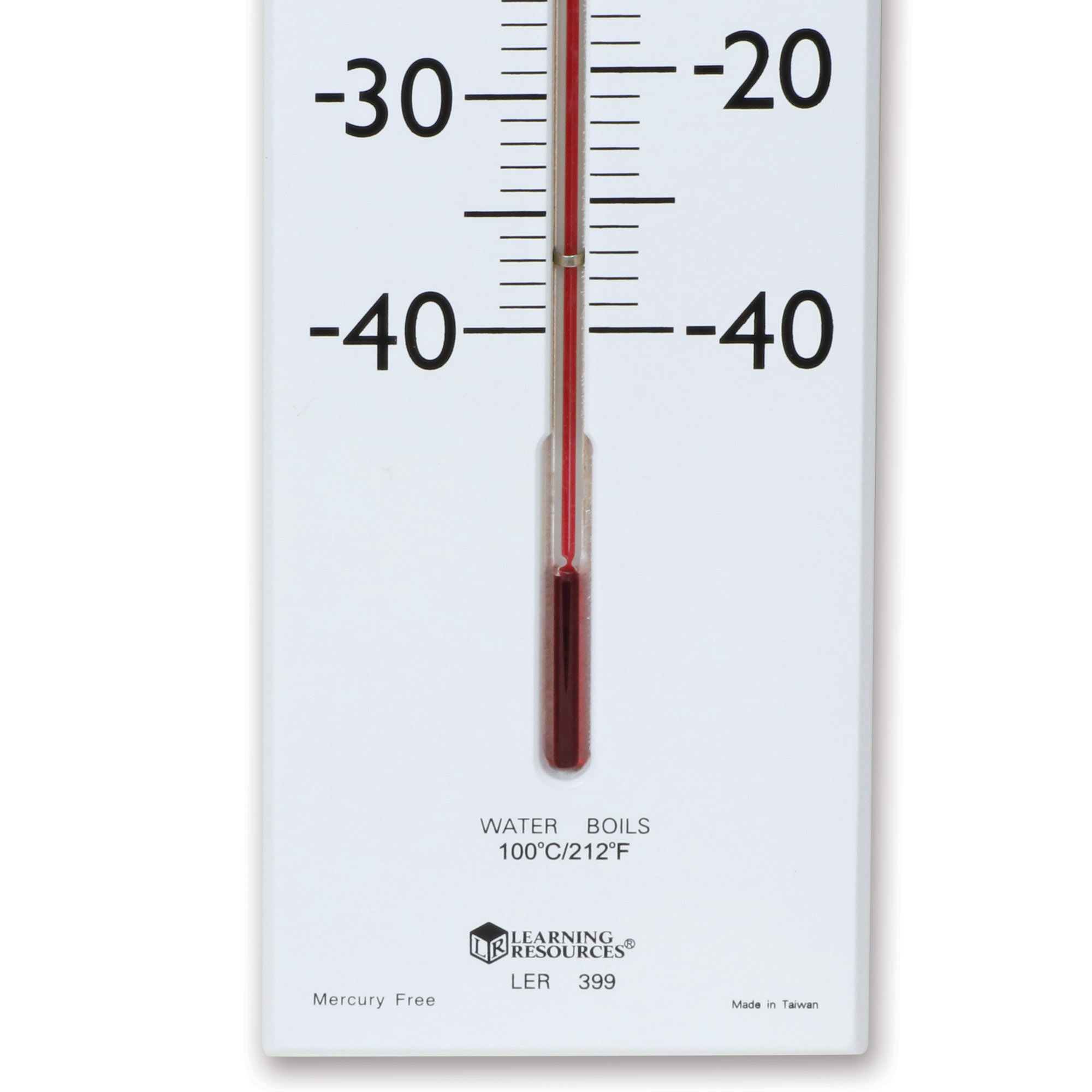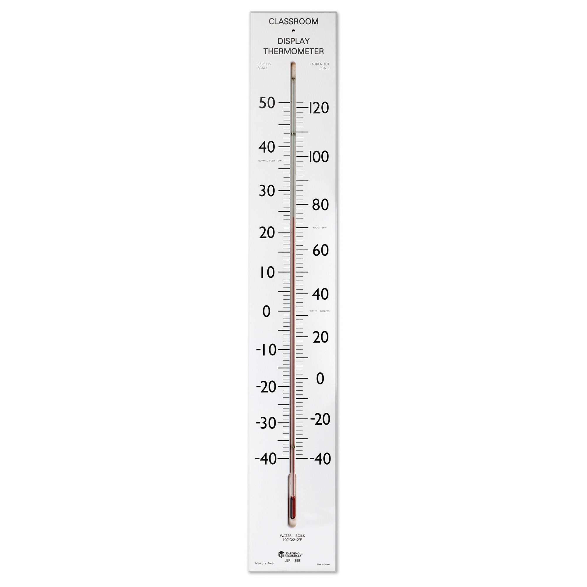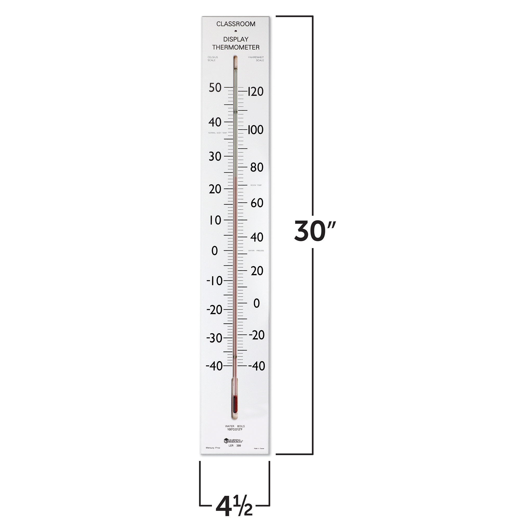 SKU LER0399 Product Title GIANT CLASSROOM THERMOMETER Brand Name Learning Resources UPC 765023002638 Piece Count 1 Min Target Age 5 Max Target Age 9 TargetGradeMax Fourth Grade TargetGradeMin Kindergarten ProductCategorySubject Science/STEM Port of Exit TWKEL Country of Origin TWN Unit Height 0.5 Unit Length 30 Unit Weight 2.06 Unit Width 5 Long Description - DC Help make the connection between science and everyday life with this dramatic, over-sized thermometer the whole class can see! This 30" wall-mounted thermometer has a 23" tube recessed into the sturdy wooden base. Shows both Fahrenheit and Celsius, from -40° to 50°C and -40°F to 120°F. Supports a host of math and science activities. Great for science fairs! CA prop 65 Yes Case Height 5 Case Length 10.5 Case Quantity 12 Case Weight 27 CPQ 0.93 Includes Remote No Marble Warning No MSRP 39.99 Small Ball Warning No Small Parts Warning No