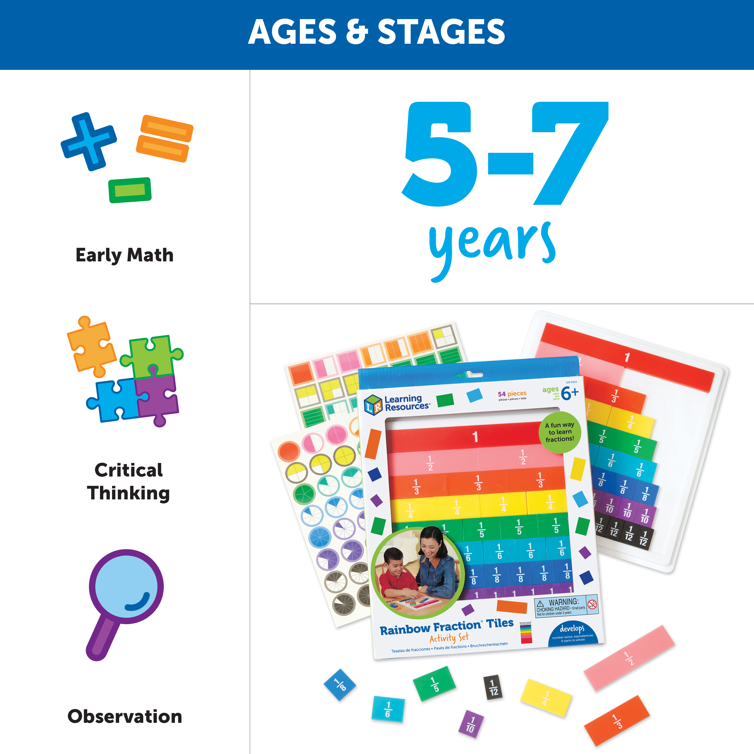 SKU LER0615 Product Title RAINBOW FRACTION TILES W/TRAY Brand Name Learning Resources UPC 765023003550 Piece Count 53 Min Target Age 6 Max Target Age 10 TargetGradeMax Fifth Grade TargetGradeMin First Grade ProductCategorySubject Math Port of Exit CNYTN Country of Origin CHN Unit Height 0.8 Unit Length 12.5 Unit Weight 1.05 Unit Width 9.9 Long Description - DC Explore fraction concepts and parts of a whole in a visual and hands-on way. Color-coded pieces represent 1 whole, halves, thirds, fourths, fifths, sixths, eighths, tenths and twelfths. Includes plastic tray and activity guide. Perfect for students ages 6 years and up. CA prop 65 No Case Height 14 Case Length 23 Case Quantity 24 Case Weight 29.9 CPQ 1.86 Includes Remote No Marble Warning No MSRP 15.99 Small Ball Warning No Small Parts Warning Yes