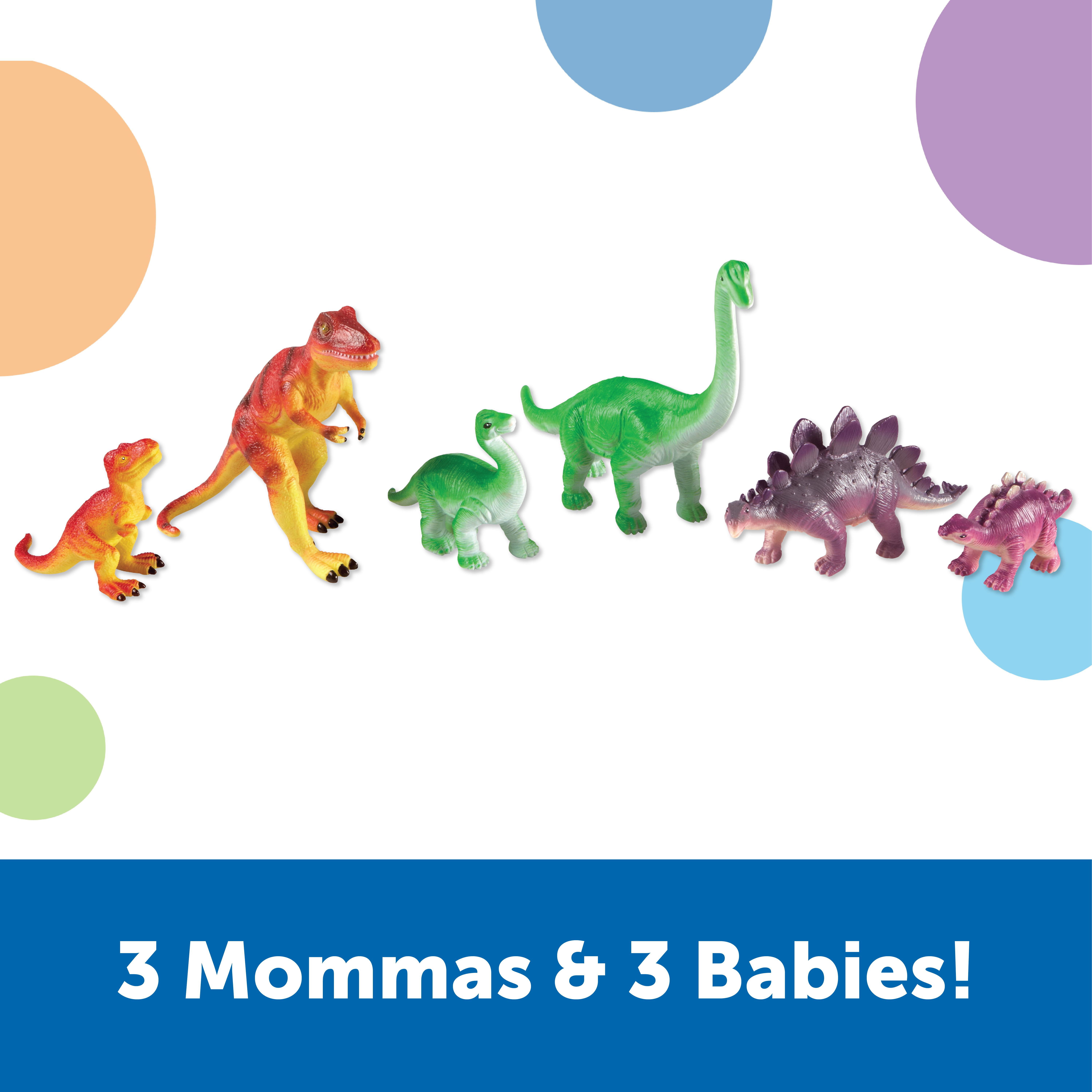 SKU LER0836 Product Title JUMBO DINOSAURS: MOMMAS & BABIES Brand Name Learning Resources UPC 765023808360 Piece Count 6 Min Target Age 3 Max Target Age 7 TargetGradeMax Second Grade TargetGradeMin Toddler ProductCategoryProductLine Jumbo Animals ProductCategorySubject Role Play Imaginative Play Port of Exit VNHPH Country of Origin VNM Unit Height 4 Unit Length 10.9 Unit Weight 3.05 Unit Width 13.5 Long Description - DC Family fun...back in time! Little ones will enjoy pairing these babies with their mommas, including a T.rex and baby T.rex, Stegosaurus and baby Stegosaurus, and Brachiosaurus and baby Brachiosaurus. Set of 6 realistically detailed dinosaurs invite hours of imaginative play and early vocabulary development. Durable plastic dinosaurs are sized just right for small hands and can be wiped clean. Largest animal (momma Brachiosaurus) measures 11″L x 93/4"H. . CA prop 65 No Case Height 14.5 Case Length 22.9 Case Quantity 8 Case Weight 27.35 CPQ 3.36 Includes Remote No Marble Warning No MSRP 37.99 Small Ball Warning No Small Parts Warning No