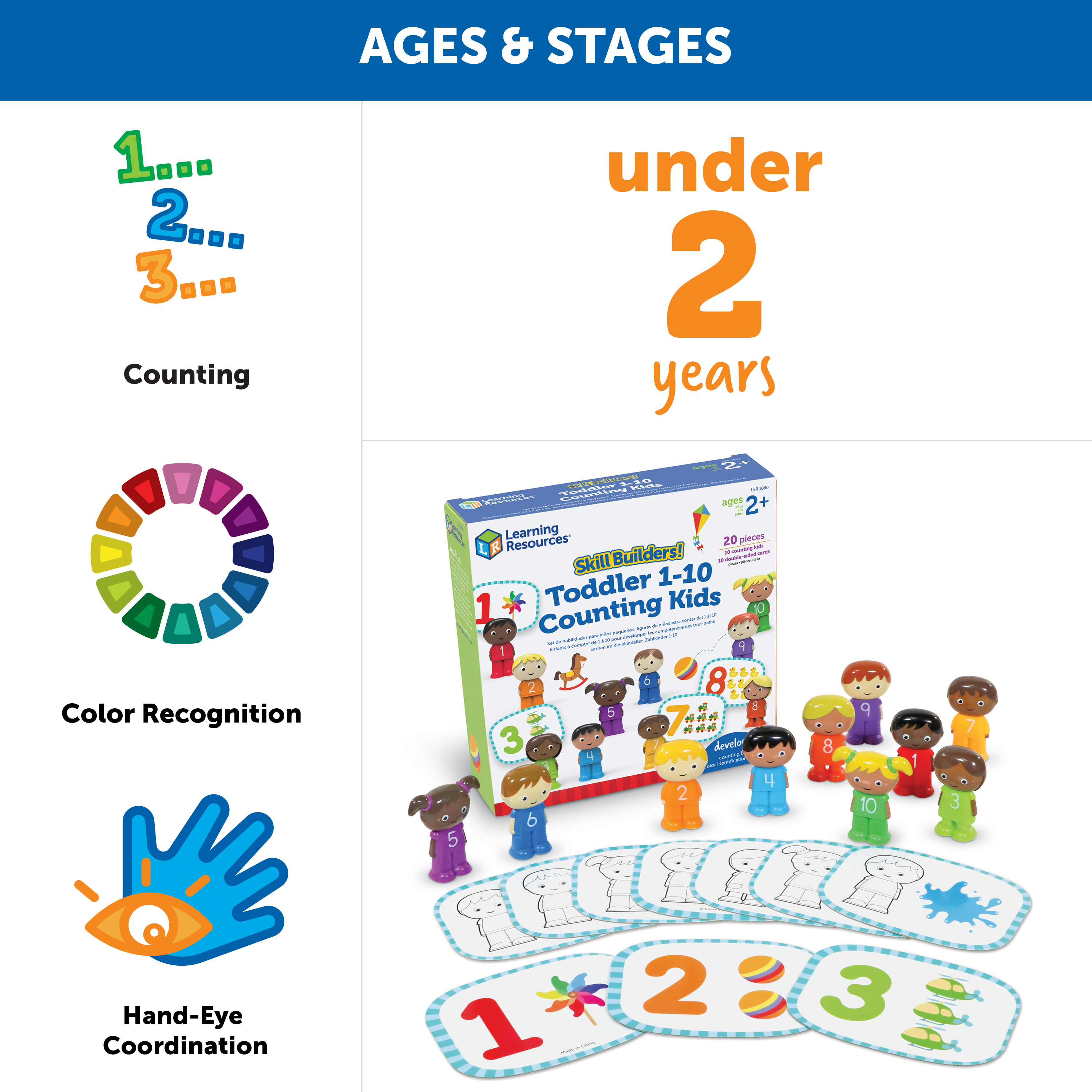SKU LER1060 Product Title Skill Builders! ToddLER 1-10 Counting Kids Brand Name Learning Resources UPC 765023010602 Piece Count 10 Min Target Age 1.5 Max Target Age 3 TargetGradeMax Toddler TargetGradeMin Toddler ProductCategoryProductLine Skill Builders! ProductCategorySubject Workbooks & Kits Port of Exit CNYTN Country of Origin CHN Unit Height 2.1 Unit Length 8 Unit Weight 0.6 Unit Width 8 CA prop 65 No Case Height 8.9 Case Length 16.7 Case Quantity 8 Case Weight 5.95 CPQ 0.77 Includes Remote No Marble Warning No MSRP 20.99 Small Ball Warning No Small Parts Warning No
