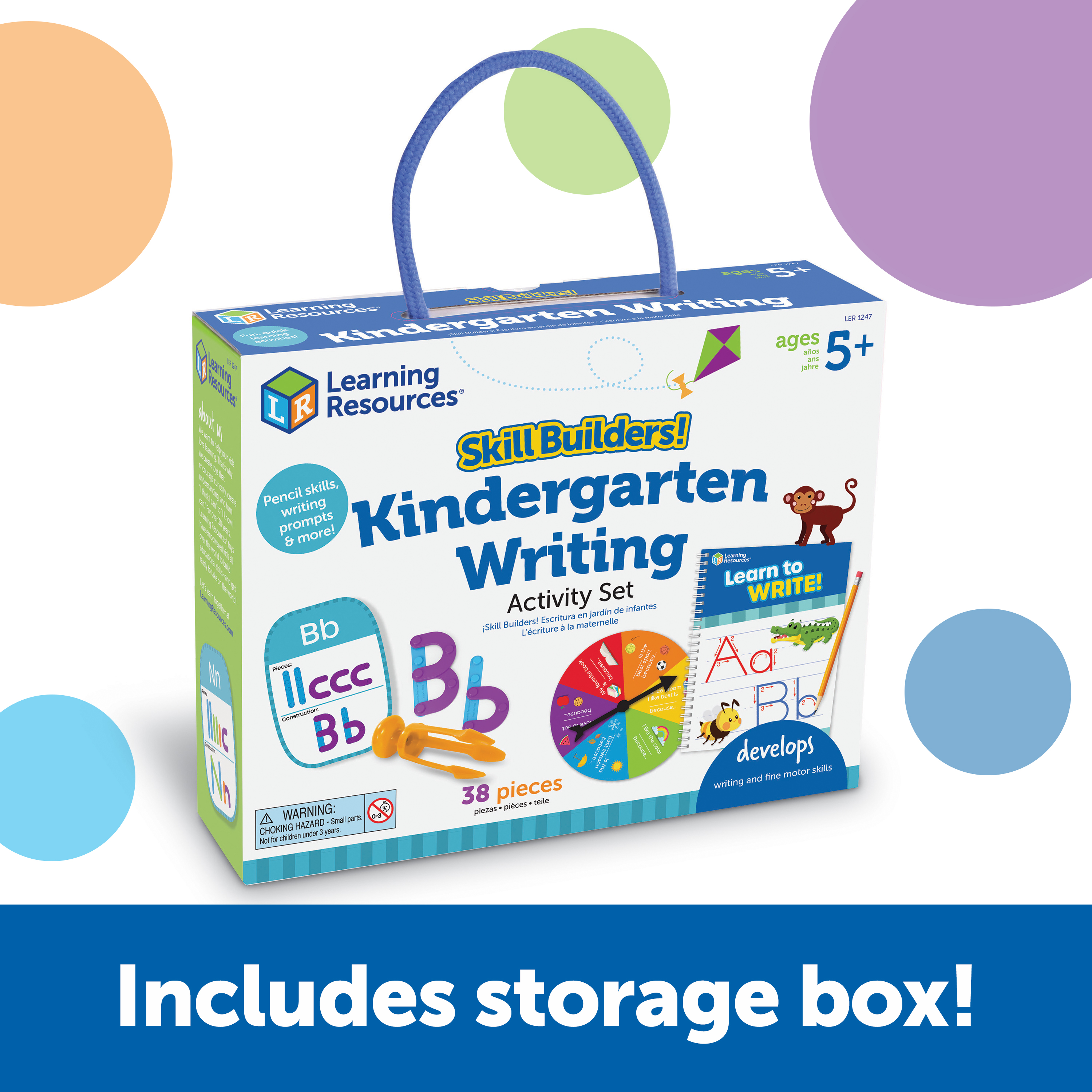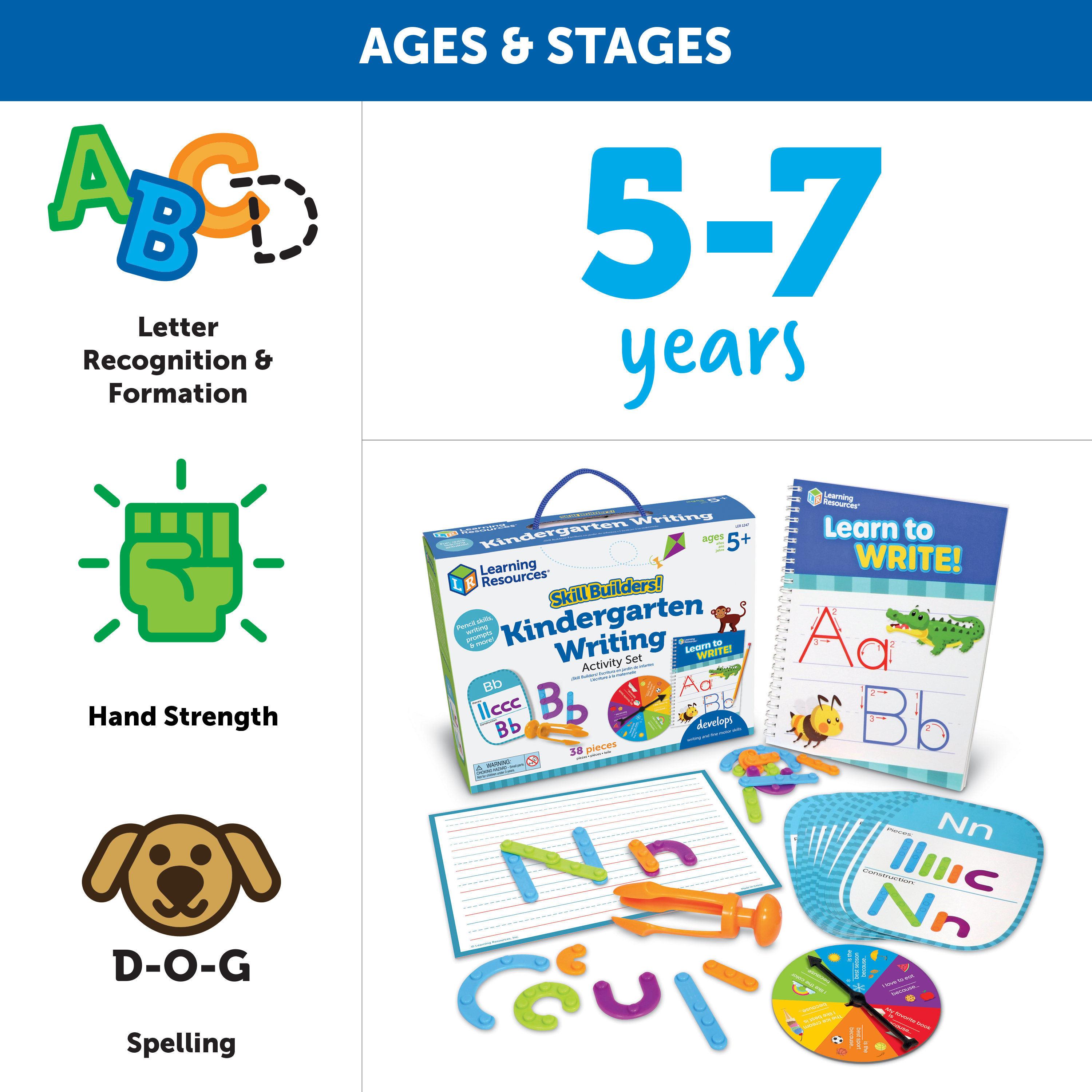 SKU LER1247 Product Title SKILL BUILDERS! KINDERGARTEN WRITING Brand Name Learning Resources UPC 765023812473 Piece Count 38 Min Target Age 5 Max Target Age 9 TargetGradeMax Fourth Grade TargetGradeMin Kindergarten ProductCategoryProductLine Skill Builders! ProductCategorySubject Workbooks & Kits Port of Exit CNYTN Country of Origin CHN Unit Height 8 Unit Length 2.5 Unit Weight 1 Unit Width 10.12 Long Description - DC Play your way to kindergarten-ready spelling and language skil!s Set your kids on the path to school success with the fun, quick writing activities found in the Skill Builders! Kindergarten Writing activity set from Learning Resources. This 38-piece set comes with all of the hands-on activities needed to help kids learn and retain essential language and writing skills; build hands-on pencil skills with the Tri-Grip Tongs, visualize spelling with tracing and letter construction play, put new vocabulary to the test with writing prompts, and more! Designed with all kinds of spelling, language, and writing skills in mind, Skill Builders! Kindergarten Writing is a versatile way to learn; whether you're looking for homeschool supplies or teacher supplies for classroom instruction, this set has the fun, active play you need! This set can even function as inspiration for self-correcting ESL exercises! Skill Builders! Kindergarten Writing also comes with a built-in carrying case, so you can build your early spelling and language skills on the go! CA prop 65 No Case Height 9.3 Case Length 10.8 Case Quantity 4 Case Weight 4.65 CPQ 0.63 Includes Remote No Marble Warning No MSRP 18.99 Small Ball Warning No Small Parts Warning Yes