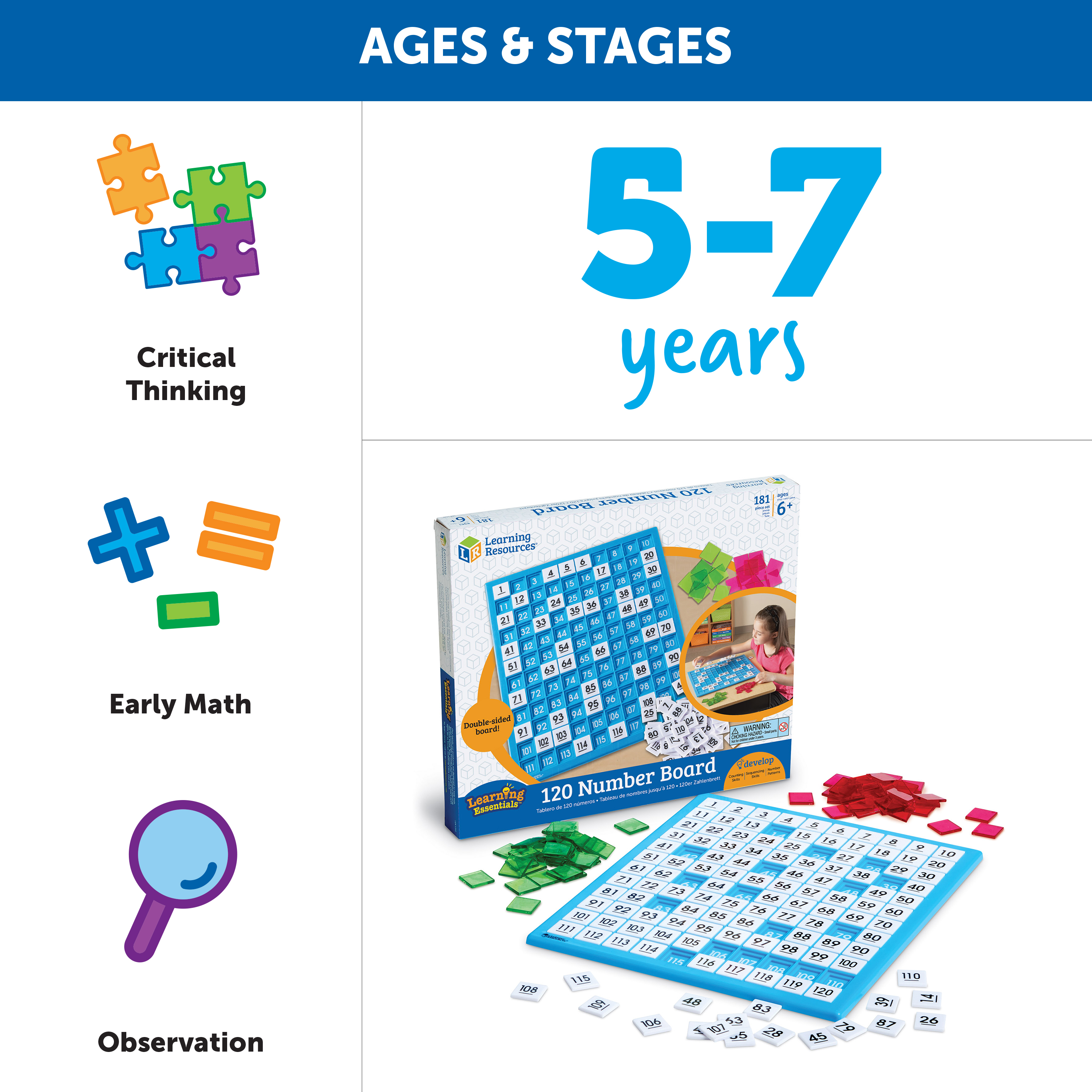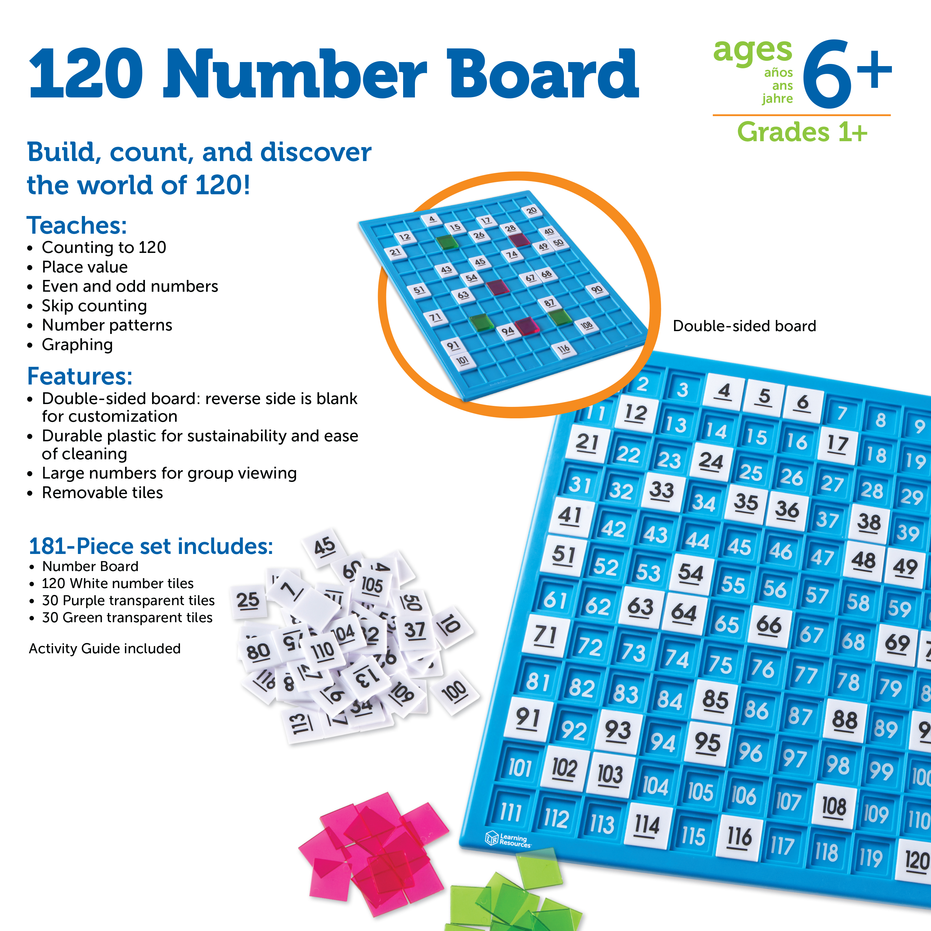 SKU LER1332 Product Title 120 NUMBER BOARD Brand Name Learning Resources UPC 765023013320 Piece Count 181 Min Target Age 6 Max Target Age 10 TargetGradeMax Fifth Grade TargetGradeMin First Grade ProductCategorySubject Math Port of Exit CNYTN Country of Origin CHN Unit Height 1.1 Unit Length 12.5 Unit Weight 2.3 Unit Width 14.3 Long Description - DC Build, count, and discover the world of 120! introduce number patterns, sequencing, place value, odd and even numbers, and much more. Double-sided board features numbers printed on the front and a blank grid for additional patterning and graphing activities on the reverse. Includes durable plastic board and 180 plastic tiles, including transparent blanks in two colors for highlighting. Meets Common Core State Standards. Board measures 12"l x 12"H. CA prop 65 No Case Height 13.5 Case Length 19.7 Case Quantity 6 Case Weight 29.45 CPQ 2.35 Includes Remote No Marble Warning No MSRP 36.99 Small Ball Warning No Small Parts Warning Yes