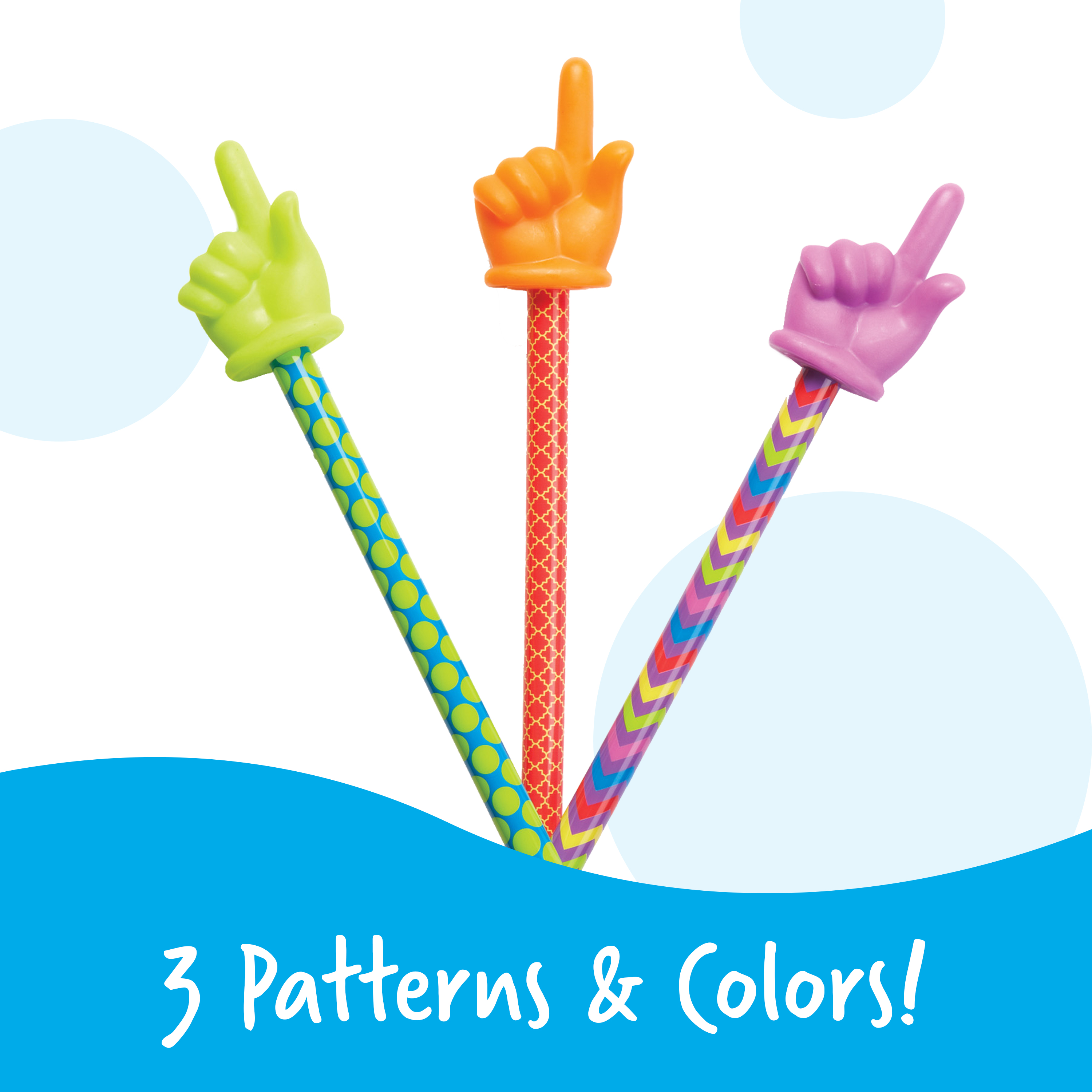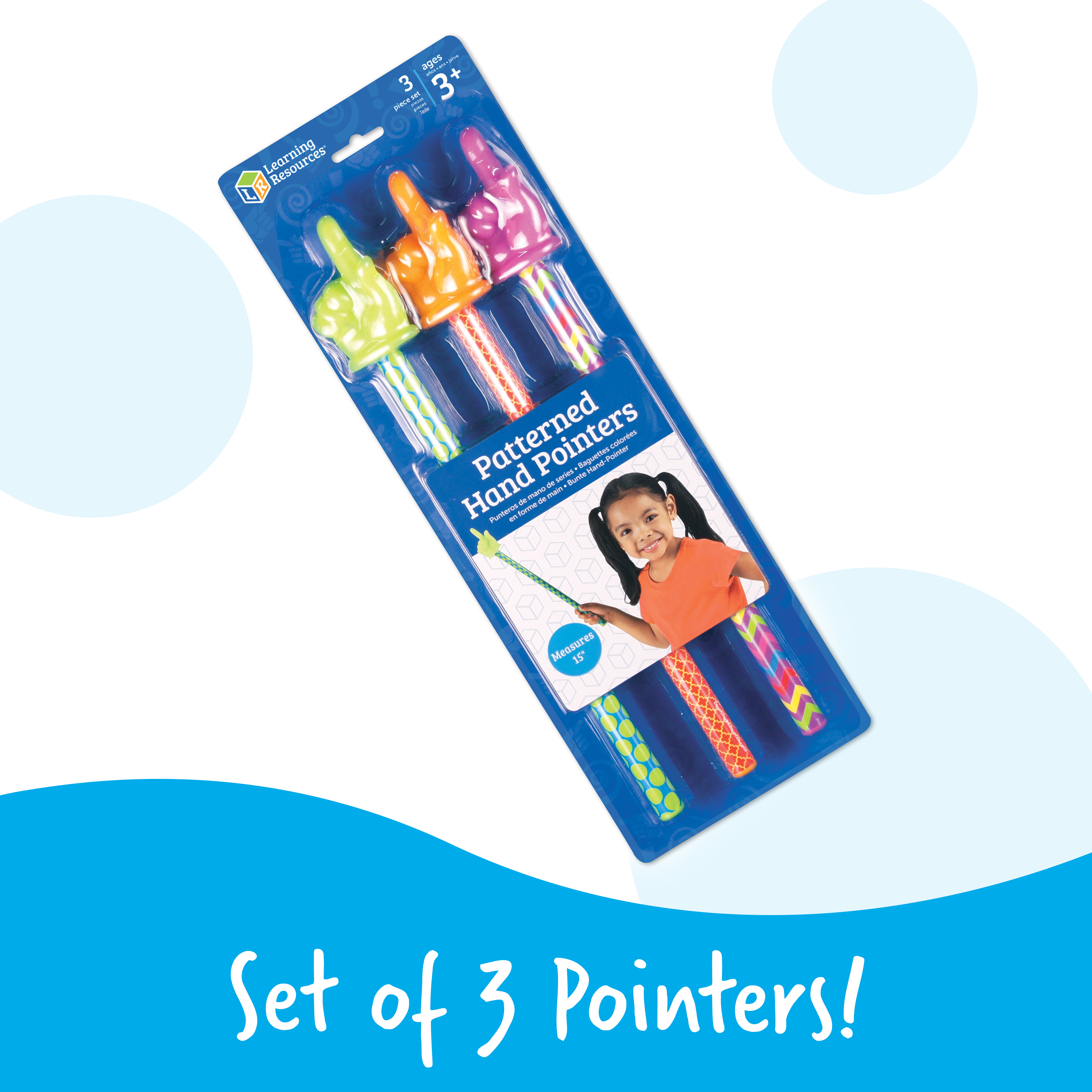 SKU LER1958 Product Title PATTERNED HAND POINTERS Brand Name Learning Resources UPC 765023019582 Piece Count 3 Min Target Age 3 Max Target Age 7 TargetGradeMax Second Grade TargetGradeMin Toddler ProductCategoryProductLine Pointers ProductCategorySubject Classroom Resources Port of Exit VNHPH Country of Origin VNM Unit Height 0.2 Unit Length 16.5 Unit Weight 0.5 Unit Width 5.5 Long Description - DC Encourage classroom participation with this set of 3 newly designed hand pointers. Bold colors and patterns capture students' attention and are easy to see against whiteboards. Each pointer features a different solid-colored top and patterned handle. CA prop 65 No Case Height 6.4 Case Length 18 Case Quantity 4 Case Weight 2.65 CPQ 0.49 Includes Remote No Marble Warning No MSRP 14.99 Small Ball Warning No Small Parts Warning No