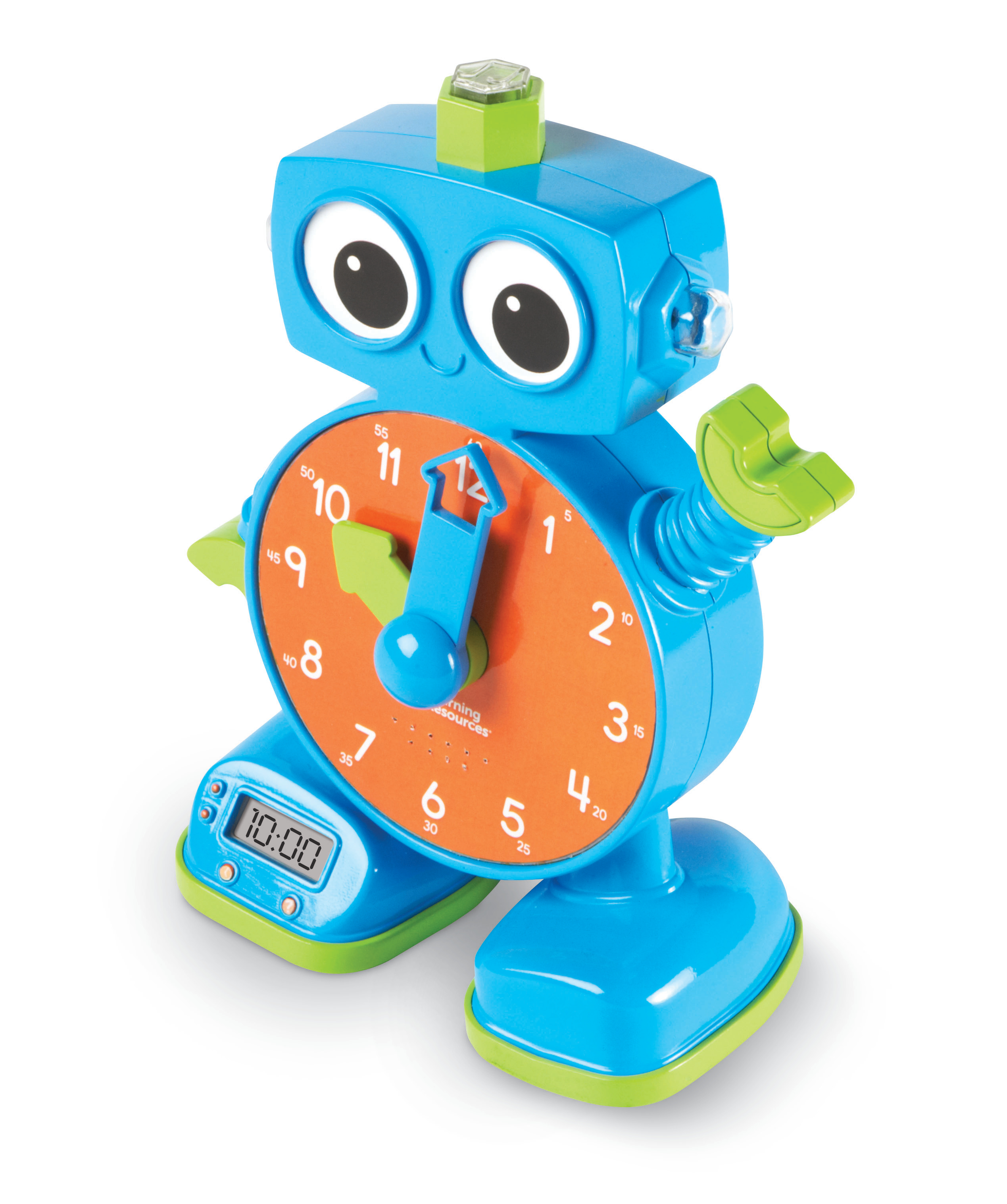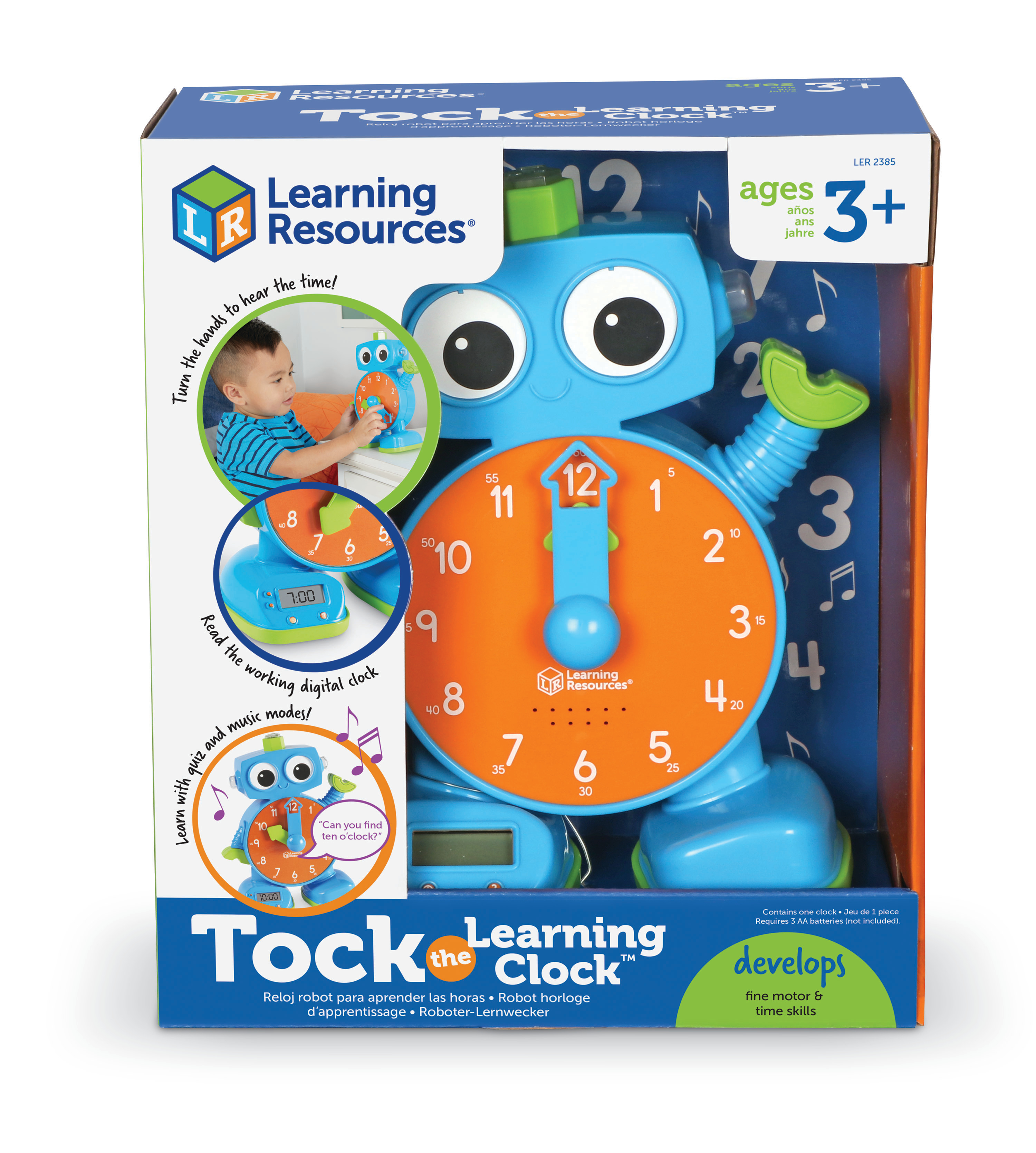 SKU LER2385 Product Title LEARNING CLOCK Brand Name Learning Resources UPC 765023023855 Piece Count 1 Min Target Age 3 Max Target Age 7 TargetGradeMax Second Grade TargetGradeMin Toddler ProductCategoryProductLine Time ProductCategorySubject Math Country of Origin CHN Unit Height 4 Unit Length 11 Unit Weight 1.25 Unit Width 9.2 Long Description - DC Ready to have fun learning? Turn telling time into a musical fun with Tock the learning clock is from Learning Resources. This adorable learn to tell time clock for kids comes with analog hour and minute hands, and a digital display that works as a real clock. Tock supports two time-teaching modes: in musical fun mode, Tock rewards kids for correctly setting the hour and minute hands by playing snippets of fun, dance-ready tunes. In question mode, Tock asks kids to match the analog hands to the time shown on the clock's digital display, turning every passing minute into a potential quiz. Tock the Learning Clock also helps kids get a good night’s rest. Tock comes with a night light function, as well as an “ok to wake” light that changes color when it's time to get out of bed. Batteries Needed No Battery Count 3 Battery Material Alkaline Battery Type AA CA prop 65 No Case Height 12 Case Length 9.7 Case Quantity 4 Case Weight 5.7 CPQ 1.15 Includes Remote No Marble Warning No MSRP 29.99 Power Source Batteries Small Ball Warning No Small Parts Warning No