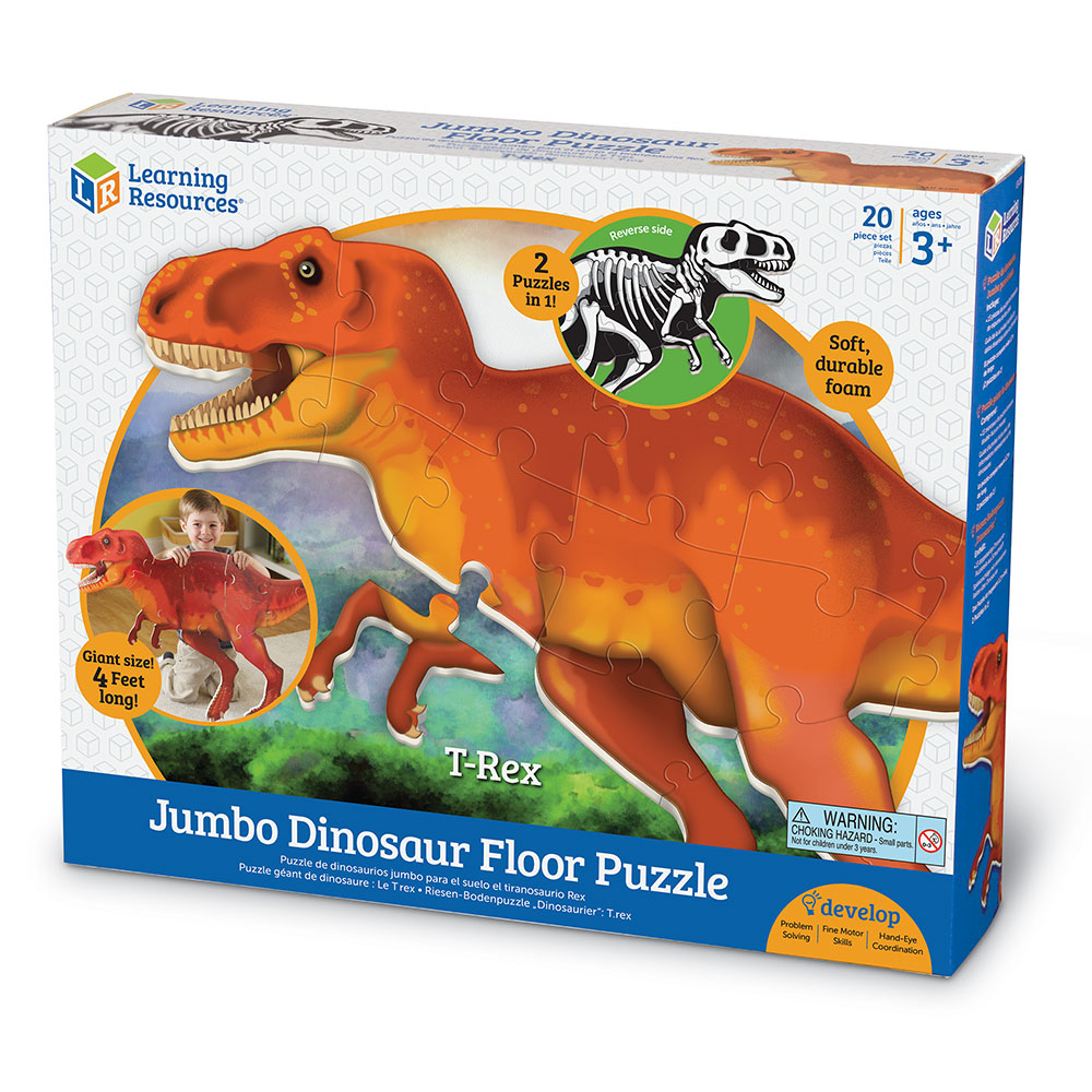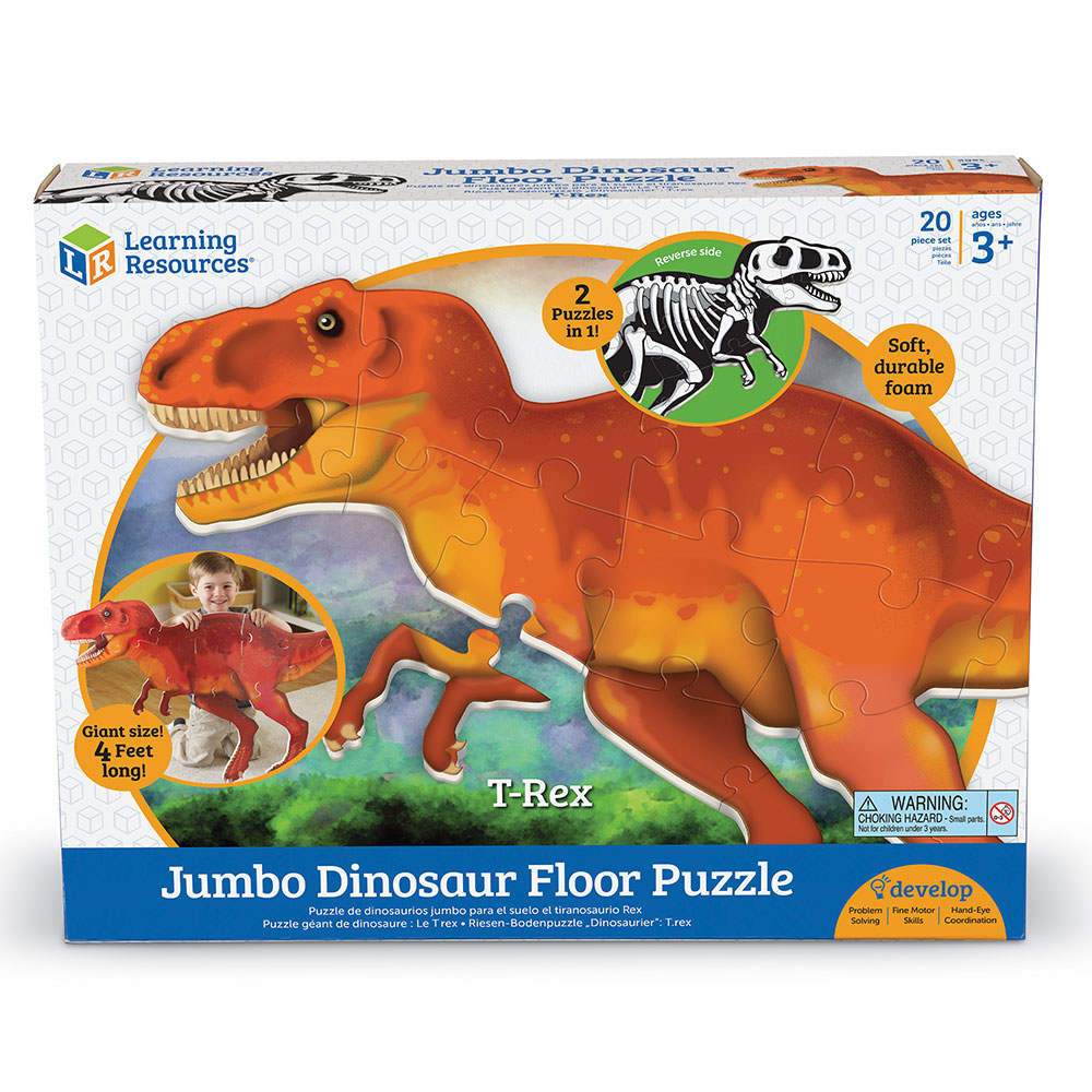 SKU LER2389 Product Title JUMBO DINOSAUR FLOOR PUZZLE - T-REX Brand Name Learning Resources UPC 765023023893 Piece Count 20 Min Target Age 3 Max Target Age 7 TargetGradeMax Second Grade TargetGradeMin Toddler ProductCategorySubject Science/STEM Port of Exit CNYTN Country of Origin CHN Unit Height 3.3 Unit Length 16.3 Unit Weight 1.1 Unit Width 13.2 Long Description - DC Encourage your little ones to get a big kick out of science with this Jumbo Dinosaur Floor Puzzle. The king of all dino puzzles, this T-Rex measures in at an astonishing 4 feet long and 2 feet high when completed. Best of all, it's actually 2 puzzles in one, since the front side features a bright T-Rex, and the reverse features a realistic T-Rex skeleton. The perfect way to encourage your kids to learn as they play, the T-Rex puzzle helps children understand scientific ideas, practice their critical thinking skills, and get a head start on concept they'll encounter later in school. The puzzle includes 20 big pieces that are made from soft, durable, foam. Safe for growing hands and safe for floors as well, the puzzle can be used in playrooms, bedrooms, classrooms and more! Look for the Triceratops and Stegosaurus to complete the collectible puzzle and poster set! CA prop 65 No Case Height 13 Case Length 16.6 Case Quantity 4 Case Weight 5.6 CPQ 1.75 Includes Remote No Marble Warning No MSRP 36.99 Small Ball Warning No Small Parts Warning Yes