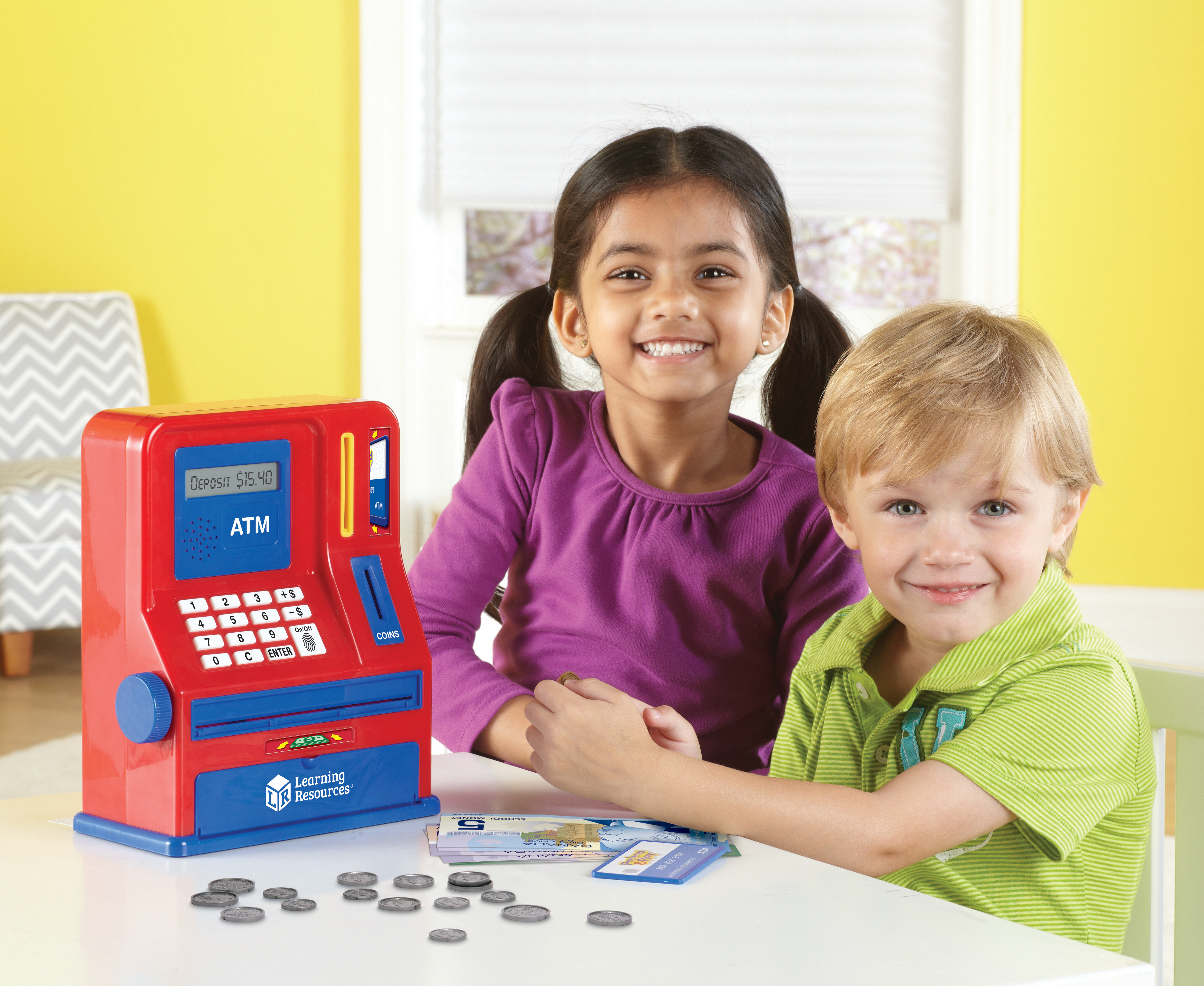 SKU LER2625-C Product Title TEACHING ATM - CANADIAN Brand Name Learning Resources UPC 765023826258 Piece Count 0 Min Target Age 0 Max Target Age 0 ProductCategoryProductLine Pretend & Play ProductCategorySubject Role Play Imaginative Play Port of Exit CNYTN Country of Origin CHN Unit Height 4.6 Unit Length 12 Unit Weight 1.95 Unit Width 10 Long Description - DC Children learn money skills as they deposit, withdraw, and save real and pretend money with this electronic ATM bank. Features coin recognition and a mechanical bill feeder. Includes Canadian play money and ATM card. Perfect for teaching savings goals! Canadian currency included 15 bills, 4 quarters, 10 dimes and 10 nickels. Batteries Needed No Battery Count 3 Battery Material Alkaline Battery Type AA CA prop 65 No Case Height 11.2 Case Length 18.9 Case Quantity 4 Case Weight 9.4 CPQ 1.54 Includes Remote No Marble Warning No MSRP 44.99 Power Source Batteries Small Ball Warning No Small Parts Warning No