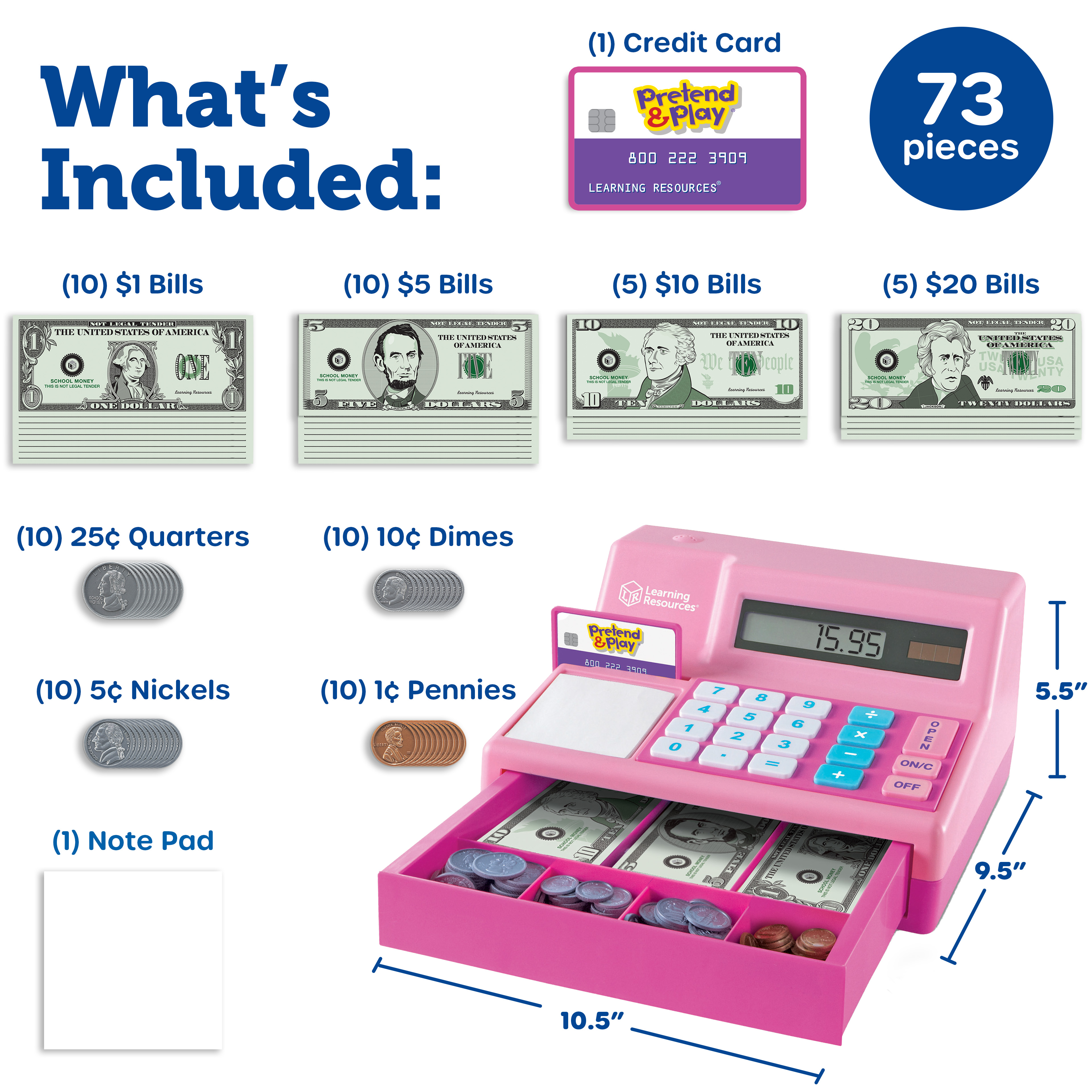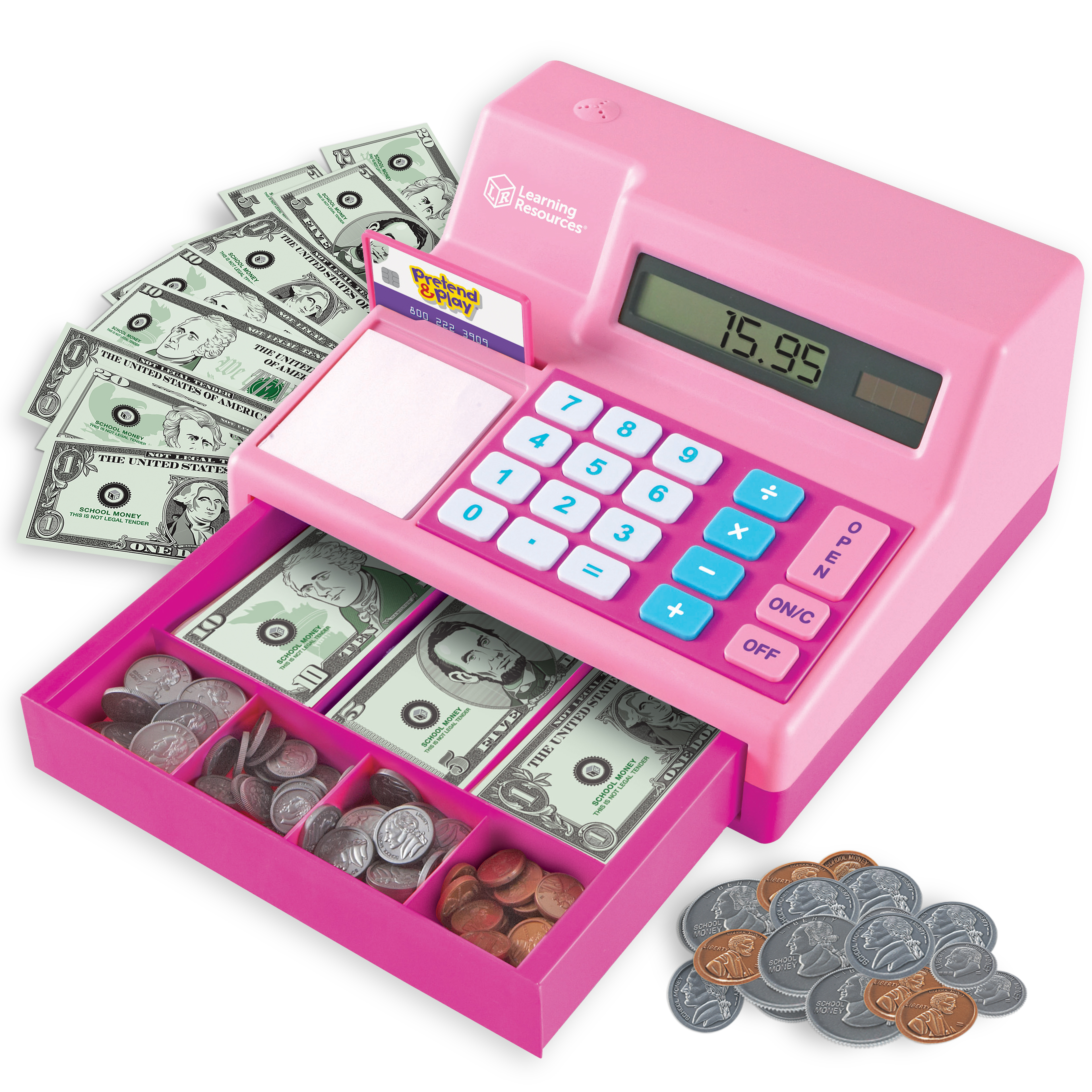 SKU LER2629-P Product Title Pretend & Play® Calculator Cash Register Pink Brand Name Learning Resources UPC 765023826296 Piece Count 0 Min Target Age 3 Max Target Age 4 TargetGradeMax Pre-K TargetGradeMin Toddler ProductCategoryProductLine Pretend & Play ProductCategorySubject Role Play Imaginative Play Port of Exit CNYTN Country of Origin CHN Unit Height 6.3 Unit Length 11.4 Unit Weight 2.8 Unit Width 9.8 Long Description - DC Encourage beginning math and calculator skills while providing lots of opportunities for imaginative play. Features a built-in solar calculator that helps familiarize children with the use of a calculator. They’ll also learn currency denomination and have fun handling life-size money. Large buttons on the keypad are easy for little hands to press and the cash drawer makes a “cha-ching” sound when it opens. Batteries Needed Yes Battery Count 1 Battery Material Alkaline Battery Type LR44 CA prop 65 No Case Height 12 Case Length 20.4 Case Quantity 6 Case Weight 18.35 CPQ 2.78 Includes Remote No Marble Warning No MSRP 47.99 Power Source Batteries Small Ball Warning No Small Parts Warning Yes