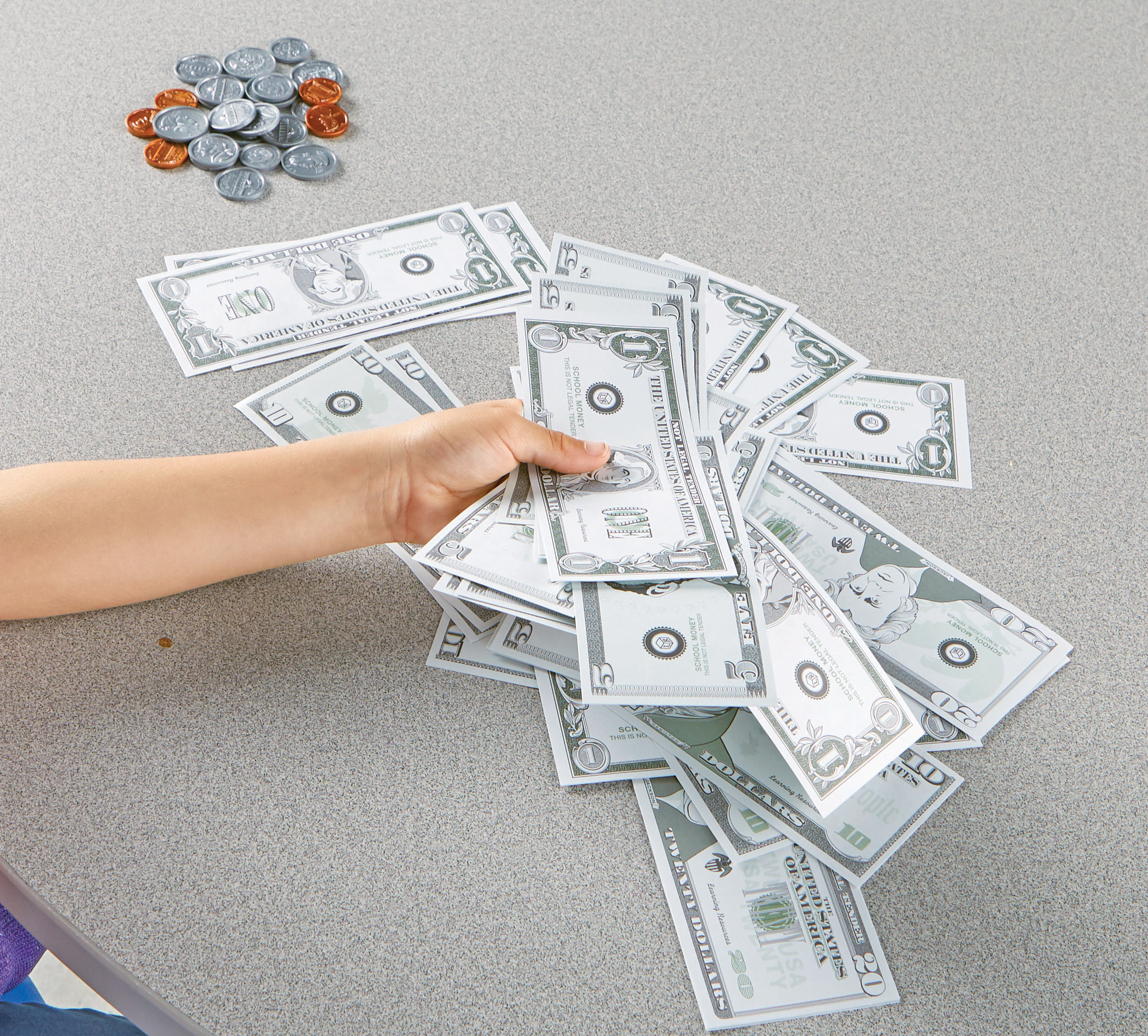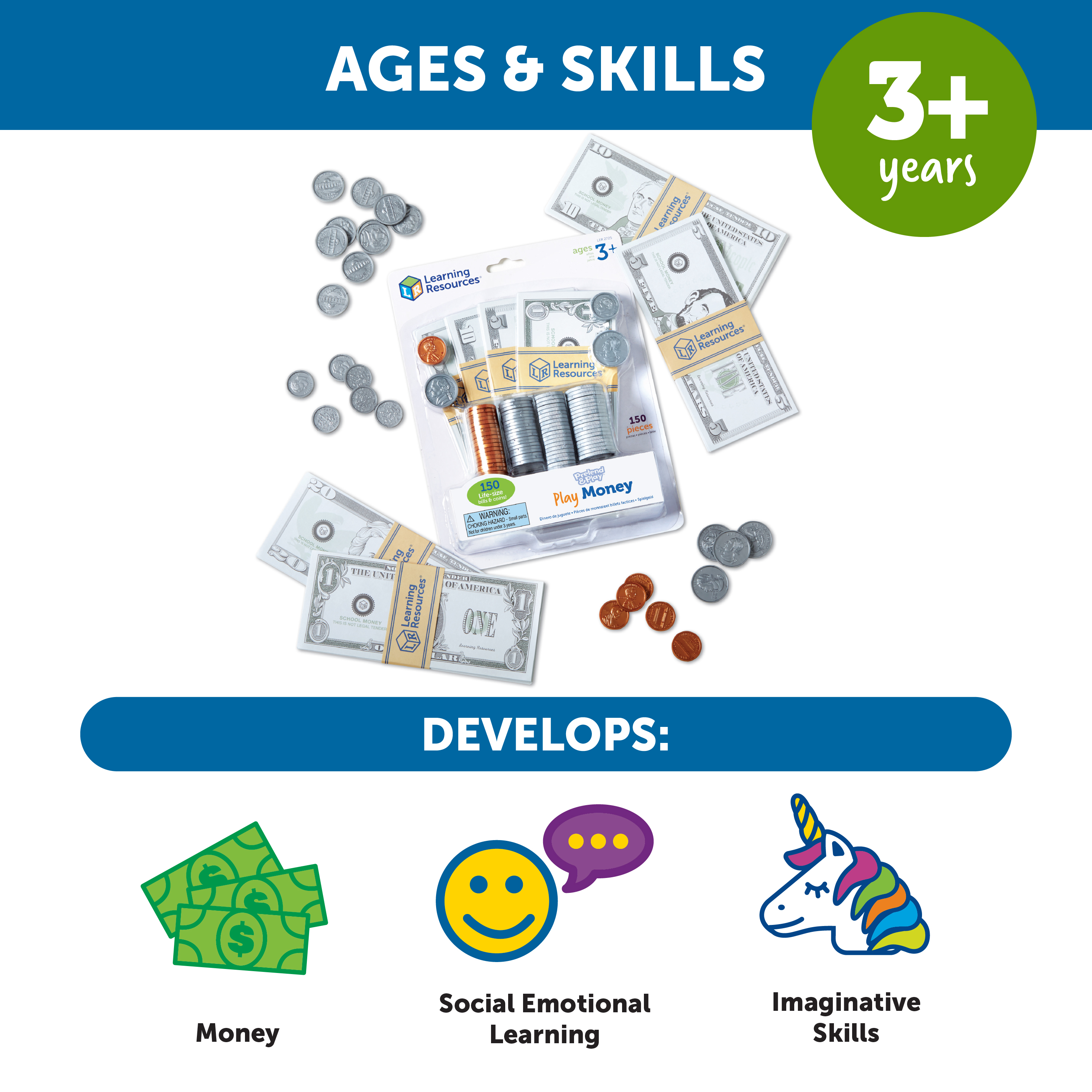 SKU LER2725 Product Title PRETEND & PLAY PLAY MONEY Brand Name Learning Resources UPC 765023027259 Piece Count 150 Min Target Age 3 Max Target Age 7 TargetGradeMax Second Grade TargetGradeMin Toddler ProductCategoryProductLine Pretend & Play ProductCategorySubject Role Play Imaginative Play Port of Exit VNHPH Country of Origin VNM Unit Height 8.5 Unit Length 1.7 Unit Weight 0.4 Unit Width 6.5 Long Description - DC Teach coin and bill recognition, subtraction, addition, and calculation of correct change with this convenient assortment of money. Get your child learning the value of money management! Set of 150 includes actual-size bills and authentically detailed coins. Works great with the Learning Resources Pretend and Play Cash Register to create your child's make believe store, or bank, or as a stand alone item. Perfect for use with Pretend & Play cash registers and other role play sets! Perfect for ages 3 and up! CA prop 65 No Case Height 7.4 Case Length 4.9 Case Quantity 4 Case Weight 1.8 CPQ 0.19 Includes Remote No Marble Warning No MSRP 13.99 Small Ball Warning No Small Parts Warning Yes