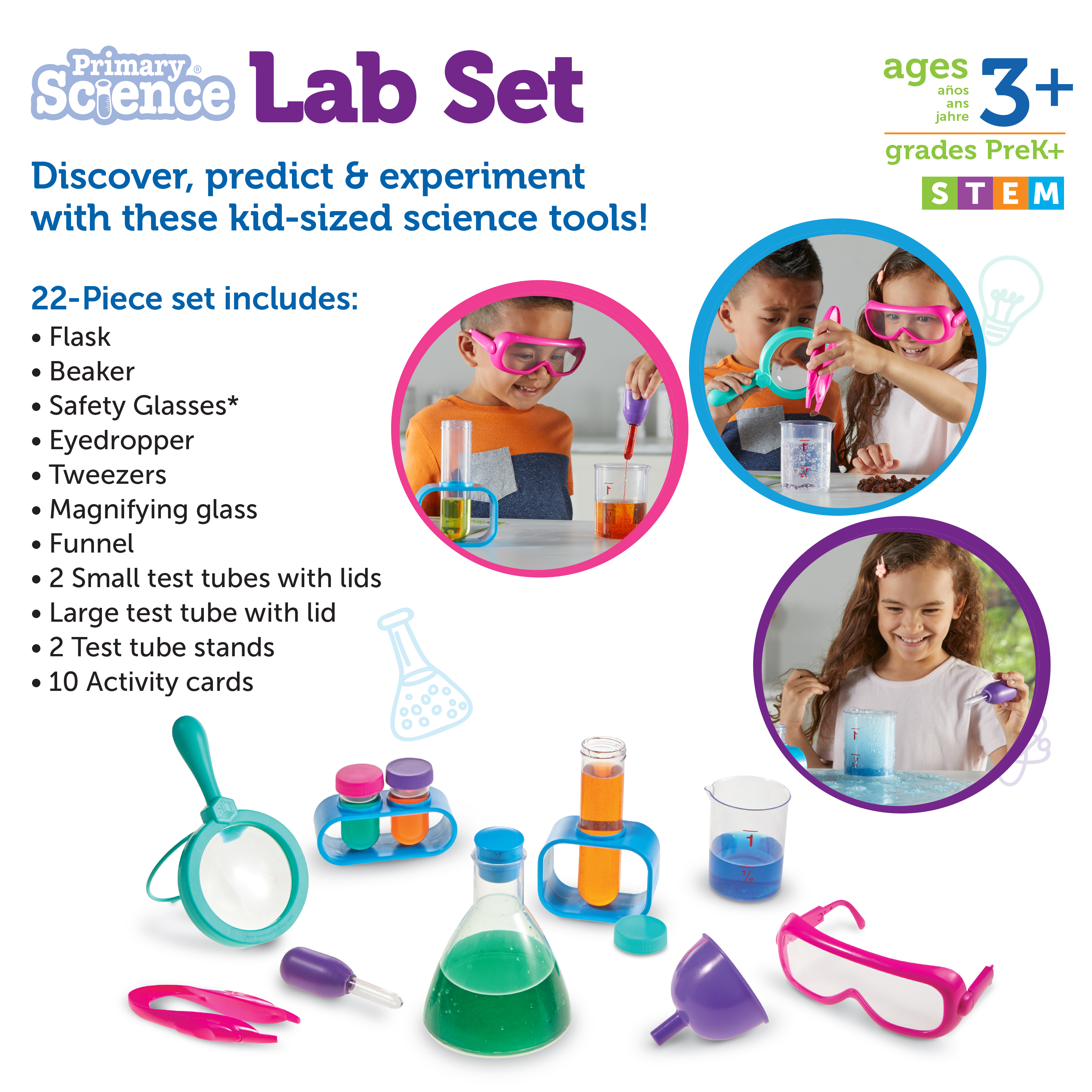 SKU LER2784-P Product Title Primary Science® Lab Set, Pink Brand Name Learning Resources UPC 765023927849 Piece Count 22 Min Target Age 3 Max Target Age 6 TargetGradeMax First Grade TargetGradeMin Pre-K ProductCategoryProductLine Primary Science ProductCategorySubject Science/STEM Port of Exit CNFZH Country of Origin CHN Unit Height 10 Unit Length 4.8 Unit Weight 2.5 Unit Width 13.9 CA prop 65 No Case Height 21.9 Case Length 14.4 Case Quantity 6 Case Weight 16.85 CPQ 2.76 Includes Remote No Marble Warning No MSRP 39.99 Small Ball Warning No Small Parts Warning Yes