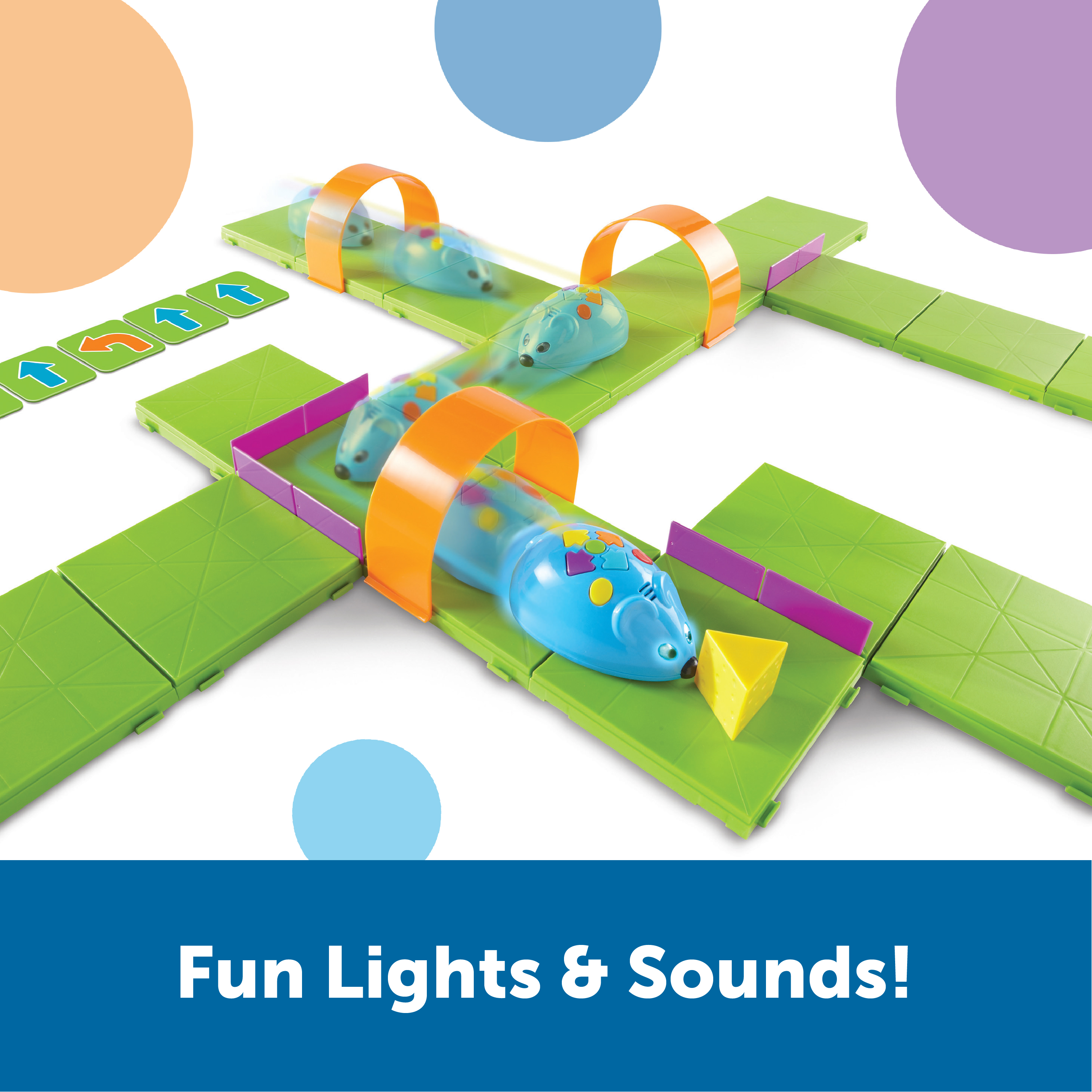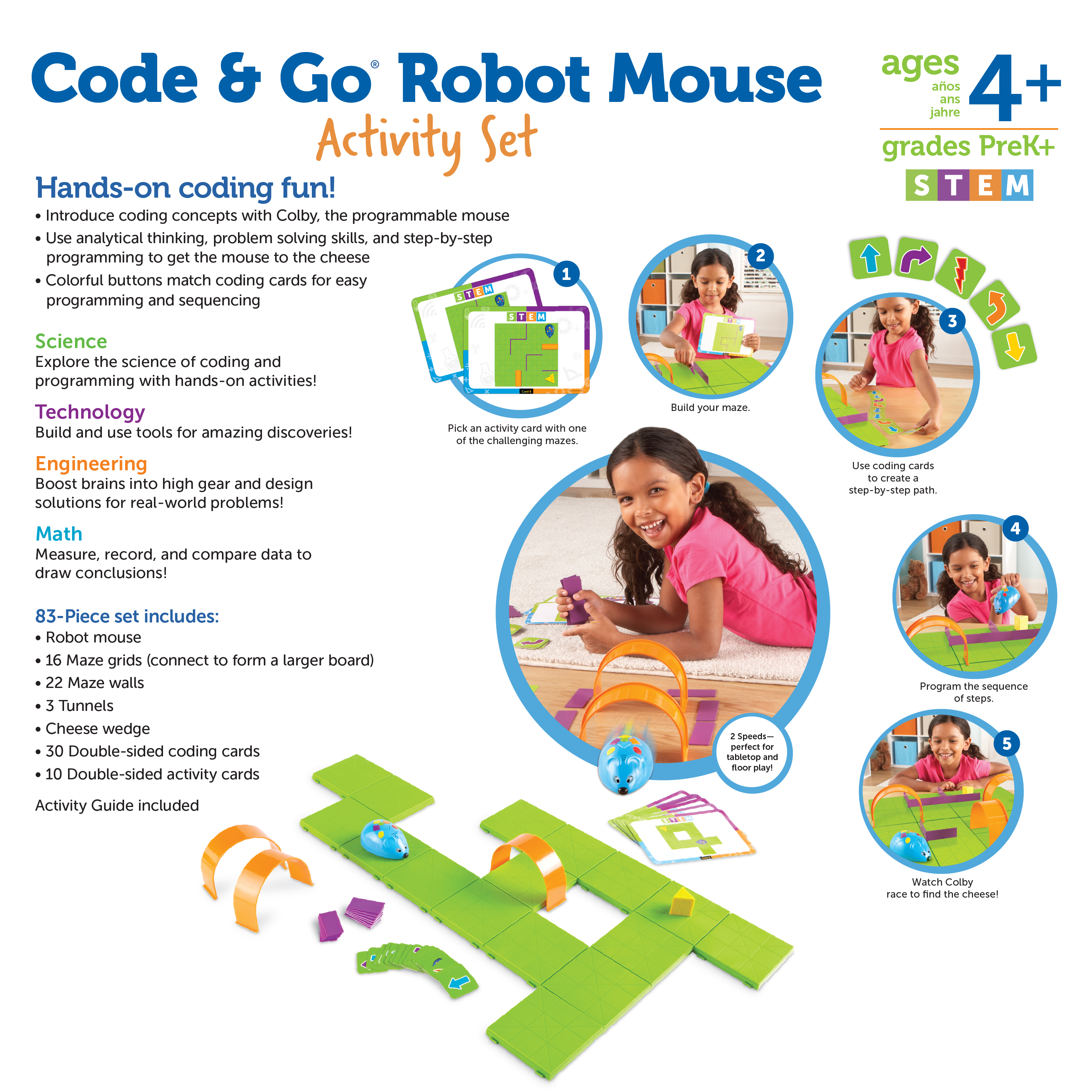 SKU LER2831 Product Title Code & Go® Robot Mouse Activity Set Brand Name Learning Resources UPC 765023028317 Piece Count 83 Min Target Age 4 Max Target Age 8 TargetGradeMax Third Grade TargetGradeMin Pre-K ProductCategoryProductLine Code & Go ProductCategorySubject Coding Port of Exit CNYTN Country of Origin CHN Unit Height 12.62 Unit Length 3.15 Unit Weight 3.9 Unit Width 16.3 Long Description - DC Build your maze, and then use the coding cards to create a step-by-step path for the Programmable Robot Mouse. Program the sequence of steps, and then watch the mouse race to find the cheese! This deluxe set includes 30 double-sided coding cards, 10 double-sided Activity Cards, cheese wedge, and Activity Guide to provide the perfect hands-on introduction to coding concepts. Create endless maze path possibilities with 16 maze grids, 22 maze walls, and 3 tunnels. Add multiple players with the Programmable Robot Mouse (LER 2841), sold separately. Mouse lights up, makes sounds, and features 2 speeds. Mouse measures 4"L and requires 3 AAA batteries (not included). CA prop 65 No Case Height 17.5 Case Length 13 Case Quantity 4 Case Weight 16.85 CPQ 1.72 Includes Remote No Marble Warning No MSRP 71.99 Small Ball Warning No Small Parts Warning No