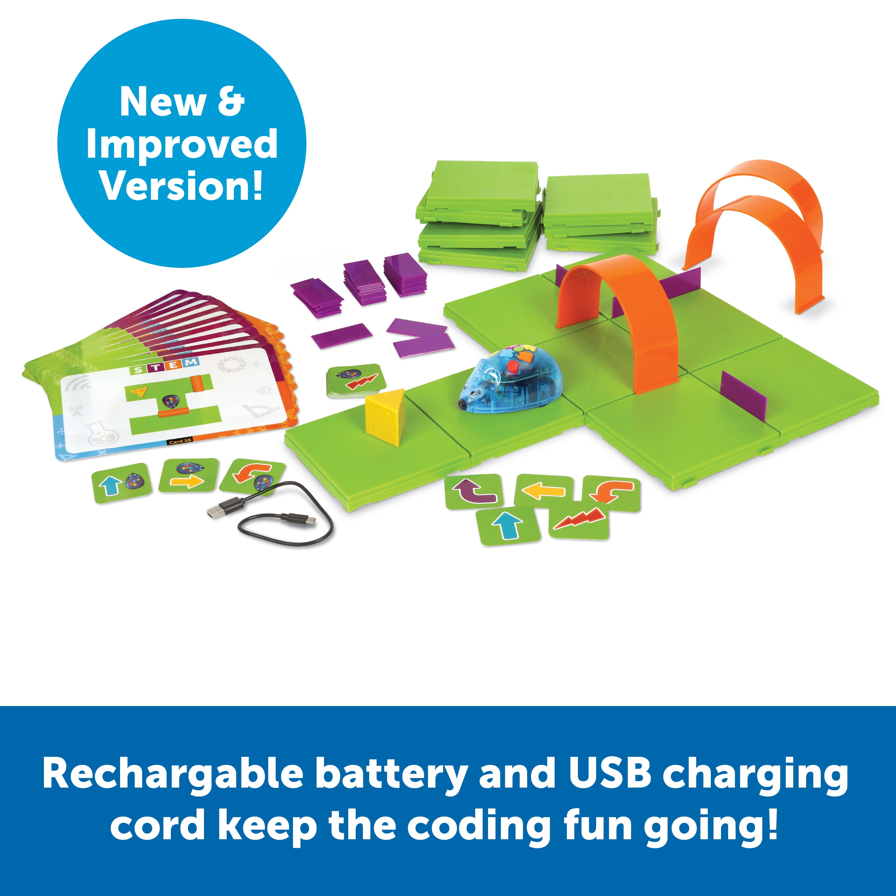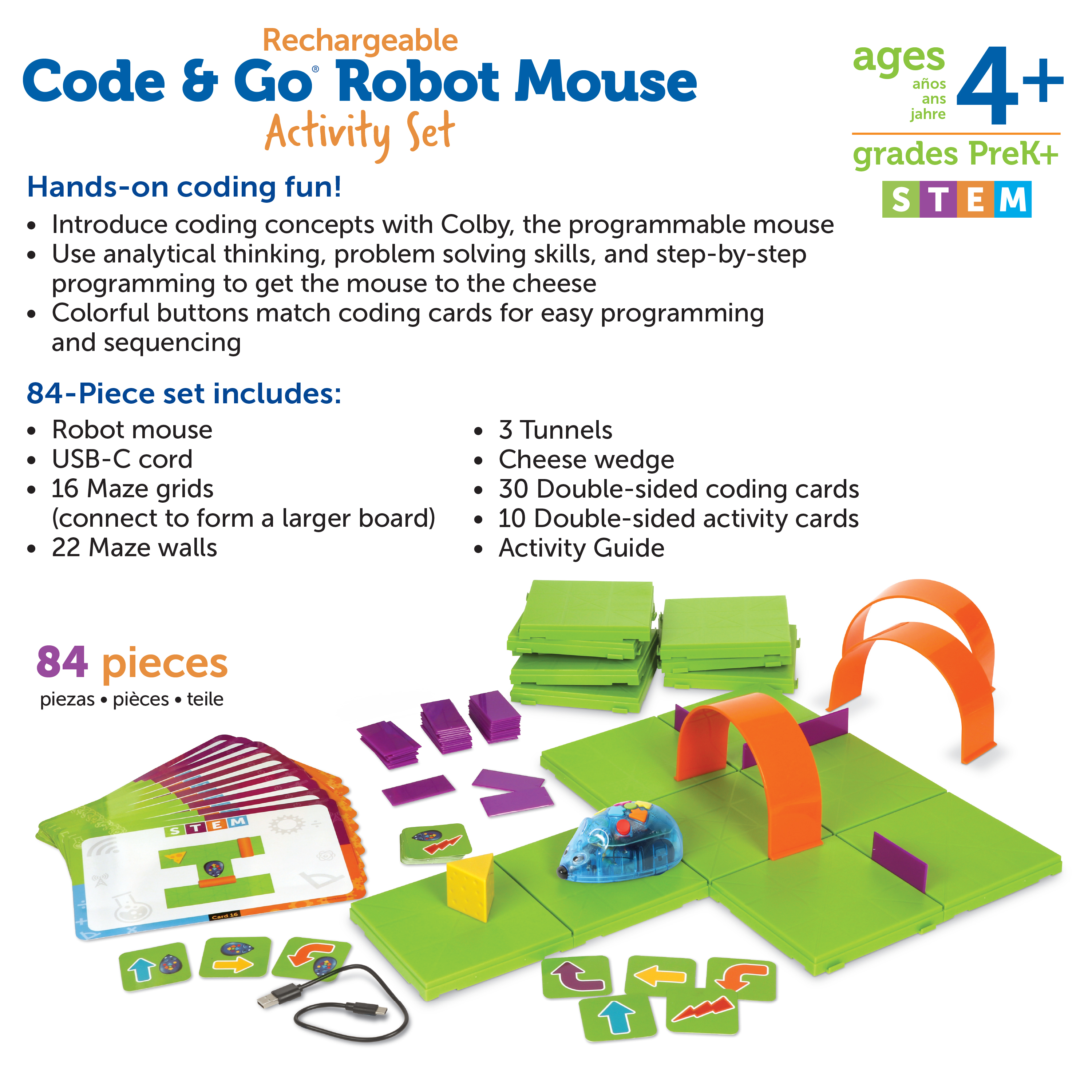 SKU LER2872 Product Title Code & Go® Robot Mouse Activity Set, Rechargeable Brand Name Learning Resources UPC 765023028720 Piece Count 84 Min Target Age 4 Max Target Age 8 TargetGradeMax Third Grade TargetGradeMin Pre-K ProductCategoryProductLine Code & Go ProductCategorySubject Coding Port of Exit CNYTN Country of Origin CHN Unit Height 3.1 Unit Length 12.7 Unit Weight 4 Unit Width 16.3 Long Description - DC Learning Resources Code & Go Robot Mouse Activity Set gives kids a fun, hands‑on way to learn early coding skills. Children program Colby the robot mouse to move through mazes using easy buttons and matching coding cards. The set includes maze grids, walls, tunnels, activity cards, and a cheese wedge, so kids can build different challenges again and again. The rechargeable design means no more replacing batteries—just plug in the USB‑C cord and keep playing. This set helps kids practice problem‑solving, sequencing, and STEM thinking in a playful, screen‑free way. Great for classrooms, STEM centers, and home learning, it encourages kids to explore coding with confidence and creativity. CA prop 65 No Case Height 17.2 Case Length 12.9 Case Quantity 4 Case Weight 17.3 CPQ 1.69 Includes Remote No Marble Warning No MSRP 89.99 Power Source USB Small Ball Warning No Small Parts Warning No