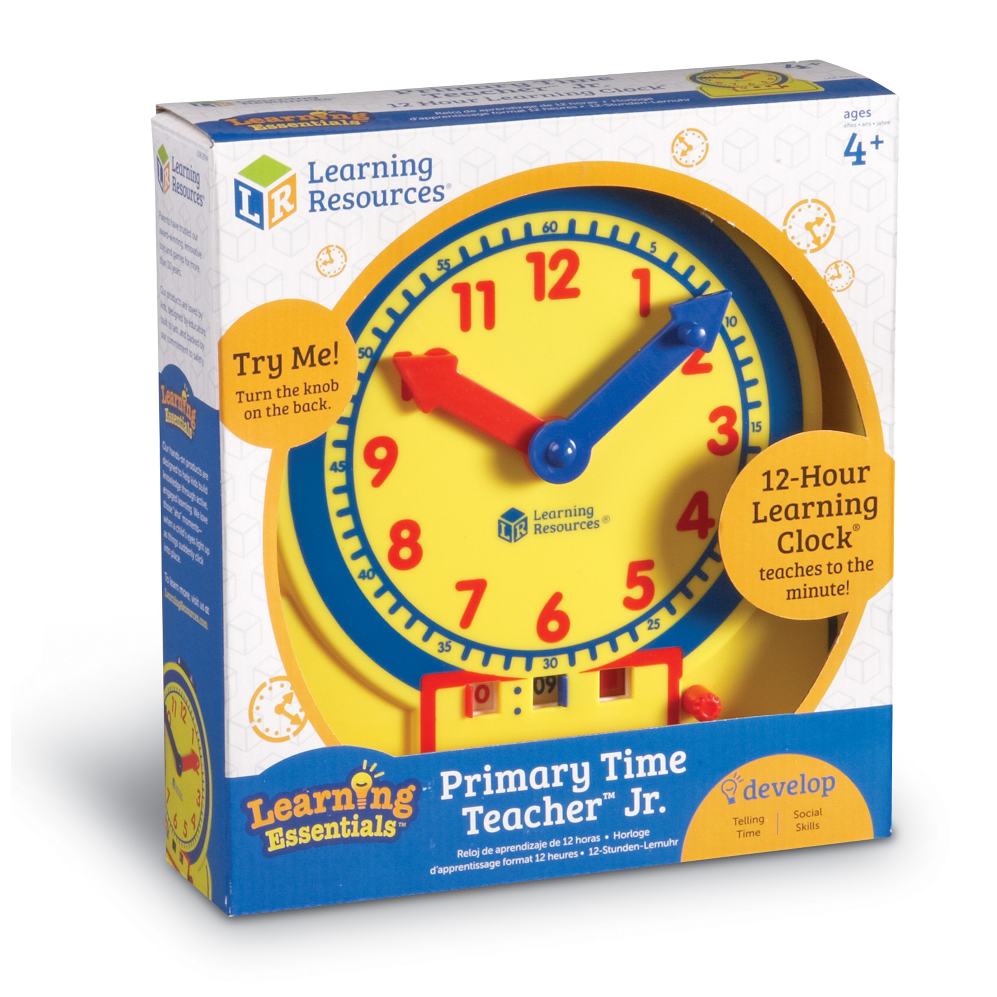 SKU LER2994 Product Title PRIMARY TIME TEACHER JR. 12 HOUR Brand Name Learning Resources UPC 765023029949 Piece Count 1 Min Target Age 3 Max Target Age 7 TargetGradeMax Second Grade TargetGradeMin Toddler ProductCategoryProductLine Time ProductCategorySubject Math Country of Origin CHN Unit Height 2.5 Unit Length 9.4 Unit Weight 1.1 Unit Width 8.7 Long Description - DC Teach both analog and digital time, plus elapsed time, with this geared interactive clock. Invite students to move the minute hand and see the change in the digital display window. Keep the window closed to assess clock-reading skills. Clock is accurate to the minute. This junior version clock is perfectly sized for small hands to manage. CA prop 65 No Case Height 9.3 Case Length 20 Case Quantity 12 Case Weight 14.95 CPQ 1.68 Includes Remote No Marble Warning No MSRP 21.99 Small Ball Warning No Small Parts Warning No