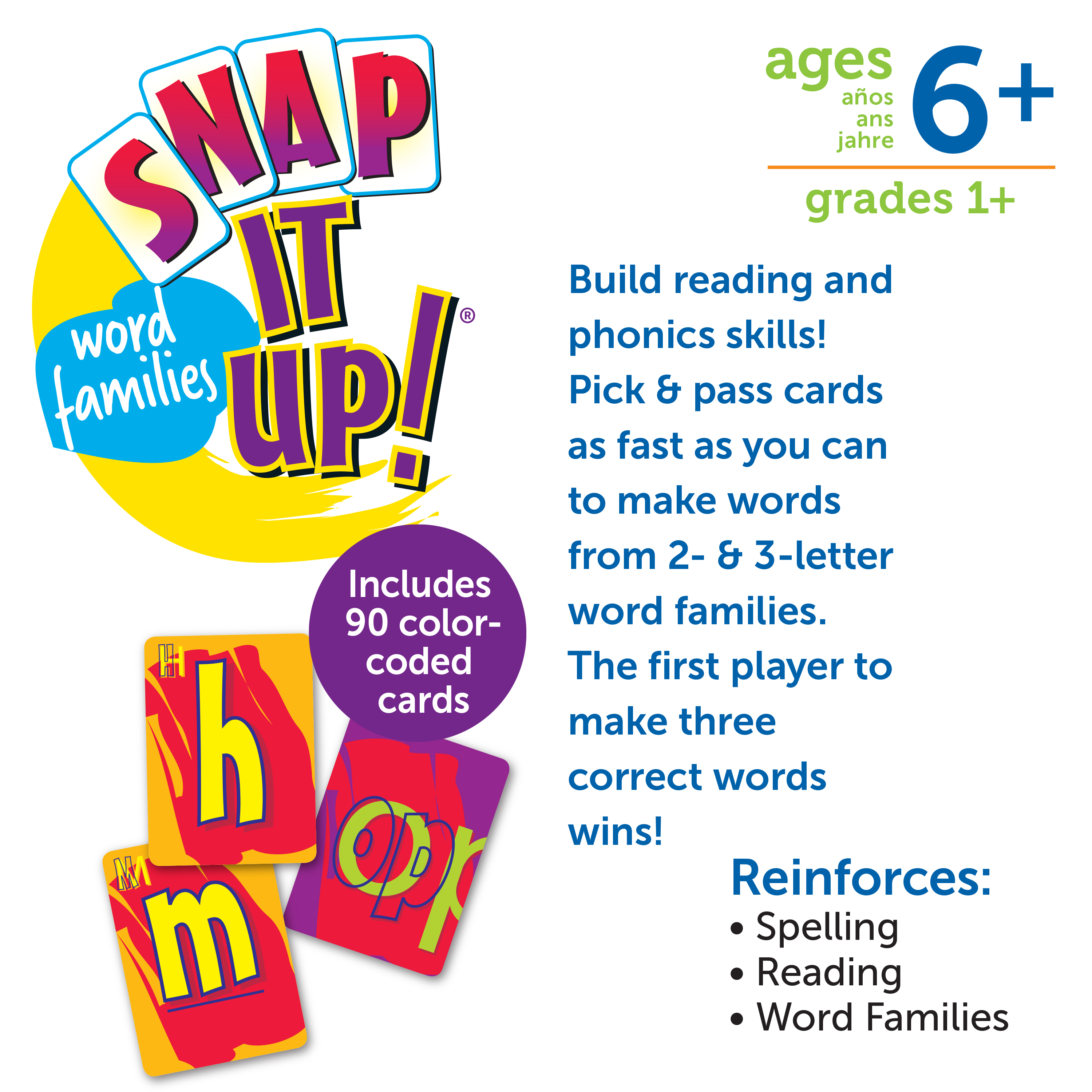 SKU LER3043 Product Title SNAP IT UP PHONICS Brand Name Learning Resources UPC 765023030433 Piece Count 1 Min Target Age 6 Max Target Age 10 TargetGradeMax Fifth Grade TargetGradeMin First Grade ProductCategoryProductLine Language & Letters Games ProductCategorySubject Games Port of Exit CNYTN Country of Origin CHN Unit Height 1.1 Unit Length 8 Unit Weight 0.5 Unit Width 4.9 Long Description - DC This exciting, fast-paced card game provides kids with hard-hitting practice in reading skills! Players pick and pass cards quickly to make words from 1 and 3-letter word families. The first player to make 3 correct words wins. So much fun, kids will want to snap it up again and again! CA prop 65 No Case Height 10.8 Case Length 14.6 Case Quantity 24 Case Weight 12.65 CPQ 0.66 Includes Remote No Marble Warning No MSRP 11.99 Small Ball Warning No Small Parts Warning No