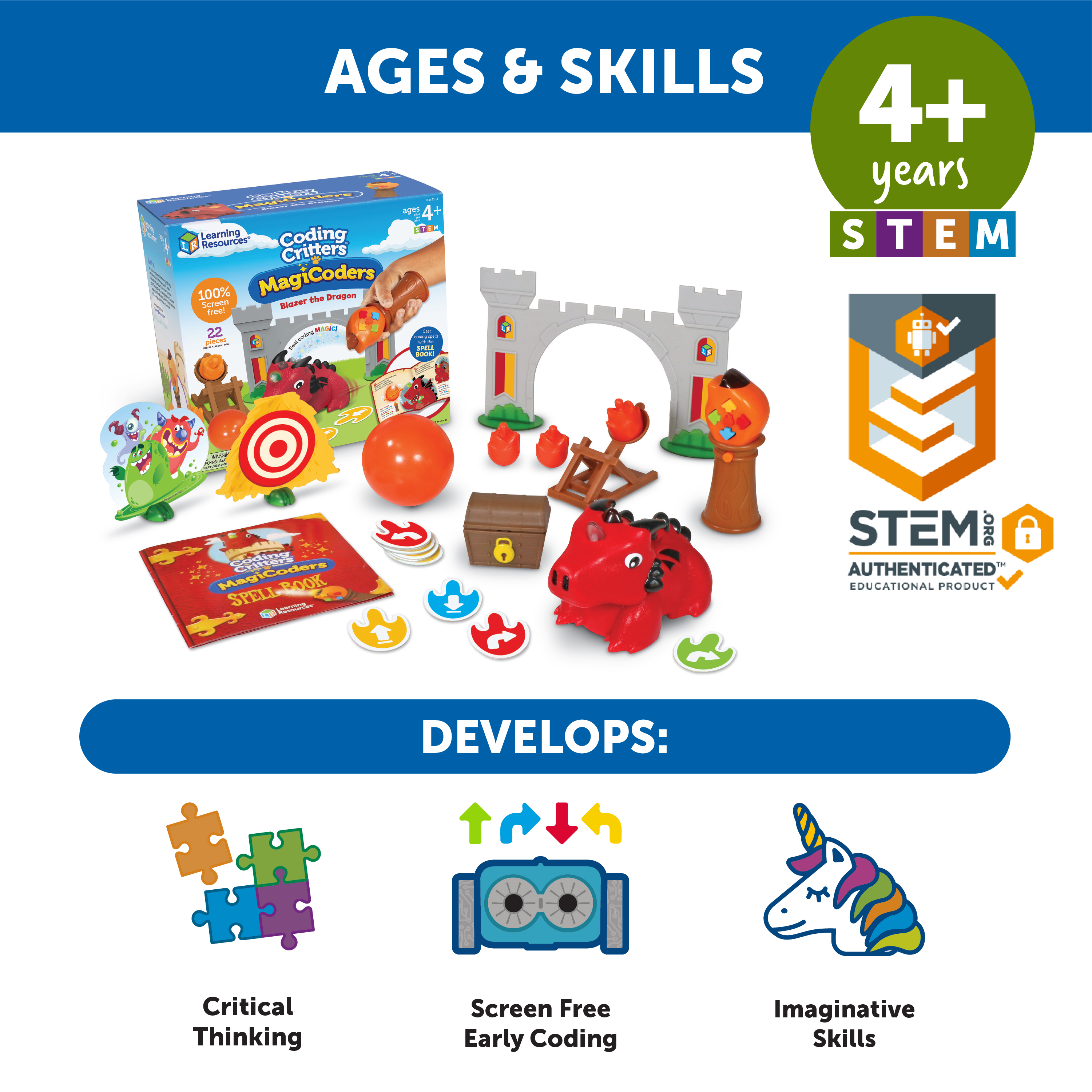 SKU LER3104 Product Title CODING CRITTERS® MAGICODERS: BLAZER Brand Name Learning Resources UPC 765023831047 Piece Count 22 Min Target Age 4 Max Target Age 99 TargetGradeMax No Grade TargetGradeMin Pre-K ProductCategoryProductLine Coding Critters ProductCategorySubject Coding Port of Exit CNYTN Country of Origin CHN Unit Height 5.25 Unit Length 8.9 Unit Weight 1.6 Unit Width 10 Long Description - DC Meet Blazer the Dragon, your magical coding friend! Preschoolers discover the magic of 100% screen-free coding with this pet dragon who's ready for early STEM fun! Equipped with a magic wand remote and Blazer's coding spellbook, kids can cast 12 coding spells that make Blazer dance, light up, follow his ball, and more! Blazer's spellbook also comes with storybook coding challenges—can you code Blazer to restart the fire tornado, deliver missing party invitations, or knock down the wall of monsters? In addition to following along with the spellbook's coding challenges, you can also use the pet playset to design your own code games and more! Skye the Unicorn also doubles as cute interactive pets—kids can cast coding spells that help Skye eat a snack or get a good night's sleep. Whether they're casting coding spells or solving STEM challenges, kids can use the included magic wand remote to add a touch of fantasy fun to playtime! CA prop 65 No Case Height 10 Case Length 20.6 Case Quantity 6 Case Weight 11.35 CPQ 1.86 Includes Remote Yes Marble Warning No MSRP 62.99 Small Ball Warning No Small Parts Warning Yes