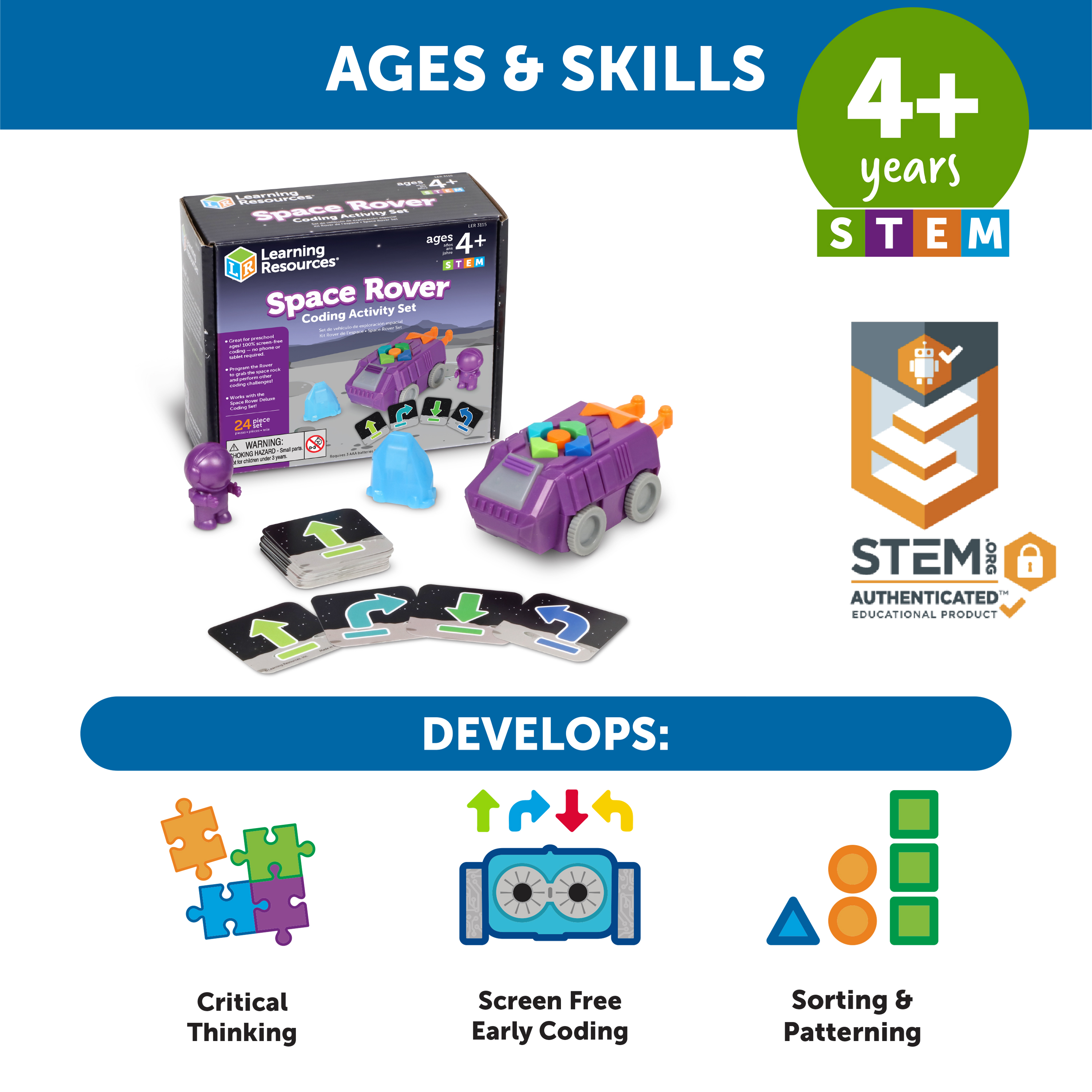 SKU LER3115 Product Title Space Rover Coding Set Brand Name Learning Resources UPC 765023031157 Piece Count 0 Min Target Age 4 Max Target Age 7 TargetGradeMax Second Grade TargetGradeMin Pre-K ProductCategoryProductLine Space Rover ProductCategorySubject Coding Port of Exit VNHPH Country of Origin VNM Unit Height 2.6 Unit Length 5.2 Unit Weight 0.65 Unit Width 6.3 CA prop 65 No Case Height 7.5 Case Length 10.9 Case Quantity 8 Case Weight 5.7 CPQ 0.51 Includes Remote No Marble Warning No MSRP 51.99 Small Ball Warning No Small Parts Warning Yes