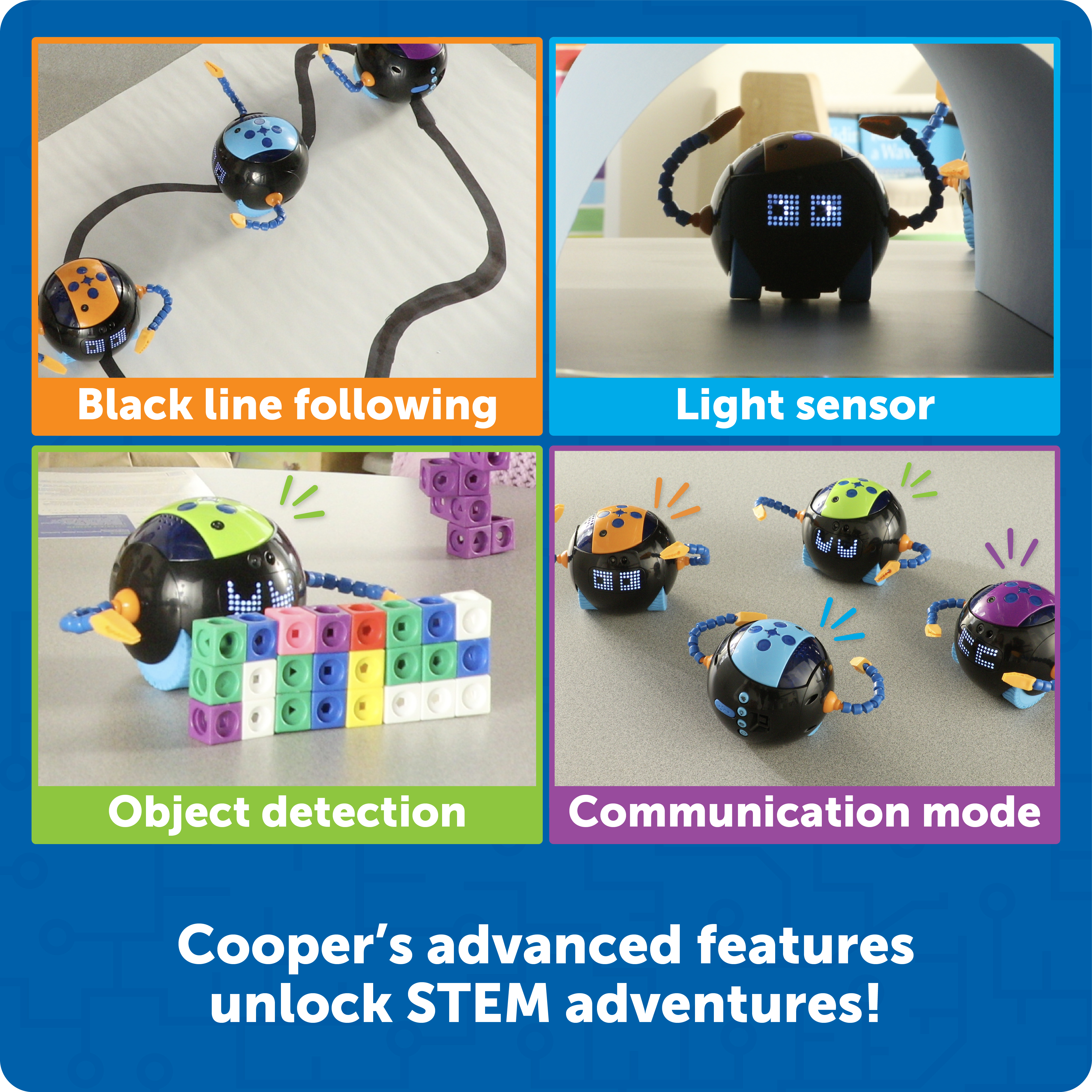 SKU LER3118 Product Title Cooper™ the STEM Robot Classroom Set Brand Name Learning Resources UPC 765023031188 Piece Count 6 Min Target Age 5 Max Target Age 10 TargetGradeMax Fifth Grade TargetGradeMin Kindergarten ProductCategoryProductLine Cooper ProductCategorySubject Coding Port of Exit CNYTN Country of Origin CHN Unit Height 13.7 Unit Length 5.7 Unit Weight 5.2 Unit Width 16.7 Short Description - DC Meet Cooper—the smart new STEM bot who's ready to code and collaborate! Each Cooper comes with multiple sensors that help him sense and explore the world during screen-free coding and STEM adventures. Solve coding challenges solo, or have your Coopers work together with the help of detailed small-group lesson plans—these bots can communicate with each other to plan and solve challenges, or just have fun! Best of all, Cooper is rechargeable right out of the box–no batteries required! Age 5+ | Grade K+ Long Description - DC The Cooper STEM Robot Classroom Pack gives kids an easy and fun way to learn early coding skills without screens. This set includes 4 rechargeable Cooper robots, USB‑C charging cords, and a storage case to keep everything organized for classroom use. Each robot can follow simple coding steps, sense light, move along paths, and interact with other Coopers, helping students understand cause and effect in a hands‑on way. Teachers can use Cooper to support lessons that build problem‑solving, teamwork, and basic STEM understanding. Kids enjoy seeing how their robot reacts as they test ideas and try new challenges. With simple buttons and guided activities, Cooper helps young learners build confidence as they explore coding for the first time. Batteries Needed Yes Battery Count 4 Battery Material Alkaline Battery Type NimH rechargeable CA prop 65 No Case Height 15 Case Length 6.1 Case Quantity 1 Case Weight 6.2 CPQ 0.93 Includes Remote No Marble Warning No MSRP 329.99 Power Source USB Batteries Small Ball Warning No Small Parts Warning No