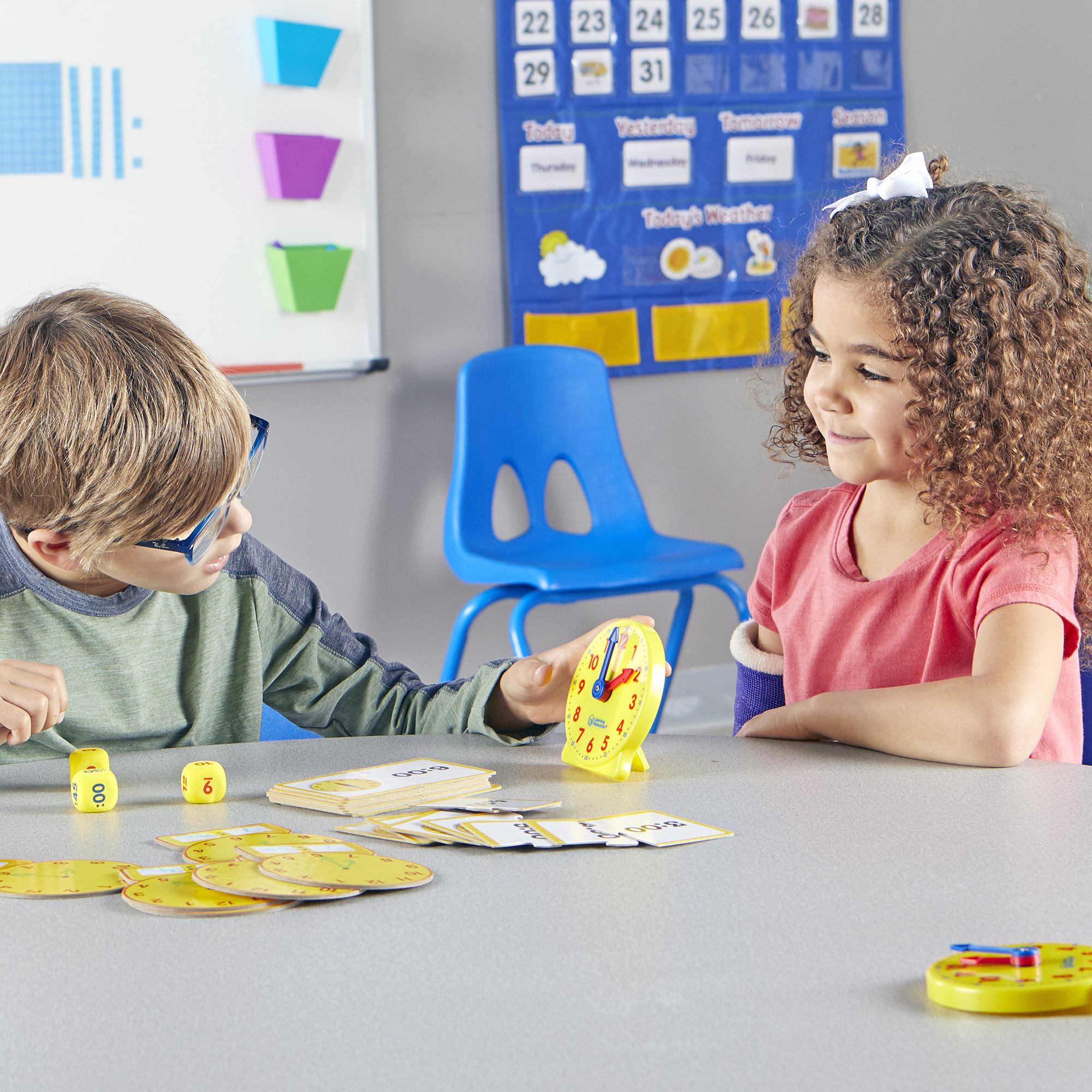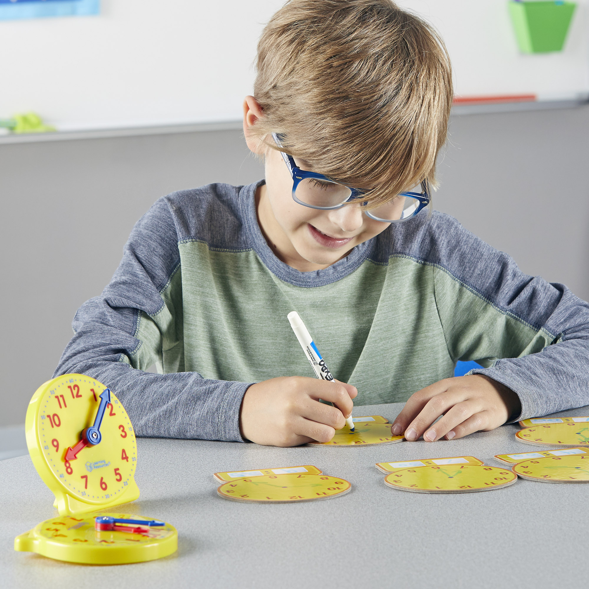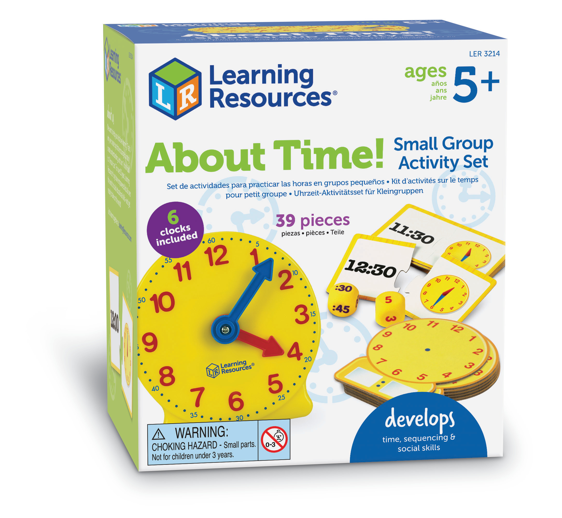 SKU LER3214 Product Title ABOUT TIME! SMALL GROUP ACTIVITY SET Brand Name Learning Resources UPC 765023032147 Piece Count 39 Min Target Age 5 Max Target Age 9 TargetGradeMax Fourth Grade TargetGradeMin Kindergarten ProductCategoryProductLine Time ProductCategorySubject Math Country of Origin CHN Unit Height 4.2 Unit Length 6.3 Unit Weight 1.1 Unit Width 5.6 Long Description - DC It's time to tell time! Help your class master analog time-telling skills with the About Time! Small Group Activity Set from Learning Resources. Inspired by our original Big Time Student Clocks, this classroom clock set features everything you need to turn learning to tell time into a game-like small-group activity. The About Time! Small Group Activity Set includes 12 clocks in total: 6 plastic mini clocks with movable second and minute hands, and 6 write-and-wipe teaching clocks that help students learn through hands-on drawing. In addition, About Time! Small Group Activity Set also includes 24 double-sided time cards and 3 time dice, as well as an activity guide filled with suggestions for how to get the most out of this classroom clock set. Lead simple lessons on the motion of a clock's hands, or roll the dice, call out a time, and have your students set the mini clocks themselves. The About Time! Small Group Activity Set makes learning time skills simple and fun. CA prop 65 No Case Height 13 Case Length 13 Case Quantity 6 Case Weight 4.95 CPQ 0.78 Includes Remote No Marble Warning No MSRP 27.99 Small Ball Warning No Small Parts Warning Yes
