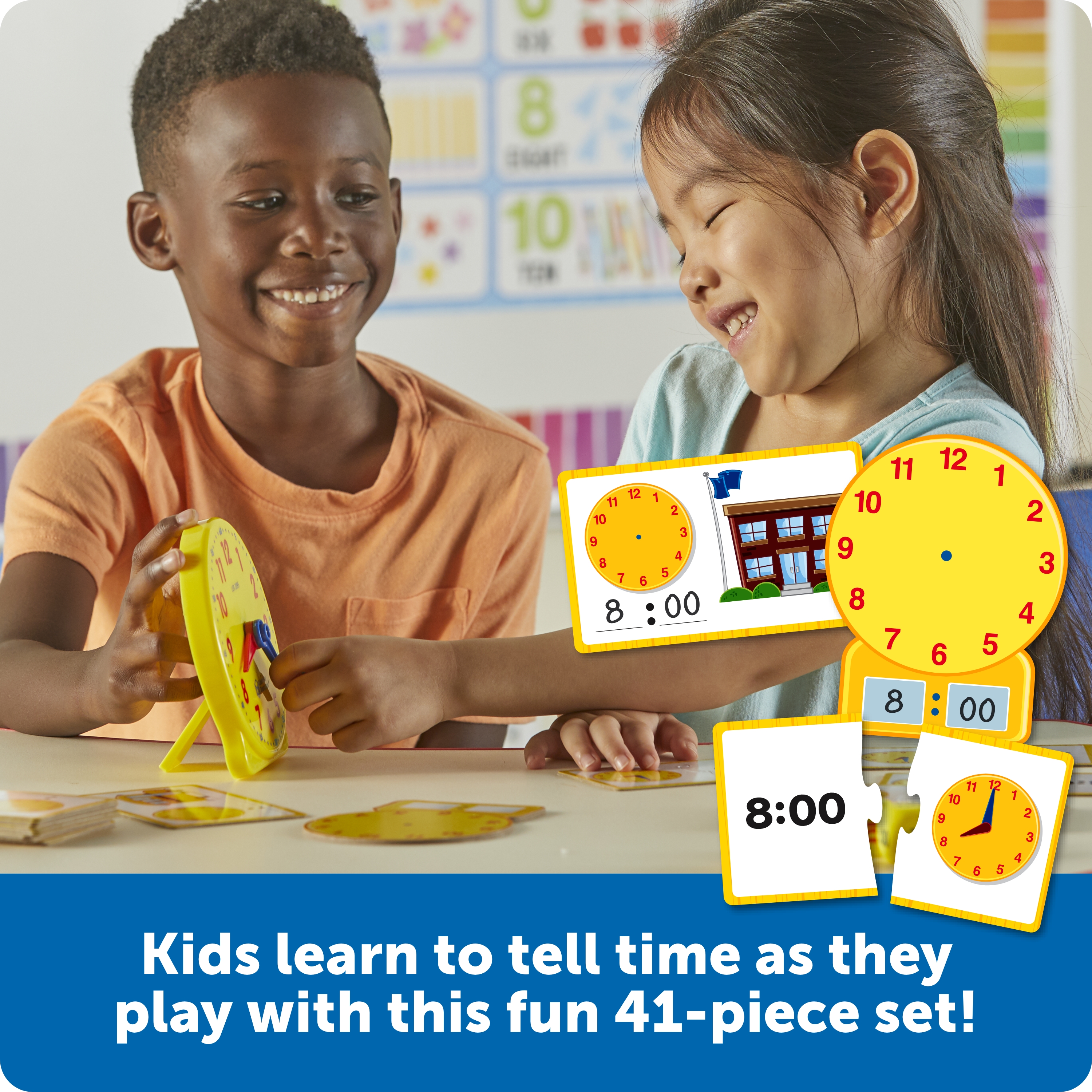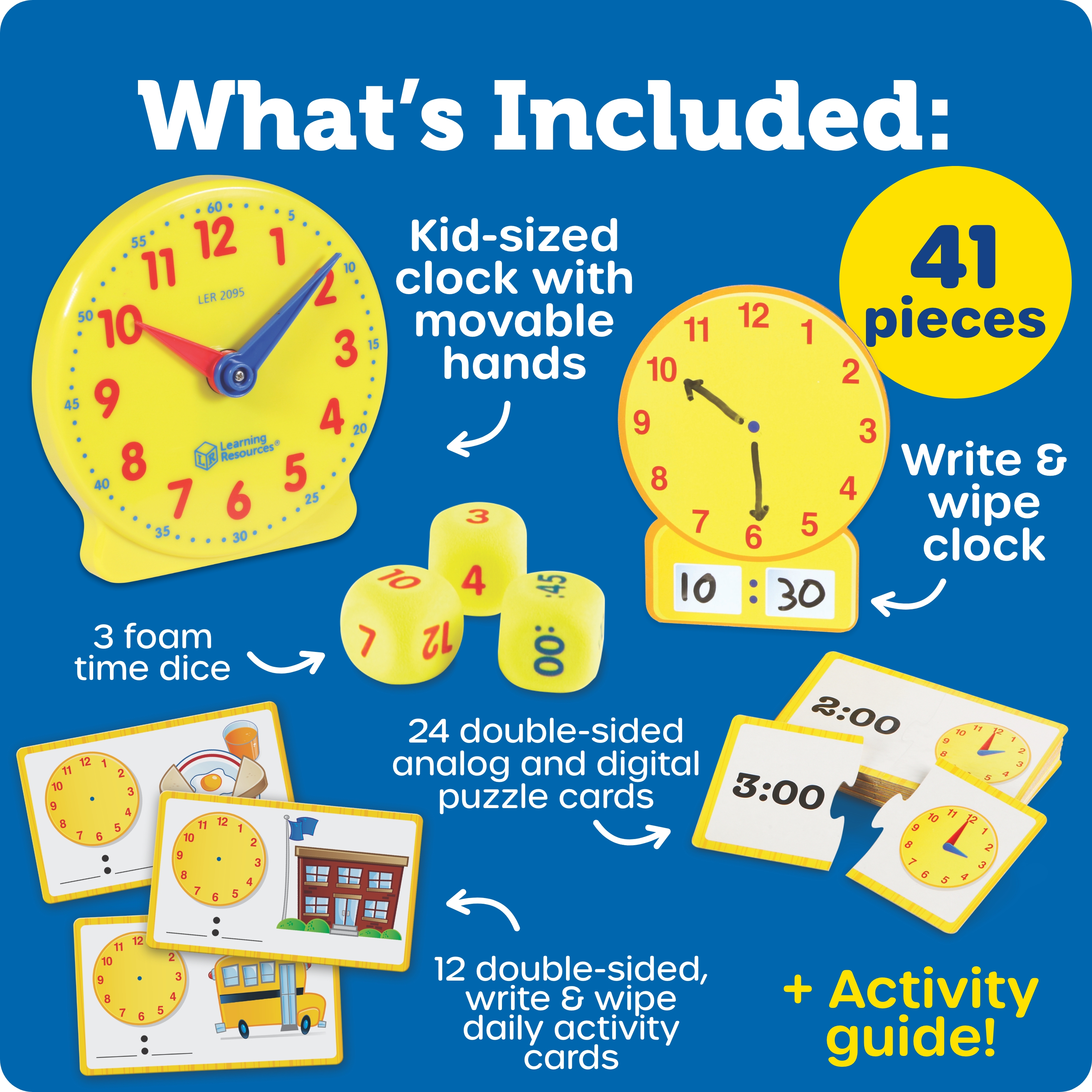 SKU LER3220 Product Title TIME ACTIVITY SET Brand Name Learning Resources UPC 765023832204 Piece Count 41 Min Target Age 5 Max Target Age 9 TargetGradeMax Fourth Grade TargetGradeMin Kindergarten ProductCategoryProductLine Time ProductCategorySubject Math Country of Origin CHN Unit Height 8.1 Unit Length 2.5 Unit Weight 1 Unit Width 10.1 Long Description - DC Make it easier for even your youngest students to learn about time and related concepts. Kit includes a clock and additional learning materials to help guide the lessons. This clock is great for getting your children or students learning Analog clocks! Appropriate for beginners and advanced learners. Ages 5+ CA prop 65 No Case Height 9.3 Case Length 11.1 Case Quantity 4 Case Weight 5.25 CPQ 0.65 Includes Remote No Marble Warning No MSRP 18.99 Small Ball Warning No Small Parts Warning Yes