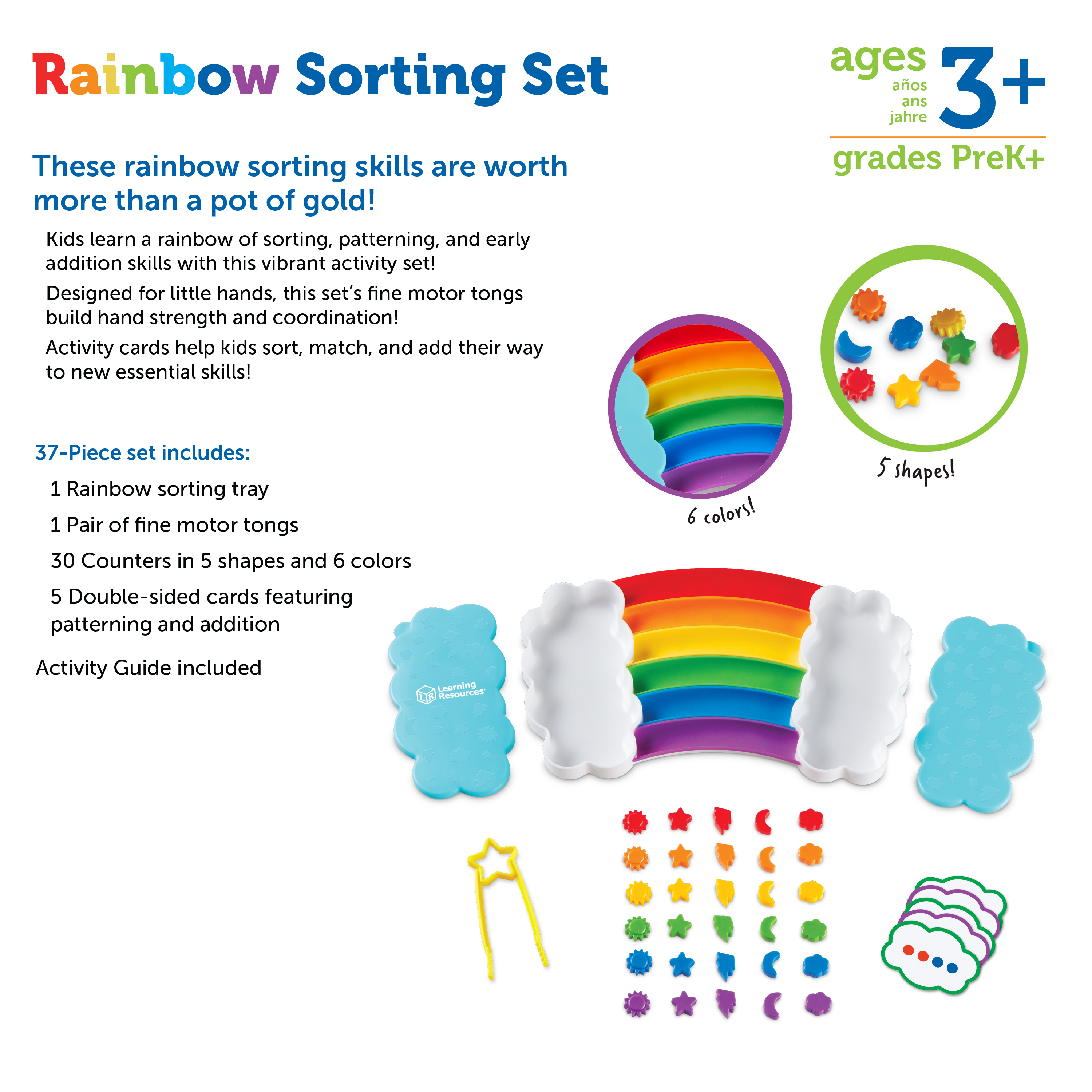 SKU LER3378 Product Title Rainbow Sorting Set Brand Name Learning Resources UPC 765023033786 Piece Count 37 Min Target Age 3 Max Target Age 5 TargetGradeMax Kindergarten TargetGradeMin Pre-K ProductCategorySubject Sorting & Matching Port of Exit VNHPH Country of Origin VNM Unit Height 7.6 Unit Length 1.4 Unit Weight 0.95 Unit Width 12.4 Short Description - DC Learn a rainbow of new color and sorting skills with the help of this vibrant activity tray! Grab the specially designed fine motor tongs, then sort and match the set's 30 counters by 5 shapes (sun, star, cloud, moon, lightning bot) or 6 colors (red, orange, yellow, green, blue, purple). Assembled tray measures 12.25"L x 7.5"H, and comes with slots for all six colors. Long Description - DC Learn a rainbow of new color and sorting skills with the help of this vibrant activity tray! Grab the specially designed fine motor tongs, then sort and match the set's 30 counters by 5 shapes (sun, star, cloud, moon, lightning bot) or 6 colors (red, orange, yellow, green, blue, purple). Assembled tray measures 12.25"L x 7.5"H, and comes with slots for all six colors. CA prop 65 No Case Height 8.4 Case Length 12 Case Quantity 8 Case Weight 6.9 CPQ 0.75 Includes Remote No Marble Warning No MSRP 22.99 Small Ball Warning No Small Parts Warning Yes