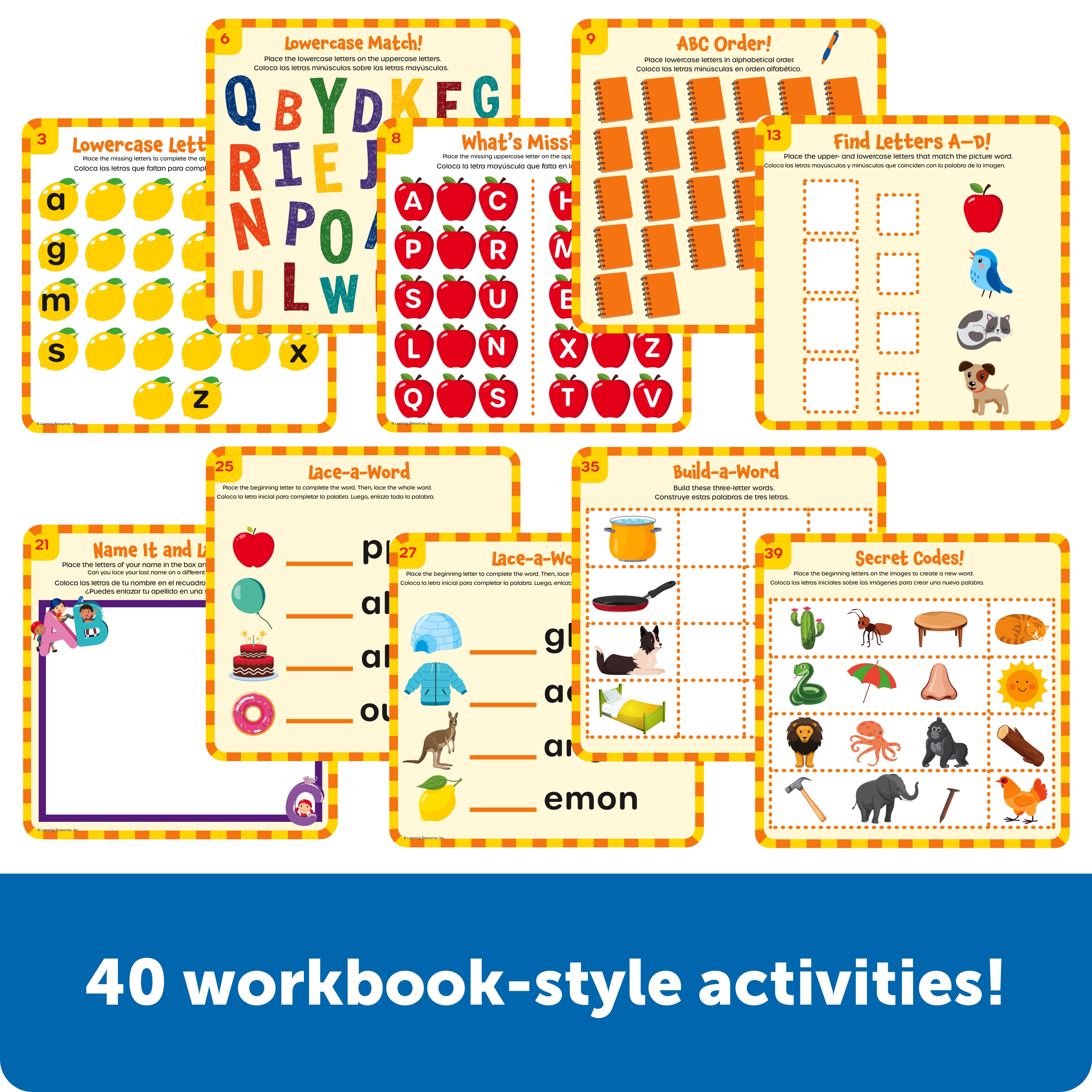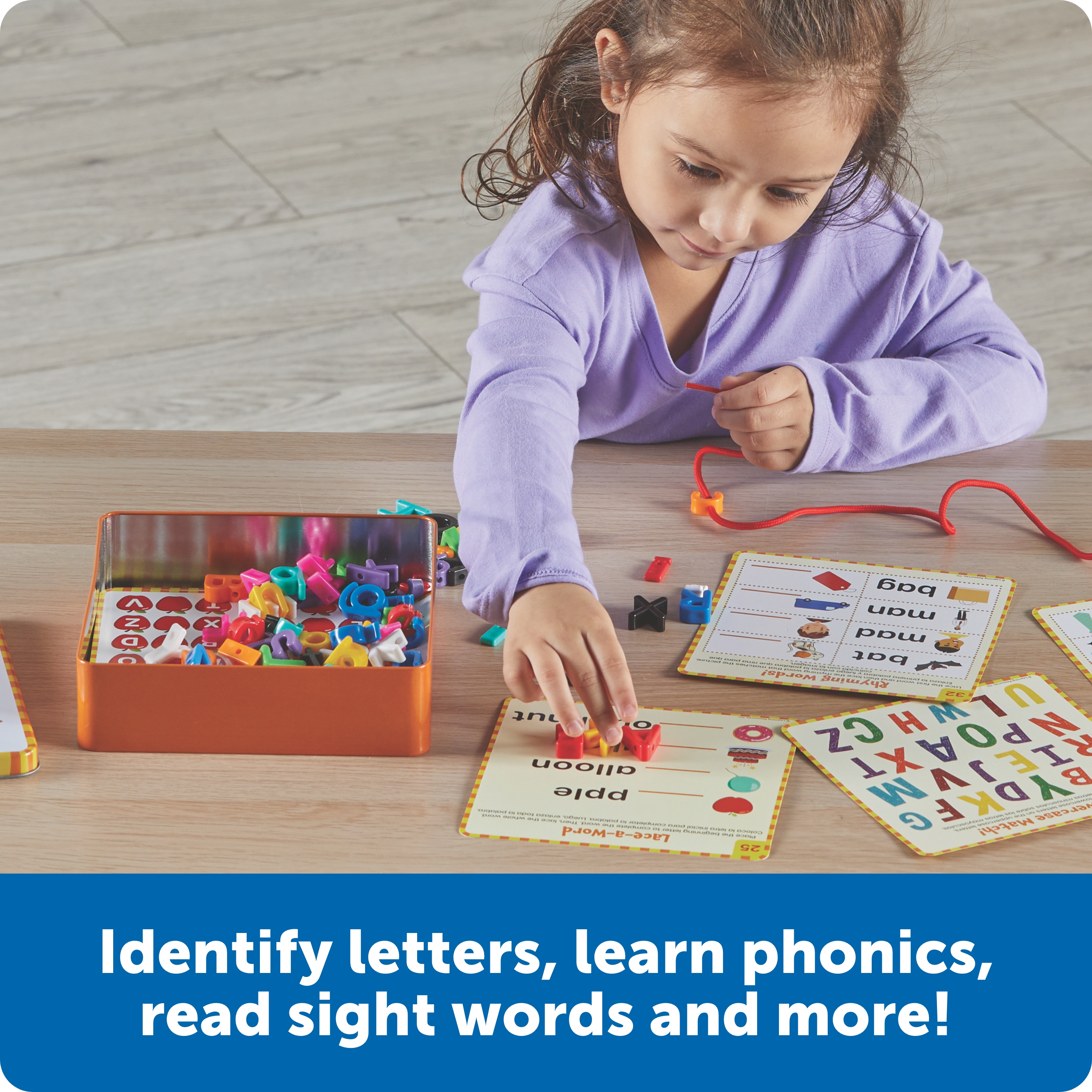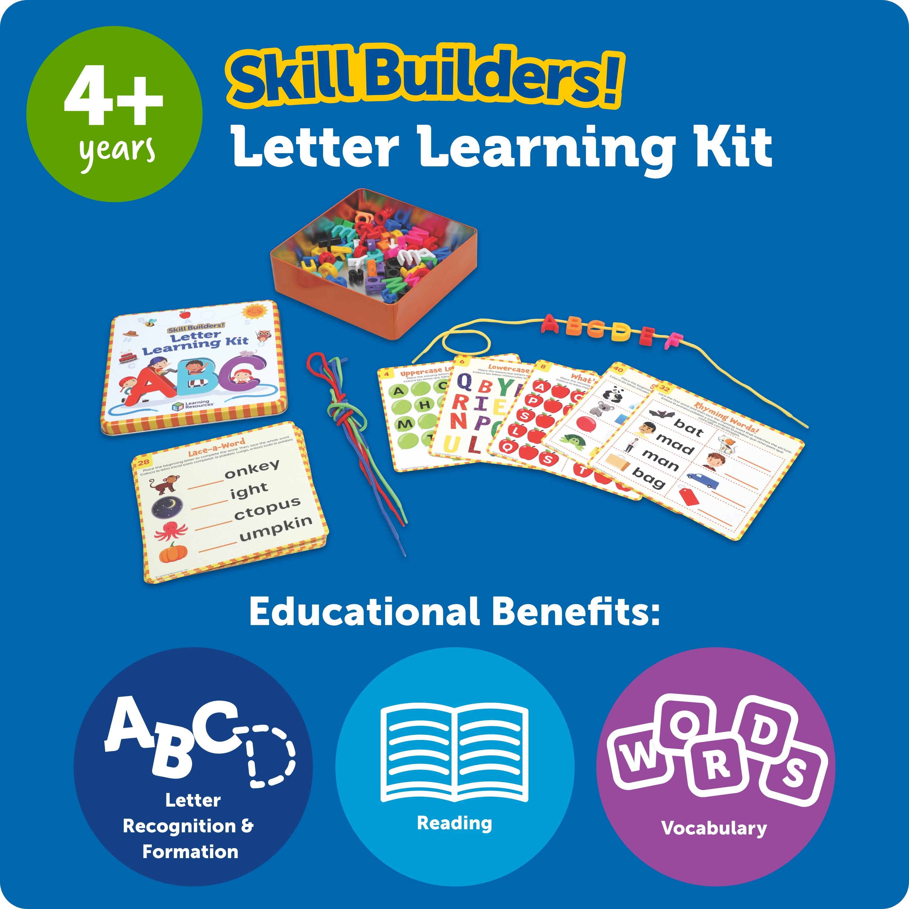 SKU LER3385 Product Title Skillbuilders! Letter Learning Kit Brand Name Learning Resources UPC 765023033854 Piece Count 102 Min Target Age 4 Max Target Age 10 TargetGradeMax Fifth Grade TargetGradeMin Pre-K ProductCategoryProductLine Skill Builders! ProductCategorySubject Workbooks & Kits Port of Exit CNNGB Country of Origin CHN Unit Height 2.2 Unit Length 7 Unit Weight 1.1 Unit Width 7.2 Short Description - DC Hands-on toys meet school-ready learning activities in one compact package! This set's 72 lacing letters and 40 workbook-style activities help kids build essential language skills: learn phonics, spelling, sight words, and more! Each set comes with a carrying case for easy cleanup or on-the-go play. Age 4+ | Grade PreK+ Long Description - DC Hands-on toys meet school-ready learning activities in one compact package! This set's 72 lacing letters and 40 workbook-style activities help kids build essential language skills: learn phonics, spelling, sight words, and more! Each set comes with a carrying case for easy cleanup or on-the-go play. Age 4+ | Grade PreK+ CA prop 65 No Case Height 8.2 Case Length 7.7 Case Quantity 4 Case Weight 4.75 CPQ 0.34 Includes Remote No Marble Warning No MSRP 17.99 Small Ball Warning No Small Parts Warning Yes
