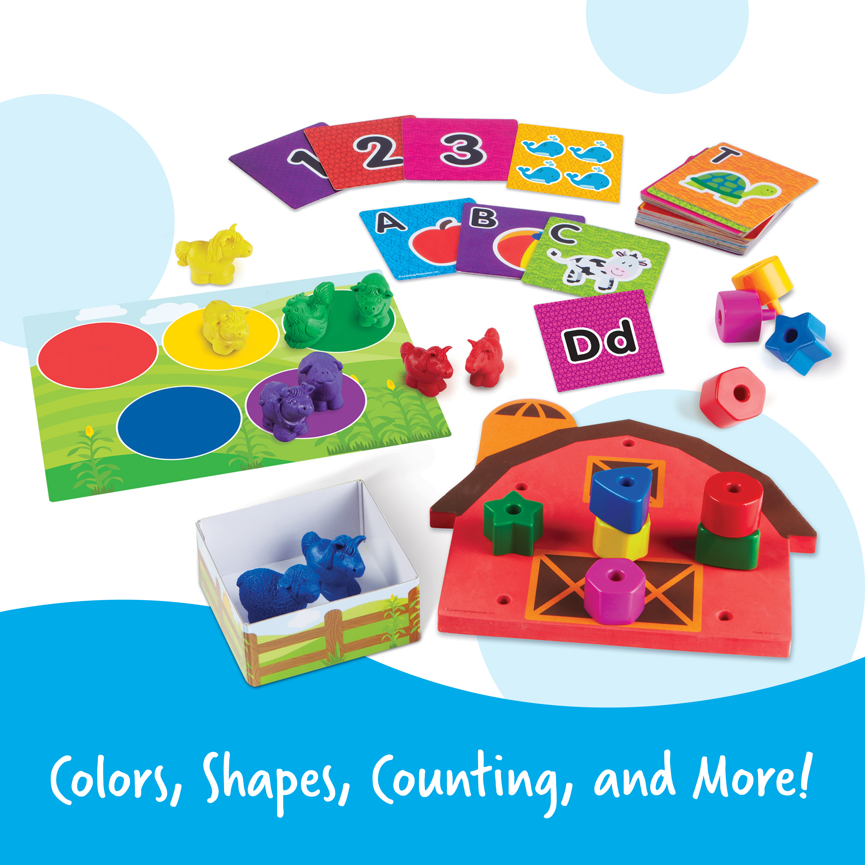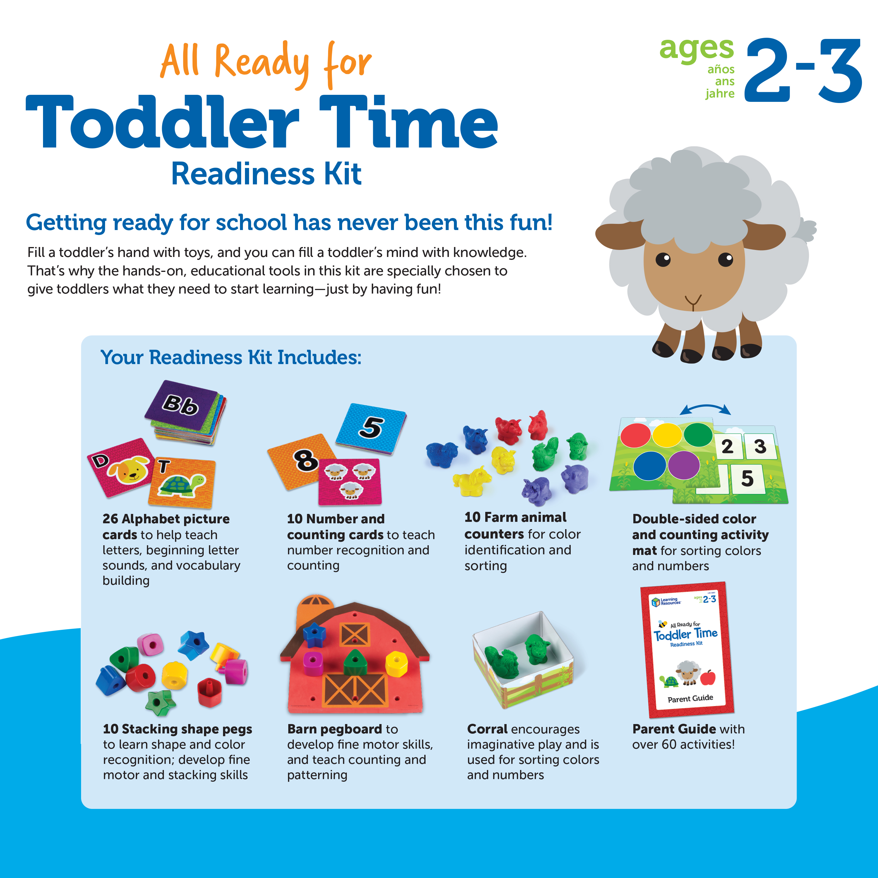 SKU LER3483 Product Title ALL READY FOR TODDLER TIME READINESS KIT Brand Name Learning Resources UPC 765023034837 Piece Count 22 Min Target Age 2 Max Target Age 5 TargetGradeMax Kindergarten TargetGradeMin Toddler ProductCategorySubject Workbooks & Kits Port of Exit INMAA Country of Origin IND Unit Height 3.2 Unit Length 12.5 Unit Weight 1.95 Unit Width 10.4 Long Description - DC The youngest kids will learn key skills such as color identification, shapes, counting, and the alphabet with this engaging kit. Set includes 10 farm animal counters, double-sided foam mat with 10 stacking shape pegs, 26 alphabet picture cards, color and counting activity mat, and 20-page Parent Guide. Includes sturdy storage box. Ideal for ages 2 and up. CA prop 65 No Case Height 11 Case Length 13.9 Case Quantity 4 Case Weight 8.95 CPQ 1.21 Includes Remote No Marble Warning No MSRP 38.99 Small Ball Warning No Small Parts Warning No