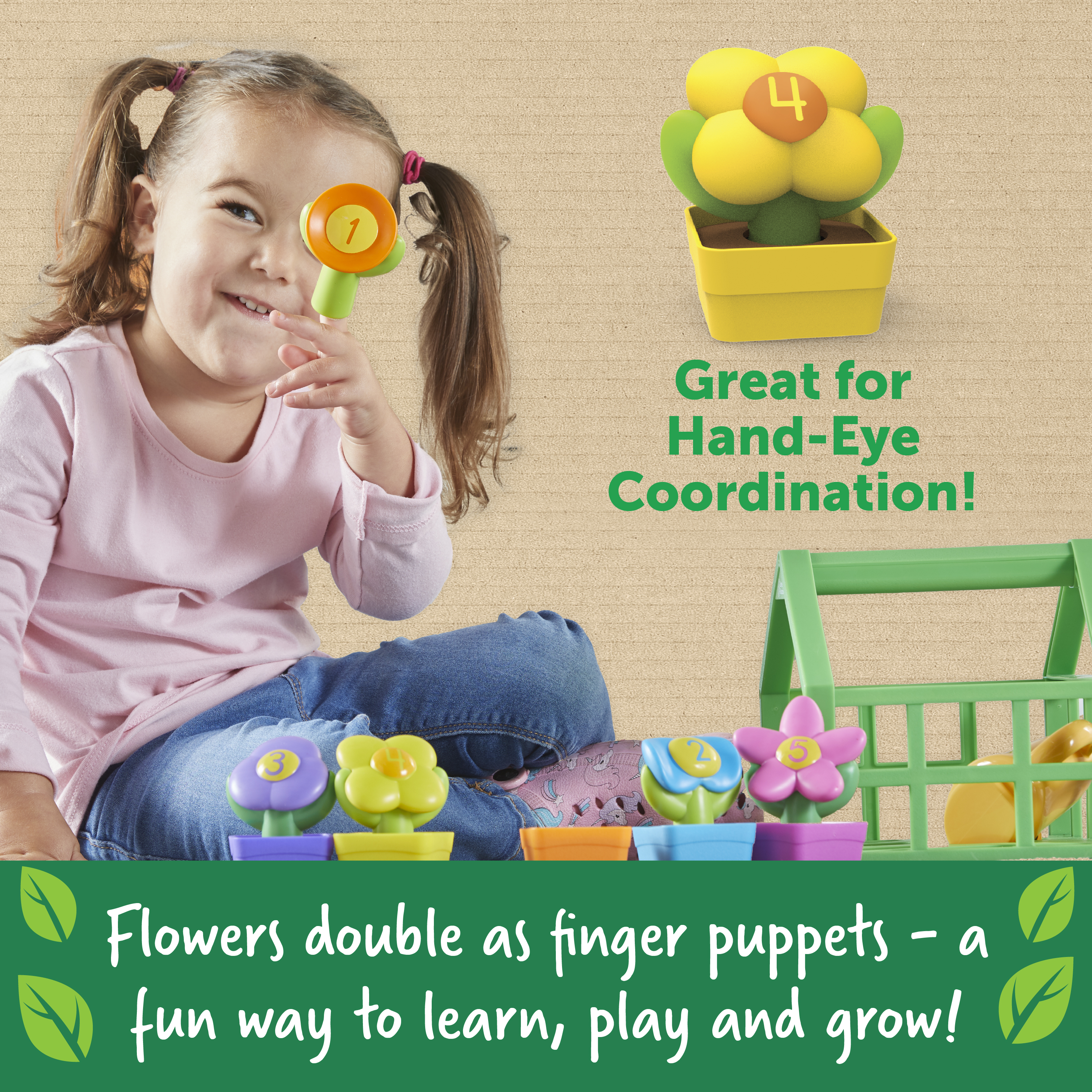 SKU LER3605 Product Title Growing Greenhouse Color & Number Playset Brand Name Learning Resources UPC 765023036053 Piece Count 12 Min Target Age 1.5 Max Target Age 99 TargetGradeMax Adult TargetGradeMin Toddler ProductCategorySubject Sorting & Matching Port of Exit CNYTN Country of Origin CHN Unit Height 7.1 Unit Length 7 Unit Weight 1.65 Unit Width 9.9 Short Description - DC In this greenhouse, we grow new preschool skills! Kids learn color and counting skills as they sort, match, and count the flowers and their pots in the Growing Greenhouse Color & Number Playset, one of the preschool learning toys from Learning Resources. This garden-fresh educational toy gives kids numerous ways to learn and grow—count the flower’s petals or the numbers on their centers, match them by color to the corresponding pot, or grab the watering can for an imaginative gardening session. Plus—this toddler toy’s watering can really works! This preschool learning toy’s pots and flowers store inside the greenhouse for on-the-go fun—grab the kid-sized handle and take the play outside! Best of all, each piece in the Growing Greenhouse Color & Number Playset is made with 70% recycled plastic—it's a more sustainable way to play! The Growing Greenhouse Color & Number Playset also includes an Activity Guide filled with kid-friendly sustainability facts and preschool learning activities that help kids discover new ways to keep things green. Long Description - DC In this greenhouse, we grow new preschool skills! Kids learn color and counting skills as they sort, match, and count the flowers and their pots in the Growing Greenhouse Color & Number Playset, one of the preschool learning toys from Learning Resources. This garden-fresh educational toy gives kids numerous ways to learn and grow—count the flower’s petals or the numbers on their centers, match them by color to the corresponding pot, or grab the watering can for an imaginative gardening session. Plus—this toddler toy’s watering can really works! This preschool learning toy’s pots and flowers store inside the greenhouse for on-the-go fun—grab the kid-sized handle and take the play outside! Best of all, each piece in the Growing Greenhouse Color & Number Playset is made with 70% recycled plastic—it's a more sustainable way to play! The Growing Greenhouse Color & Number Playset also includes an Activity Guide filled with kid-friendly sustainability facts and preschool learning activities that help kids discover new ways to keep things green. When you buy sustainable products from Learning Resources, you're buying educational toys and tools that stand the test of time. Our durable, timeless toys are made for generations of learning fun in homes and classrooms. From reducing our packaging footprint to introducing products made of recycled plastic, we've designed these toys to make your kids’ world a brighter, healthier place to learn, play, and grow. We're Learning Resources, and learning is where we play. With nearly 40 years of experience, our family-owned company’s mission is founded on offering kids educational toys for infinite inspiration to succeed in school and beyond. From ABCs and 123s to fine motor and STEM, our award-winning educational toys help kids discover countless ways to develop a lifelong love of learning while they build new skills. In 2022, Learning Resources expanded this dedication to learning and enrichment with Brightkins, a line of interactive pet training tools and toys that help families discover bright ways for pets to play! CA prop 65 No Case Height 15.1 Case Length 10.5 Case Quantity 4 Case Weight 7.5 CPQ 1.35 Includes Remote No Marble Warning No MSRP 26.99 Small Ball Warning No Small Parts Warning No