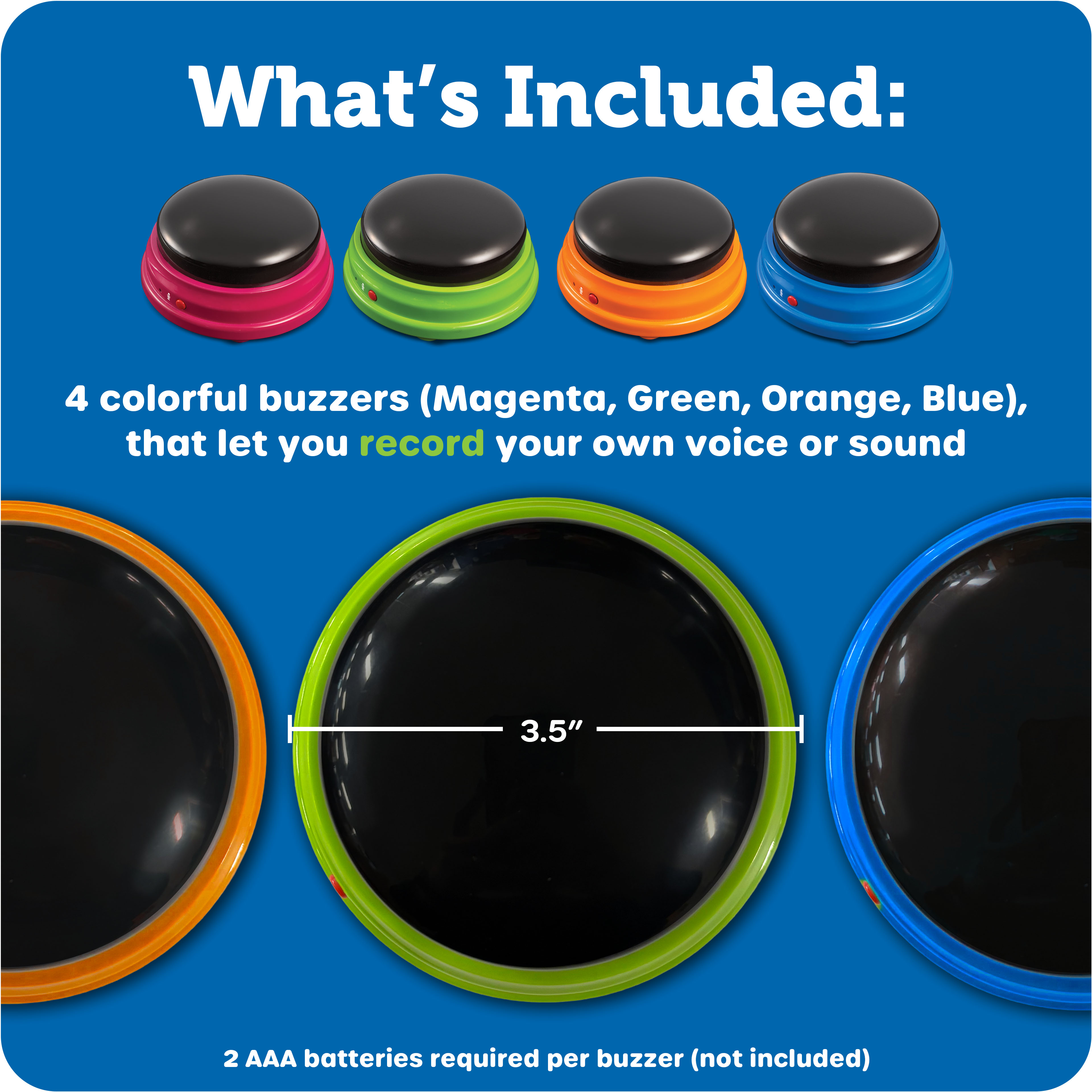SKU LER3769 Product Title RECORDABLE ANSWER BUZZERS Brand Name Learning Resources UPC 765023837698 Piece Count 4 Min Target Age 3 Max Target Age 7 TargetGradeMax Second Grade TargetGradeMin Toddler ProductCategoryProductLine Answer Buzzers ProductCategorySubject Games Port of Exit CNYTN Country of Origin CHN Unit Height 1.9 Unit Length 7.7 Unit Weight 0.85 Unit Width 7.7 Long Description - DC Engage even non-verbal students in classroom activities – they can tap in with their own recorded sounds. Record up to 7 seconds per buzzer- just tap, record, tap, and listen. 4 buzzers come in 4 colors and include activity guide. Just tap, record, tap, and listen! Great for the whole class or for engagement in small groups. Ages 3+ CA prop 65 No Case Height 8.8 Case Length 8.3 Case Quantity 6 Case Weight 4.15 CPQ 0.51 Includes Remote No Marble Warning No MSRP 29.99 Small Ball Warning No Small Parts Warning No