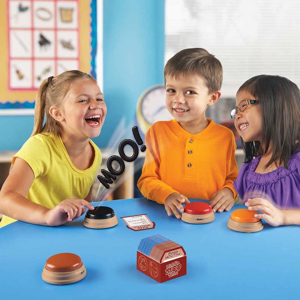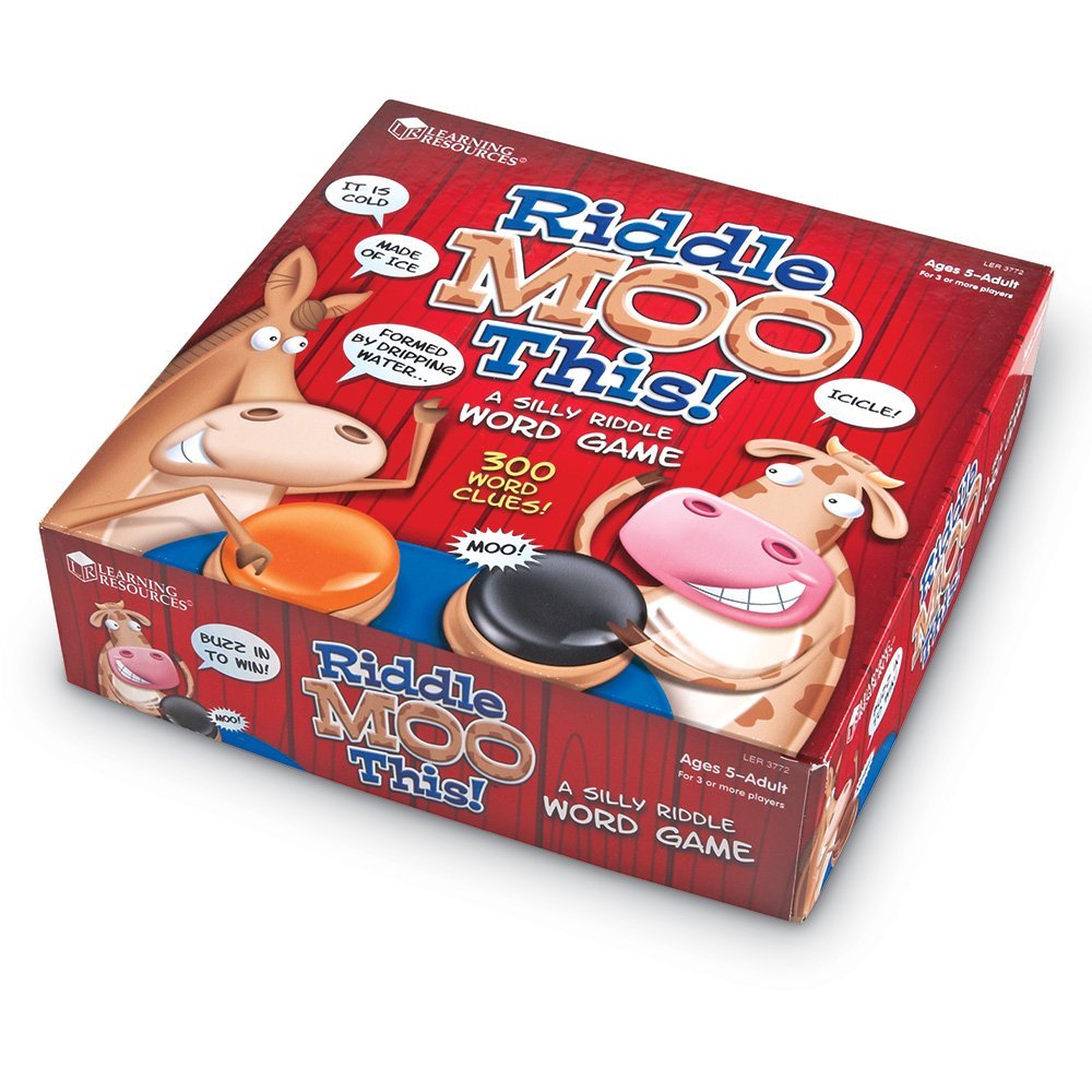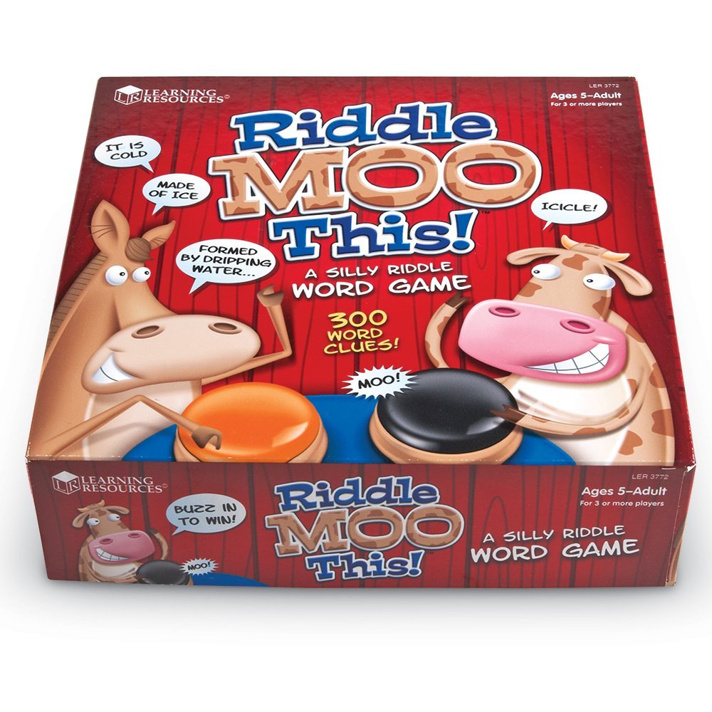 SKU LER3772 Product Title RIDDLE MOO THIS (TM) Brand Name Learning Resources UPC 765023837728 Piece Count 154 Min Target Age 5 Max Target Age 9 TargetGradeMax Fourth Grade TargetGradeMin Kindergarten ProductCategoryProductLine Language & Letters Games ProductCategorySubject Games Port of Exit CNYTN Country of Origin CHN Unit Height 3 Unit Length 10 Unit Weight 1.69 Unit Width 10 Long Description - DC Build deductive reasoning skills and vocabulary with this silly game. Read the riddle cards out loud and buzz in if you know the answer. Features 2 levels of play. Includes 4 animal-sound buzzers and 150 double-sided cards. Buzzers require 2 AAA batteries, not included. CA prop 65 No Case Height 9.375 Case Length 20.625 Case Quantity 6 Case Weight 11.36 CPQ 1.19 Includes Remote No Marble Warning No MSRP 36.99 Small Ball Warning No Small Parts Warning No