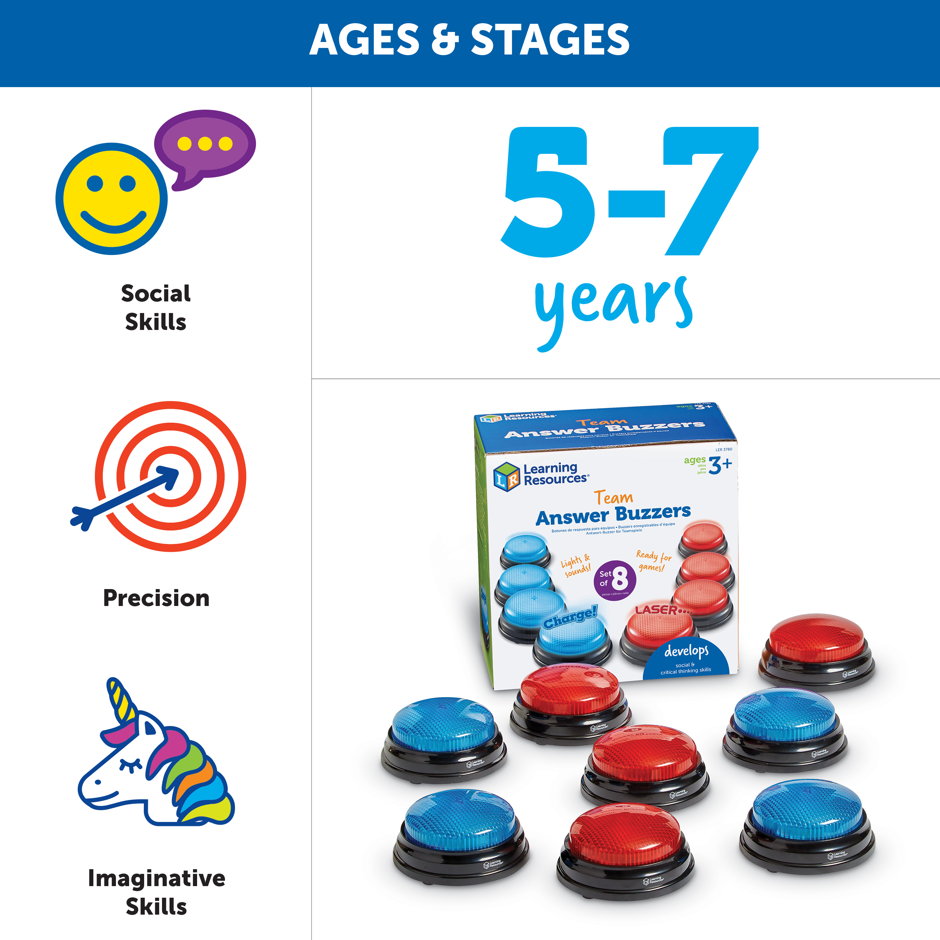 SKU LER3780 Product Title TEAM ANSWER BUZZERS Brand Name Learning Resources UPC 765023037807 Piece Count 8 Min Target Age 3 Max Target Age 99 TargetGradeMax No Grade TargetGradeMin Toddler ProductCategoryProductLine Answer Buzzers ProductCategorySubject Games Port of Exit CNYTN Country of Origin CHN Unit Height 3.8 Unit Length 7.4 Unit Weight 1.5 Unit Width 7.4 Long Description - DC Turn everyday quizzes into fun game-show-style competitions! Buzz in and win with team games in the home or classroom with this set of Team Answer Buzzers from Learning Resources! This set comes with 8 game buzzers: 4 for the red team, and 4 for the blue team. Once you've settled on teams for classroom game shows or at-home game nights, you'll always know who's buzzing in: each team’s buzzers make unique sounds that are loud, clear, and easy to tell apart! In addition to adding a fun interactive element to classroom and at-home games, this set of Team Answer Buzzers also provides great opportunities for lessons in social skills like sportsmanship, turn-taking, and teamwork. Each durable game buzzer is powered by replaceable AAA batteries (sold separately), so they're ready for years of fast-paced, hands-on games for years and years to come! CA prop 65 No Case Height 8.6 Case Length 15.6 Case Quantity 4 Case Weight 6.65 CPQ 0.62 Includes Remote No Marble Warning No MSRP 45.99 Small Ball Warning No Small Parts Warning No