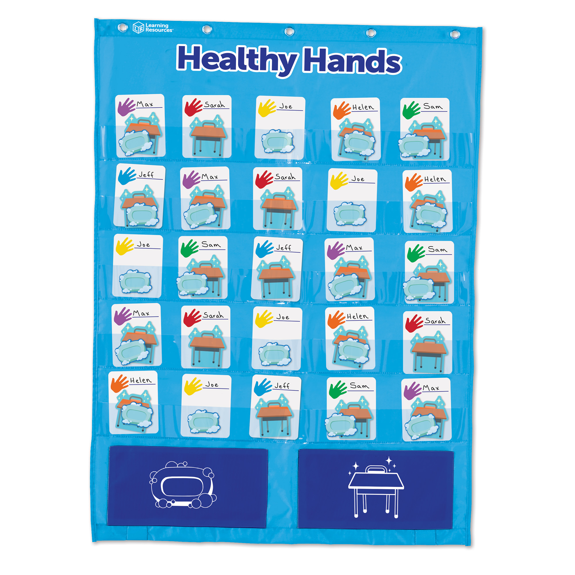 SKU LER4364 Product Title HEALTHY HANDS POCKET CHART Brand Name Learning Resources UPC 765023043648 Piece Count 97 Min Target Age 5 Max Target Age 10 TargetGradeMax Fifth Grade TargetGradeMin Kindergarten ProductCategoryProductLine Pocket Charts ProductCategorySubject Classroom Resources Port of Exit CNYTN Country of Origin CHN Unit Height 0.3 Unit Length 22.5 Unit Weight 0.85 Unit Width 12.5 Long Description - DC Healthy hands mean healthy classrooms! Help your students develop good hand-washing habits with the Healthy Hands Pocket Chart from Learning Resources. Inspired by our line of popular pocket charts, this essential classroom tool helps your track, reward, and encourage your students on their way to healthier hand hygiene. Each chart comes with spaces for 36 students, as well as 36 name cards ready to be customized to your classroom. The Healthy Hands Pocket Chart also includes 60 tracking cards that help kids visualize their new habits: drop in the bubbly bars of soap when students finish washing their hands, and add the squeaky clean desk card once their workspace is neat and tidy. Made of durable plastic with metal grommets that make hanging a snap, the Healthy Hands Pocket Chart is ready to help you and your students conquer cold and flu season for years to come. CA prop 65 No Case Height 5 Case Length 23.2 Case Quantity 12 Case Weight 11.8 CPQ 0.94 Includes Remote No Marble Warning No MSRP 19.99 Small Ball Warning No Small Parts Warning No
