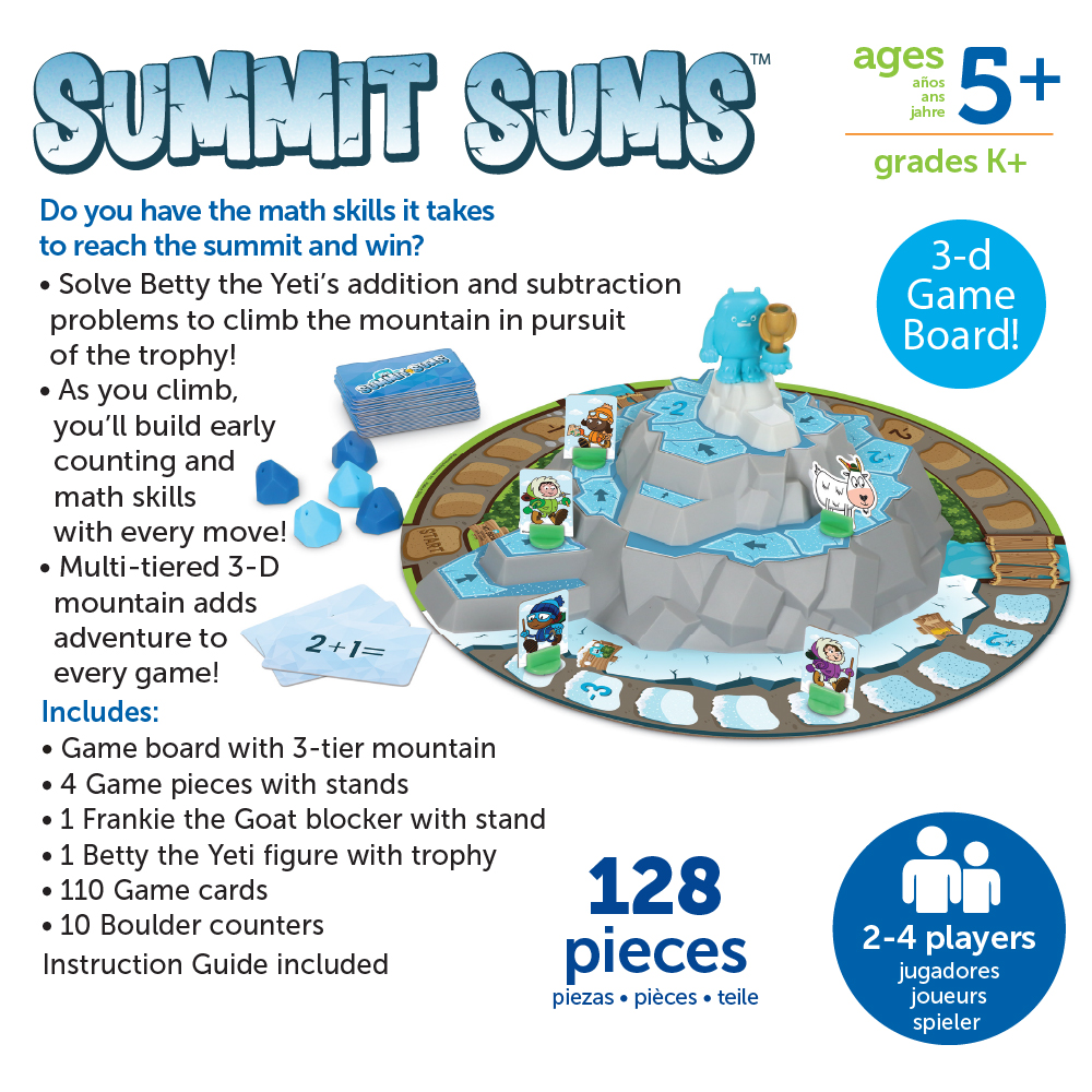 SKU LER5026 Product Title Summit Sums™ Brand Name Learning Resources UPC 765023050264 Piece Count 123 Min Target Age 5 Max Target Age 9 TargetGradeMax Fourth Grade TargetGradeMin Kindergarten ProductCategoryProductLine Math Games ProductCategorySubject Games Port of Exit VNHPH Country of Origin VNM Unit Height 2.6 Unit Length 10.1 Unit Weight 1.65 Unit Width 11.8 Short Description - DC Do you have the math skills it takes to reach the summit and win? Kids solve Betty the Yeti's addition and subtraction problems as they race their way up the multi-tiered 3-D mountain during rounds of Summit Sums, a math game from Learning Resources. As they make their way up the this educational game’s mountain, kids will draw Betty the Yeti’s equation cards—answer the addition or subtraction problem correctly to advance that number of spaces. Watch out, though—this math game mountain comes with its fair share of hazards, from gigantic boulders to that meddlesome Frankie the Goat, who’d love nothing more than to block the path of an advancing mountaineer! The first player to the top wins this educational game, and claims Betty the Yeti’s trophy for their very own! Designed for 2-4 players, this math game makes a great addition to family game night or classroom collections of board games for kids 4-8! Long Description - DC Do you have the math skills it takes to reach the summit and win? Kids solve Betty the Yeti's addition and subtraction problems as they race their way up the multi-tiered 3-D mountain during rounds of Summit Sums, a math game from Learning Resources. As they make their way up the this educational game’s mountain, kids will draw Betty the Yeti’s equation cards—answer the addition or subtraction problem correctly to advance that number of spaces. Watch out, though—this math game mountain comes with its fair share of hazards, from gigantic boulders to that meddlesome Frankie the Goat, who’d love nothing more than to block the path of an advancing mountaineer! The first player to the top wins this educational game, and claims Betty the Yeti’s trophy for their very own! Designed for 2-4 players, this math game makes a great addition to family game night or classroom collections of board games for kids 4-8! Whether they’re swatting their way to new sight word skills on family game night or maneuvering around a magical island filled with mathtastic challenges during a classroom game break, kids learn through play with every fun educational game from Learning Resources. In addition to building school-ready skills in letters, numbers, and STEM, our games also help kids develop the social skills they need to succeed in the classroom and beyond. With their durable, BPA-free plastic components, these educational games are ready for years of learning fun. We're Learning Resources, and learning is where we play. With nearly 40 years of experience, our family-owned company’s mission is founded on offering kids educational toys for infinite inspiration to succeed in school and beyond. From ABCs and 123s to fine motor and STEM, our award-winning educational toys help kids discover countless ways to develop a lifelong love of learning while they build new skills. In 2022, Learning Resources expanded this dedication to learning and enrichment with Brightkins, a line of interactive pet training tools and toys that help families discover bright ways for pets to play! CA prop 65 No Case Height 11.1 Case Length 12.2 Case Quantity 6 Case Weight 10.8 CPQ 1.28 Includes Remote No Marble Warning No MSRP 23.99 Small Ball Warning No Small Parts Warning Yes