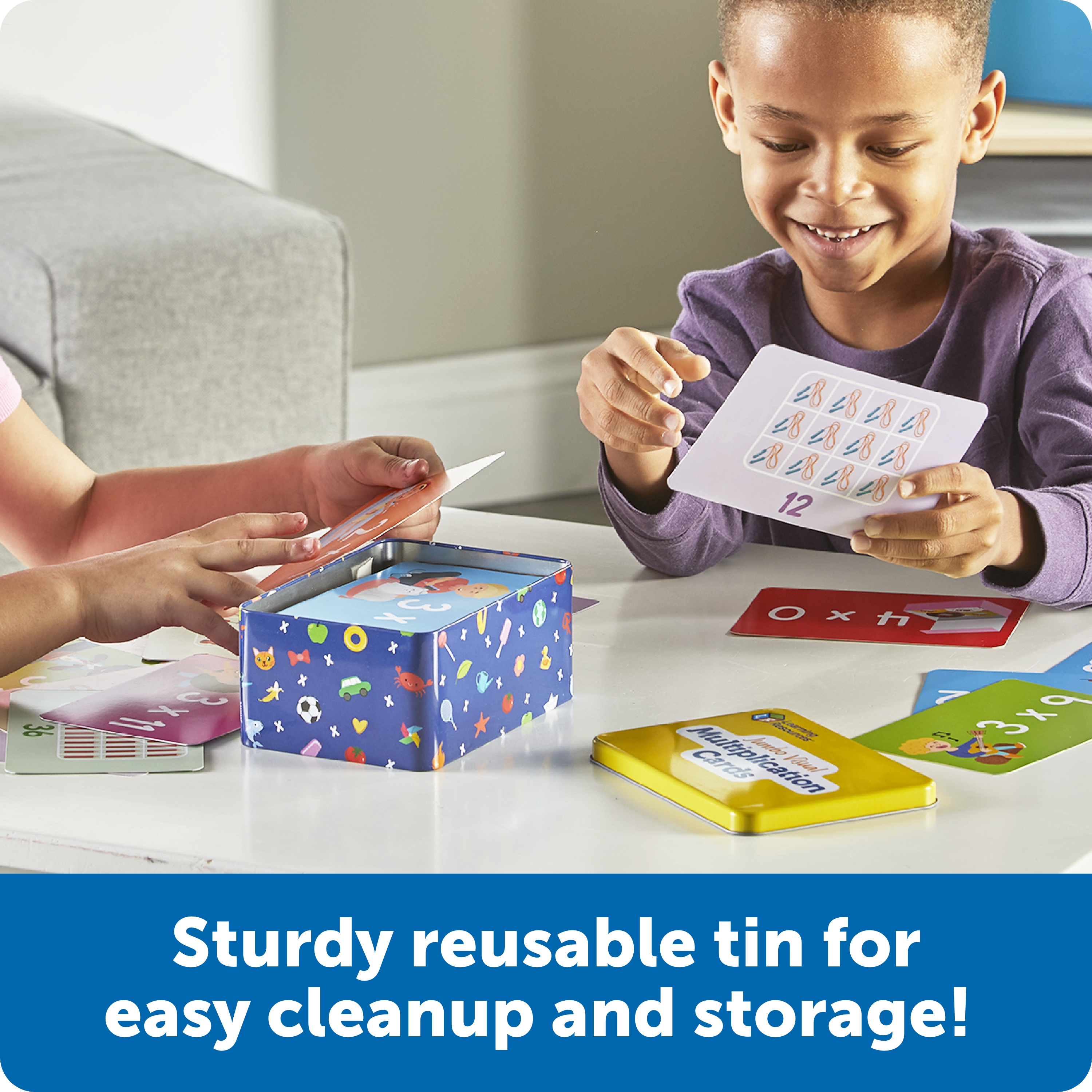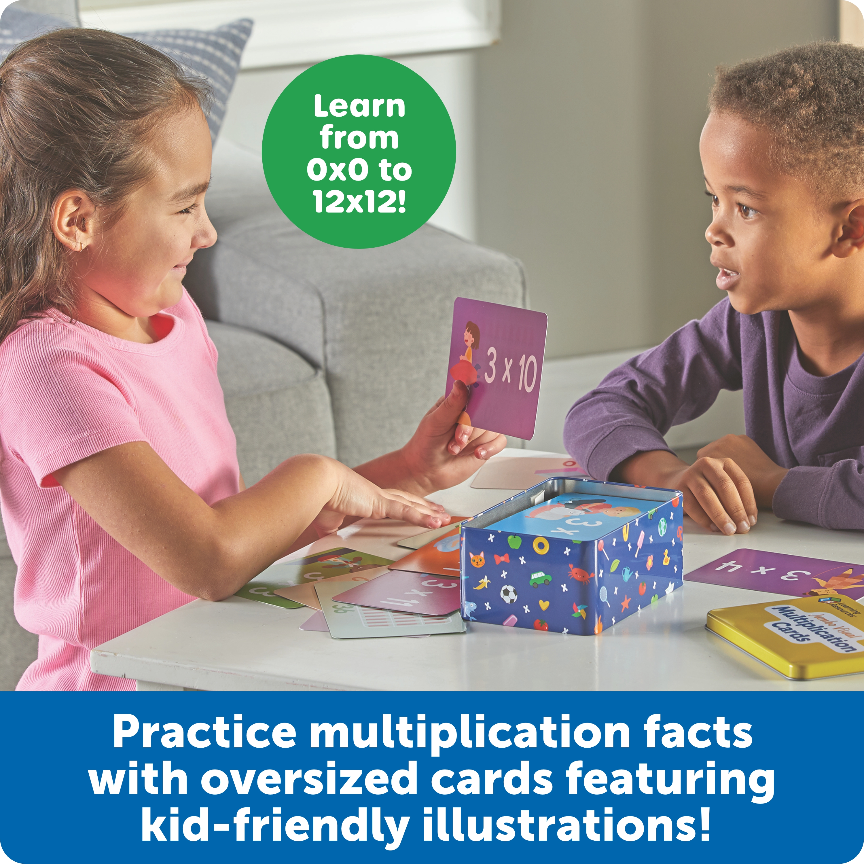 SKU LER5032 Product Title Jumbo Visual Multiplication Cards Brand Name Learning Resources UPC 765023050325 Piece Count 169 Min Target Age 7 Max Target Age 11 TargetGradeMax Sixth Grade TargetGradeMin Second Grade ProductCategorySubject Math Port of Exit CNNGB Country of Origin CHN Unit Height 2.9 Unit Length 4.8 Unit Weight 2.15 Unit Width 6.8 Short Description - DC Take a closer look at fact fluency with these extra-large, picture-packed multiplication cards! This set of 169 double-sided multiplication cards helps kids visualize math problems and learn fact families every time they play—solve the number-filled equation on one side, then flip the card over for illustrations corresponding to the answer. Cards measure 4" x 6", and include a reusable tin for easy cleanup and storage. Age 7+ | Grade 2+ Long Description - DC Take a closer look at fact fluency with these extra-large, picture-packed multiplication cards! This set of 169 double-sided multiplication cards helps kids visualize math problems and learn fact families every time they play—solve the number-filled equation on one side, then flip the card over for illustrations corresponding to the answer. Cards measure 4" x 6", and include a reusable tin for easy cleanup and storage. Age 7+ | Grade 2+ CA prop 65 No Case Height 7.8 Case Length 10.2 Case Quantity 8 Case Weight 18.1 CPQ 0.58 Includes Remote No Marble Warning No MSRP 19.99 Small Ball Warning No Small Parts Warning No
