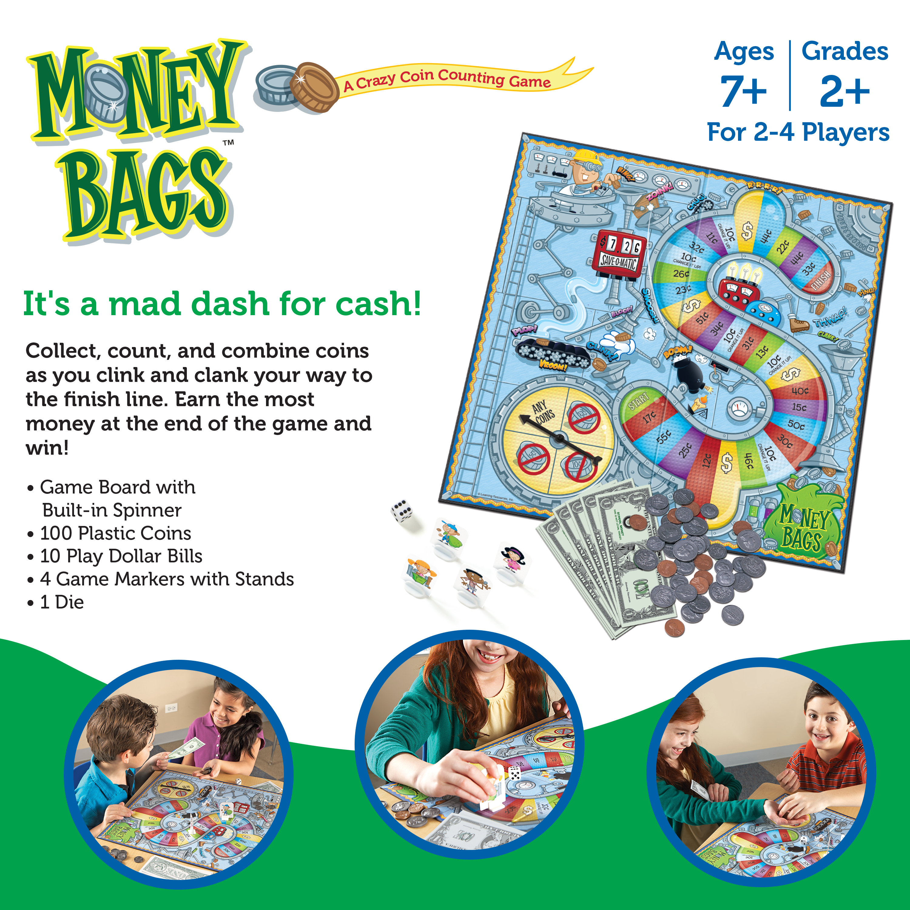 SKU LER5057 Product Title MONEY BAGS BOARD GAME Brand Name Learning Resources UPC 765023013719 Piece Count 102 Min Target Age 7 Max Target Age 11 TargetGradeMax Sixth Grade TargetGradeMin Second Grade ProductCategoryProductLine Math Games ProductCategorySubject Games Port of Exit CNYTN Country of Origin CHN Unit Height 10 Unit Length 1.62 Unit Weight 1.45 Unit Width 10 Long Description - DC Money Bags Coin Value Game Delightful new graphics make our award-winner even better! Valuable money skills are in the bag as students collect, count, and exchange money all the way to the finish line. Includes game board with built-in spinner, 100 plastic coins, play bills, markers, and die. Game board measures 17”L x 17”H. For 2–4 players. Grades 2+ | Ages 7+ CA prop 65 No Case Height 11.5 Case Length 21.1 Case Quantity 12 Case Weight 20.2 CPQ 1.59 Includes Remote No Marble Warning No MSRP 21.99 Small Ball Warning No Small Parts Warning Yes