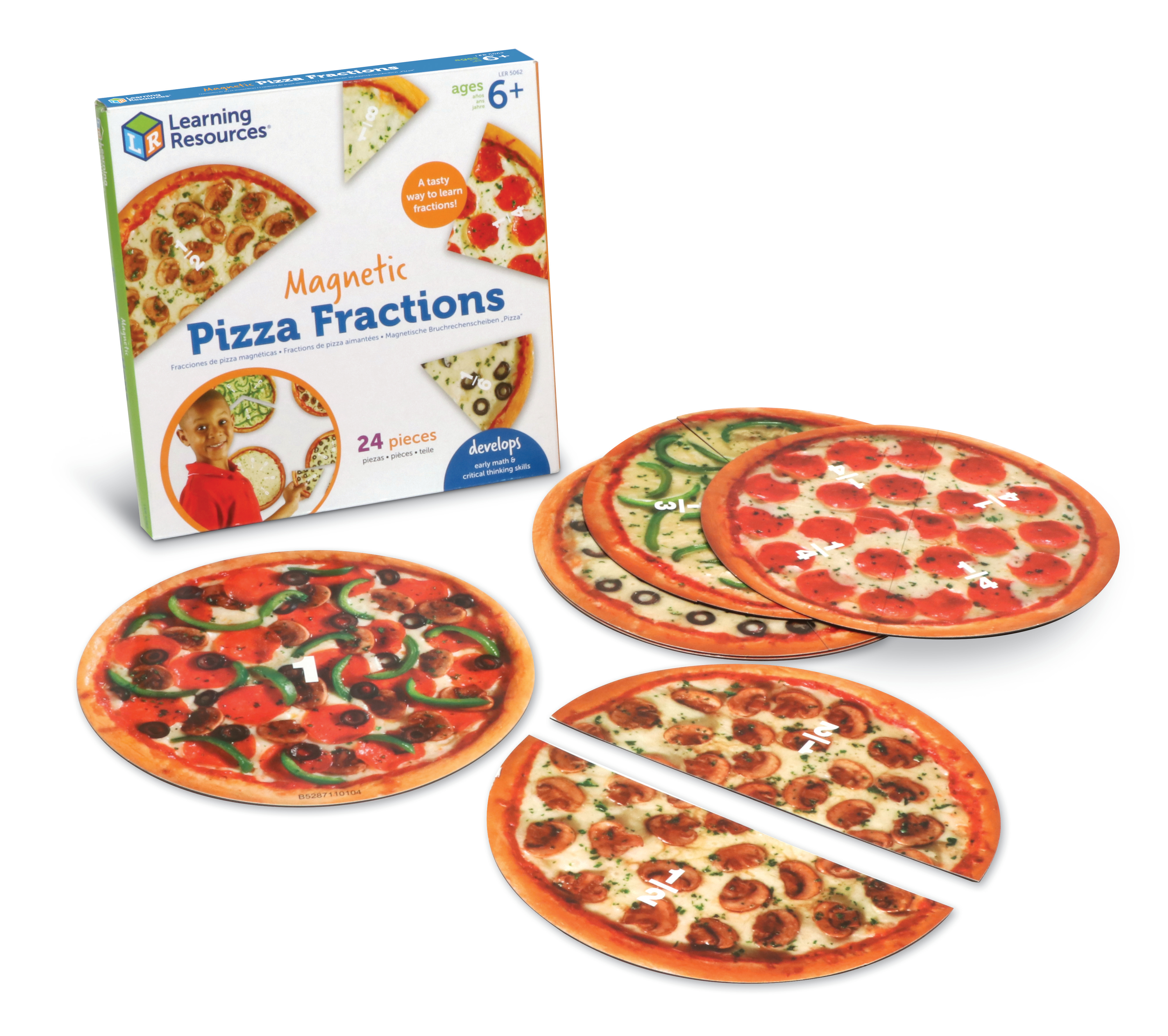 SKU LER5062 Product Title MAGNETIC PIZZA FRACTIONS Brand Name Learning Resources UPC 765023050622 Piece Count 24 Min Target Age 6 Max Target Age 10 TargetGradeMax Fifth Grade TargetGradeMin First Grade ProductCategorySubject Math Port of Exit CNYTN Country of Origin CHN Unit Height 0.9 Unit Length 9.2 Unit Weight 1.6 Unit Width 8.2 Long Description - DC Introduce fractions and other math concepts with these magnet pizzas featuring real-life photography. 6 pizzas totaling 24 pieces represent 1 whole, 1/2, 1/3, 1/4, 1/6 and 1/8 values. Use on the whiteboard or any magnetic surface. Pizzas measure 8" in diameter each and include activity guide. CA prop 65 No Case Height 9.3 Case Length 11.3 Case Quantity 12 Case Weight 19.2 CPQ 0.61 Includes Remote No Marble Warning No MSRP 26.99 Small Ball Warning No Small Parts Warning No