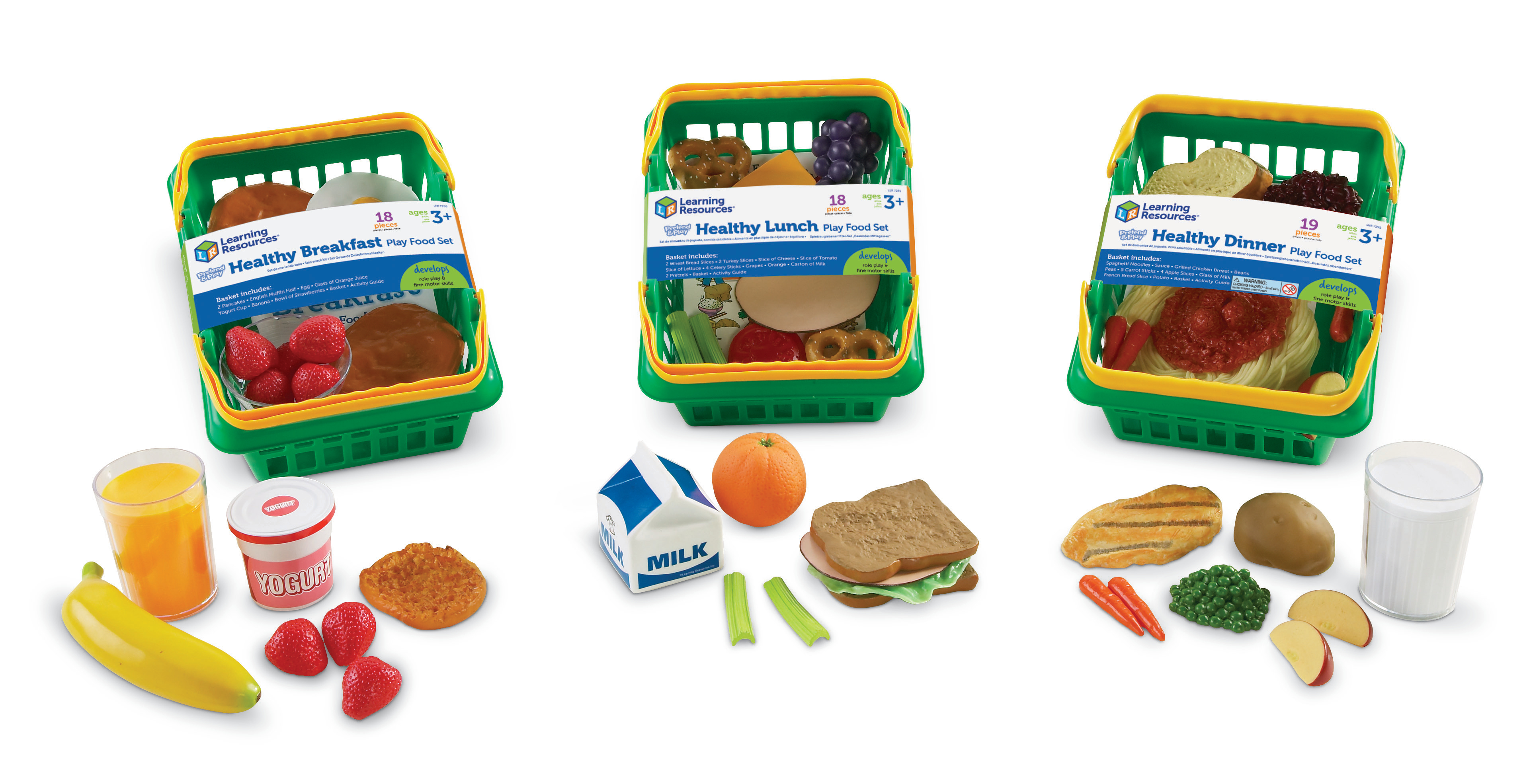 SKU LER5340 Product Title HEALTHY FOODS PLAY SET Brand Name Learning Resources UPC 765023053401 Piece Count 3 Min Target Age 3 Max Target Age 7 TargetGradeMax Second Grade TargetGradeMin Toddler ProductCategoryProductLine Pretend & Play ProductCategorySubject Kitchen & Food Imaginative Play Country of Origin USA Unit Height 14.6 Unit Length 8 Unit Weight 4.35 Unit Width 11 Long Description - DC Give kids a taste of a healthy lifestyle with these baskets full of nutritious meal options. These realistic-looking breakfast, lunch, and dinner sets each feature a sturdy shopping basket and activity guide. All pieces are actual size and wipe clean. CA prop 65 No Case Height 15.8 Case Length 22.2 Case Quantity 4 Case Weight 20 CPQ 3.55 Includes Remote No Marble Warning No MSRP 95.99 Small Ball Warning No Small Parts Warning No