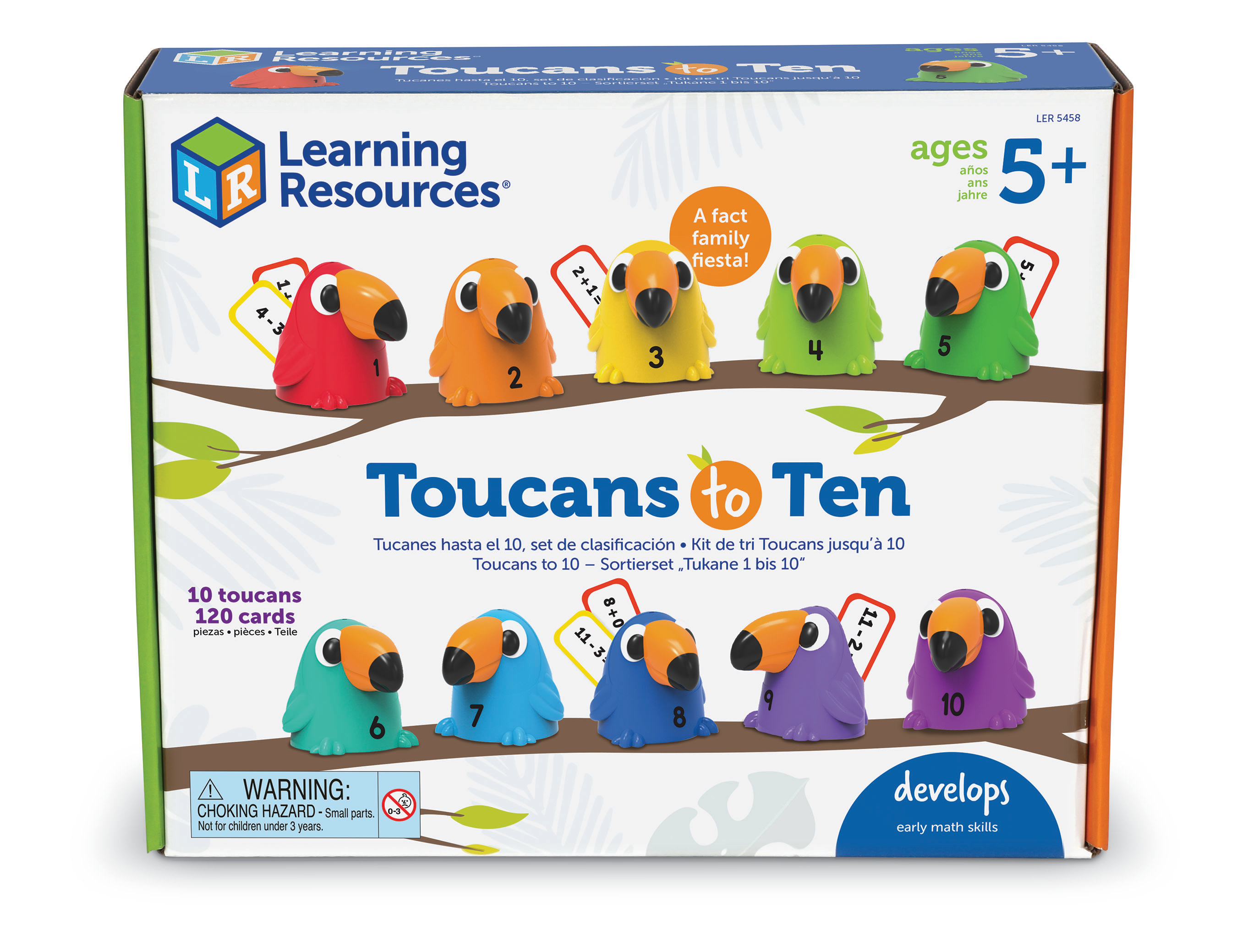 SKU LER5458 Product Title TOUCANS TO TEN Brand Name Learning Resources UPC 765023054583 Piece Count 130 Min Target Age 5 Max Target Age 9 TargetGradeMax Fourth Grade TargetGradeMin Kindergarten ProductCategorySubject Math Port of Exit VNHPH Country of Origin VNM Unit Height 3.1 Unit Length 11.2 Unit Weight 1.5 Unit Width 9 Long Description - DC These tropical toucan toys are ready to make math fun! Learn the fundamentals of fact families with Toucans to 10 from Learning Resources. Numbered 1–10 and cast in 10 vibrant colors, these toucans help students master the fundamentals of addition and subtraction by turning math lessons into an engaging, hands-on game! Just draw a fact card, solve the addition or subtraction equation, and put the card in the toucan with the correct answer! As they play, students will develop a greater understanding of fact families, the sets of math facts created using the same numbers. Quiz the whole class, add a twist to small group activities, or turn at-home study into play time—the counting bird toys of Toucans to 10 are ready for all of your math study needs! Made from durable, wipe-clean plastic, the toucan toys of Toucans to 10 are strong enough to last lesson after lesson, and come with 120 fact cards that keep each play session fresh. CA prop 65 No Case Height 10 Case Length 12.8 Case Quantity 4 Case Weight 6.65 CPQ 0.87 Includes Remote No Marble Warning No MSRP 34.99 Small Ball Warning No Small Parts Warning Yes