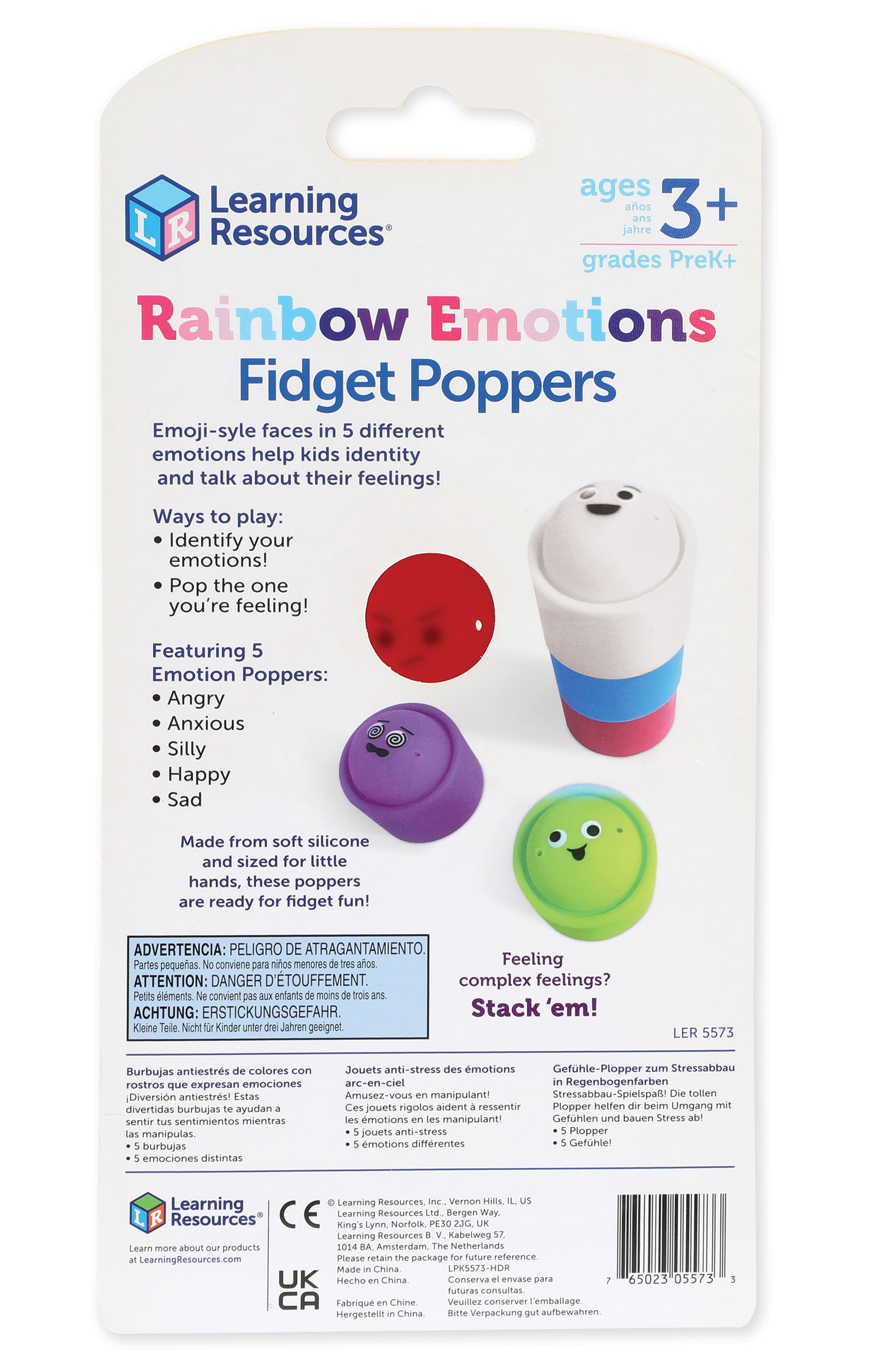 SKU LER5573 Product Title Rainbow Emotion Fidget Poppers Brand Name Learning Resources UPC 765023055733 Piece Count 5 Min Target Age 3 Max Target Age 5 TargetGradeMax Kindergarten TargetGradeMin Pre-K ProductCategorySubject Social-Emotional Learning Port of Exit CNNGB Country of Origin CHN Unit Height 10 Unit Length 1.8 Unit Weight 0.2 Unit Width 5.1 CA prop 65 No Case Height 10.8 Case Length 5.8 Case Quantity 4 Case Weight 1.25 CPQ 0.3 Includes Remote No Marble Warning No MSRP 7.99 Small Ball Warning No Small Parts Warning Yes
