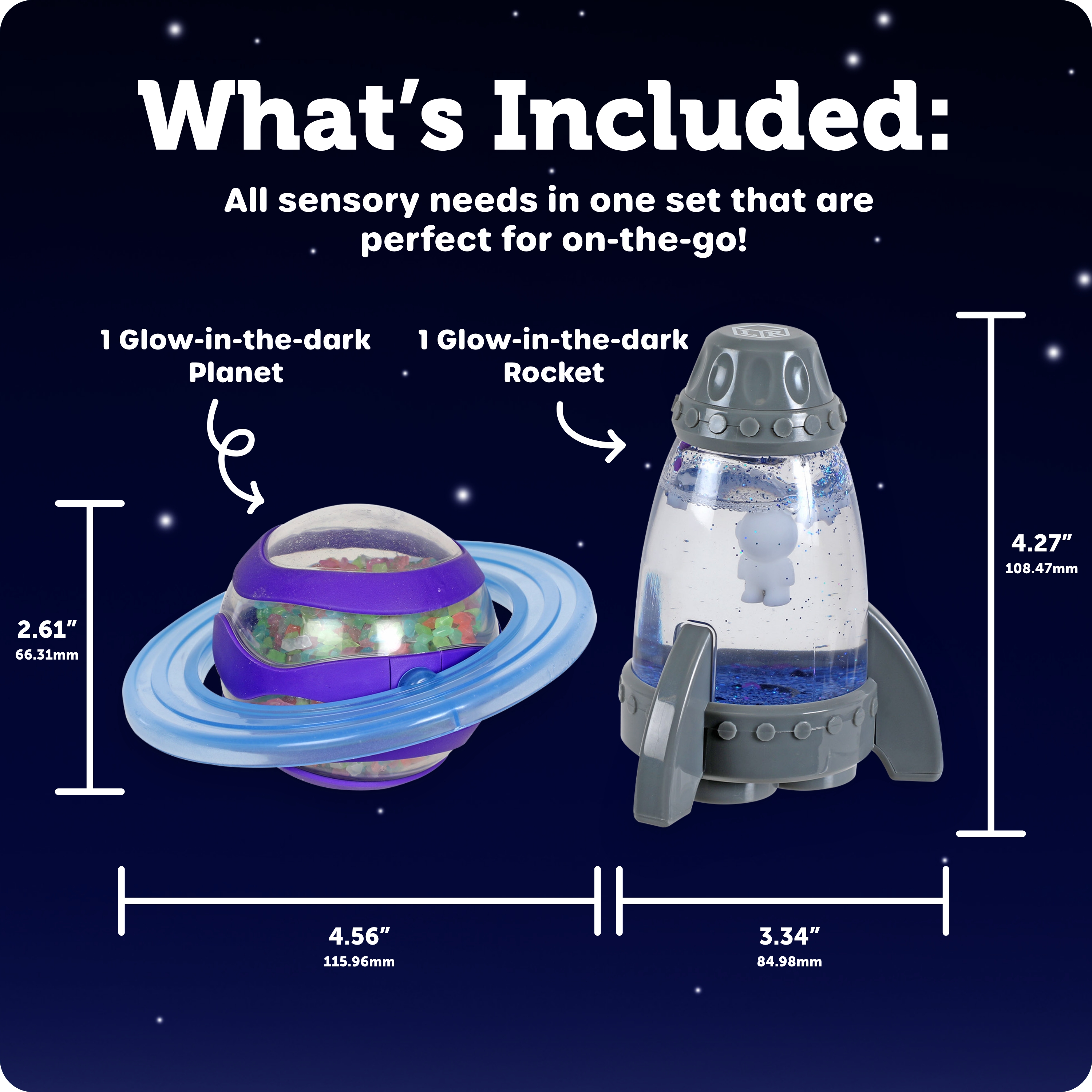 SKU LER5580 Product Title Soothing Space Sensory Fidget Set Brand Name Learning Resources UPC 765023055801 Piece Count 2 Min Target Age 3 Max Target Age 0 TargetGradeMin Pre-K ProductCategorySubject Social-Emotional Learning Port of Exit CNYTN Country of Origin CHN Unit Height 2.4 Unit Length 8.5 Unit Weight 0.85 Unit Width 9.9 Short Description - DC Discover an out-of-this-world way to fidget while building sensory skills! This set of two awesome astro sensory tools comes with multiple ways to fidget—spin the fidgety planet sphere, listen to the moon rocks rattle, and find the hidden alien, or peer through the fidget rocket's glitter to spot the astronaut inside. This set's surprises don't stop there—twist the rocket's top for a fun clicking sound, then turn the lights off and discover glow-in-the-dark elements! These one-piece fidgets are ready for on-the-go play. Age 3+ | Grade PreK+ Long Description - DC Discover an out-of-this-world way to fidget while building sensory skills! This set of two awesome astro sensory tools comes with multiple ways to fidget—spin the fidgety planet sphere, listen to the moon rocks rattle, and find the hidden alien, or peer through the fidget rocket's glitter to spot the astronaut inside. This set's surprises don't stop there—twist the rocket's top for a fun clicking sound, then turn the lights off and discover glow-in-the-dark elements! These one-piece fidgets are ready for on-the-go play. Age 3+ | Grade PreK+ CA prop 65 No Case Height 9.8 Case Length 10.9 Case Quantity 6 Case Weight 6.1 CPQ 1.12 Includes Remote No Marble Warning No MSRP 17.99 Small Ball Warning No Small Parts Warning No