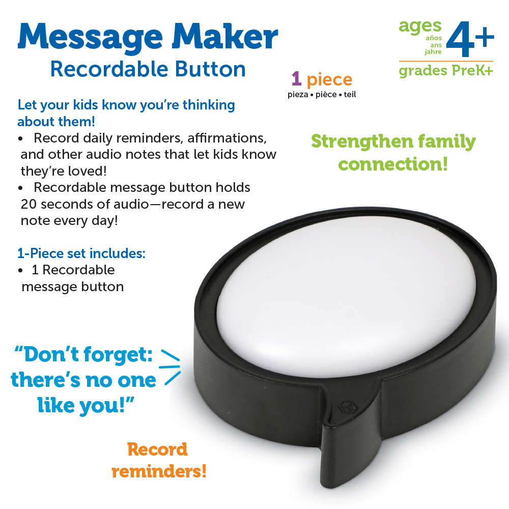 SKU LER5583 Product Title Message Maker Recordable Button, Speech Bubble Brand Name Learning Resources UPC 765023055832 Piece Count 1 Min Target Age 4 Max Target Age 99 TargetGradeMax Adult TargetGradeMin Pre-K ProductCategorySubject Social-Emotional Learning Port of Exit CNYTN Country of Origin CHN Unit Height 8 Unit Length 0.1 Unit Weight 0.25 Unit Width 6 Short Description - DC Add some audio to your everyday notes! Let your kids know you’re thinking about them every time they press the button and hear your voice on the Message Maker Recordable Button, a social-emotional learning toy from Learning Resources. These friendly recordable buttons come with 20 seconds of recording time—record a daily joke, send kids off with a sweet affirmation, or share an important reminder. You can even turn your messages into a social-emotional learning game! With an easy step-by-step recording guide, you’ll be recording and rerecording daily messages in no time! Each Message Maker Recordable button is made from durable plastic—mount them on the wall, or send them with your kids for on-the-go affirmations. Plus, choose from two cool shapes—there's a classic speech button, or a shades-wearing sun! Long Description - DC Add some audio to your notes! These friendly recordable buttons come with 20 seconds of recording time—record a daily joke, send kids off with a sweet affirmation, or share an important reminder. Choose from two cool shapes—there’s a classic speech button, or a shades-wearing sun! Includes mounting hole on reverse for wall hanging. Batteries Needed No Battery Count 2 Battery Material Alkaline Battery Type AAA CA prop 65 No Case Height 9.1 Case Length 10.3 Case Quantity 12 Case Weight 3.45 CPQ 0.55 Includes Remote No Marble Warning No MSRP 10.99 Power Source Batteries Small Ball Warning No Small Parts Warning Yes